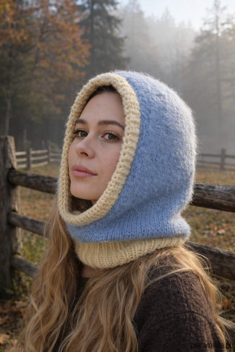 Krój: Przylegający do głowy, doskonale chroni przed wiatrem i mrozem, zastępując czapkę i szalik.
