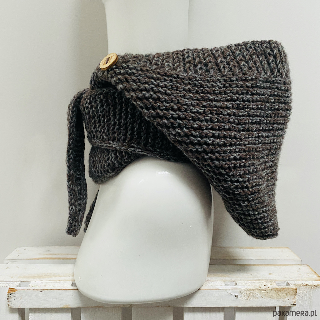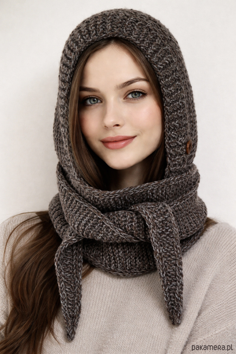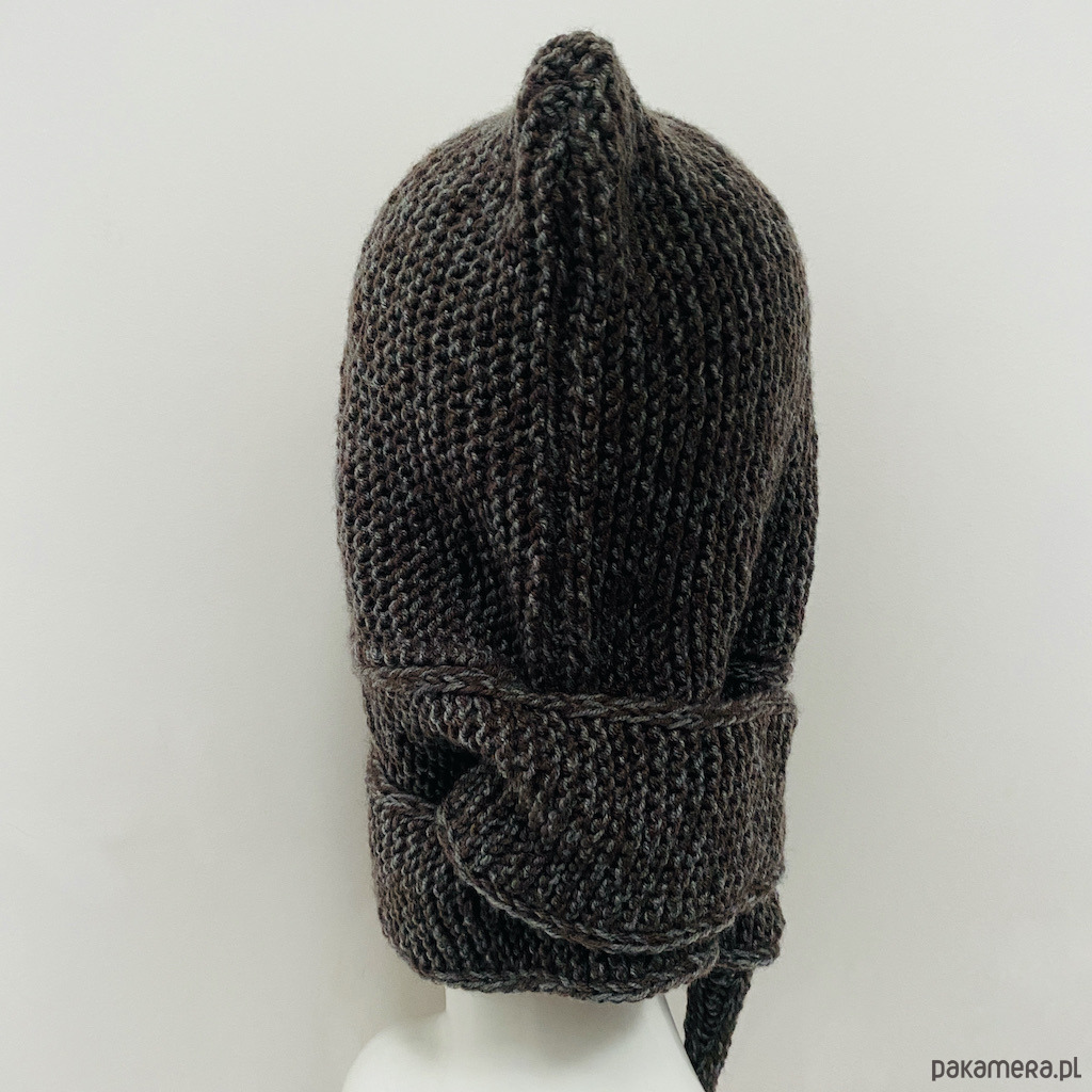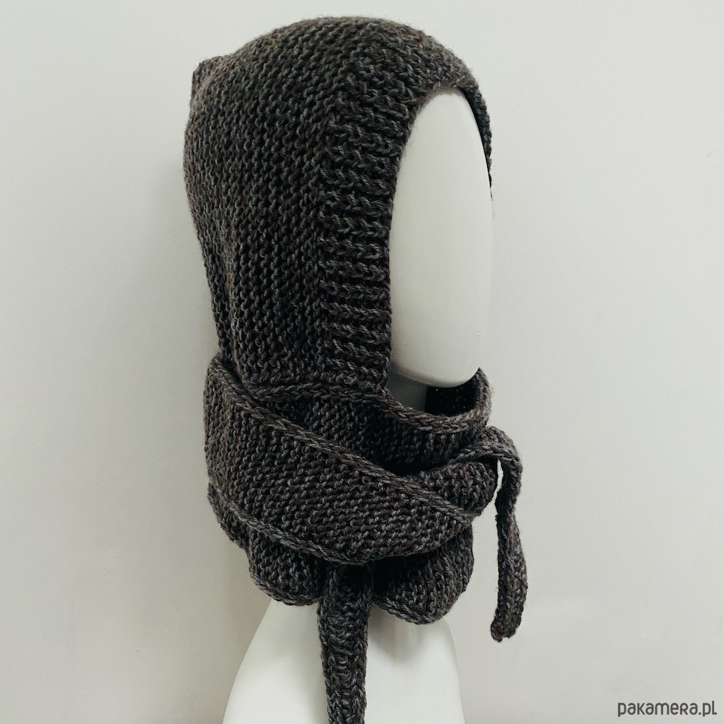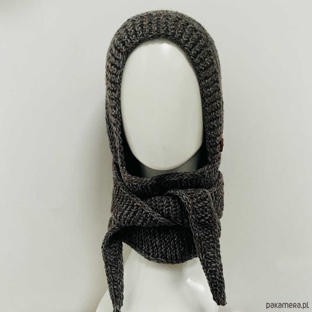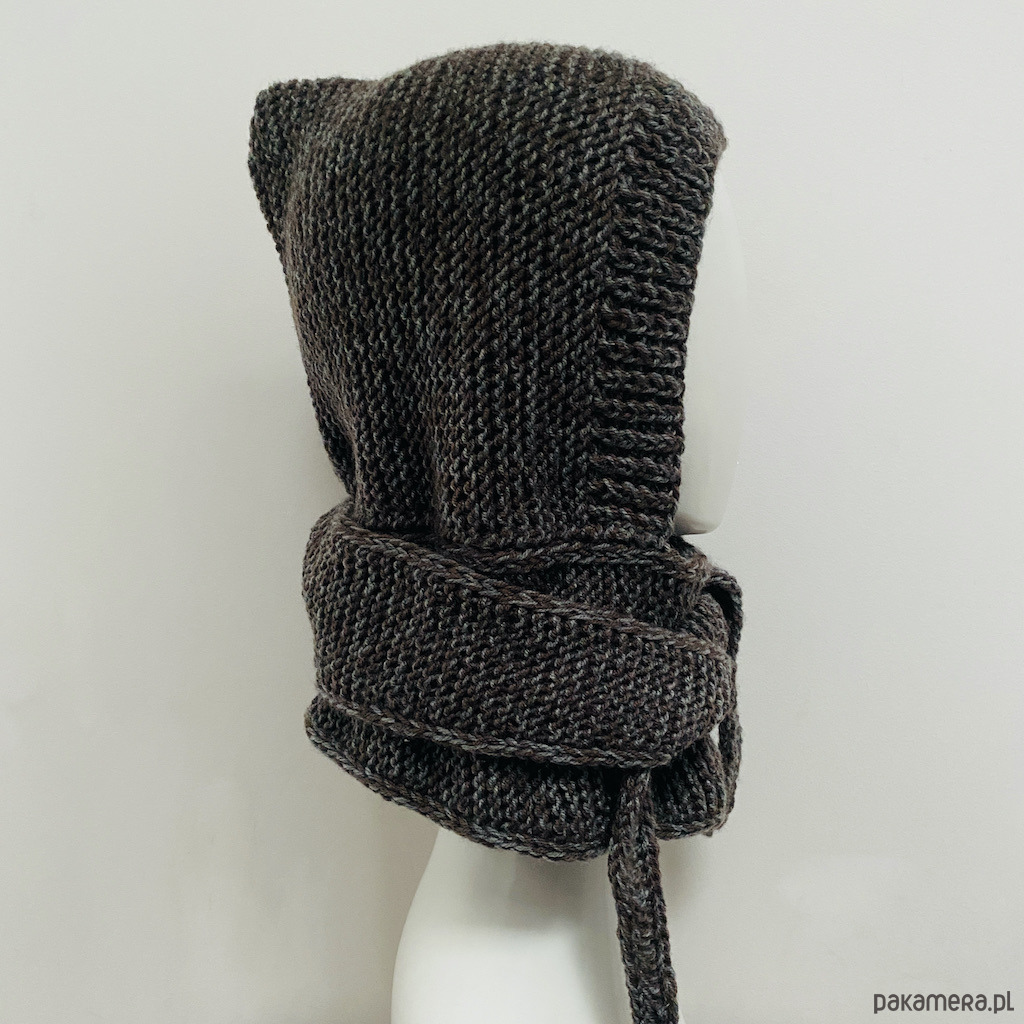 Kaptur wykonałam ręcznie na drutach z polskiej włóczki akrylowej, składającej się z dwóch nitek: pierwsza w kolorze ciemnego brązu, druga szarego. Delikatna struktura dzianiny dopasowuje się do kształtu głowy, zapewniając komfort noszenia bez uczucia ucisku.