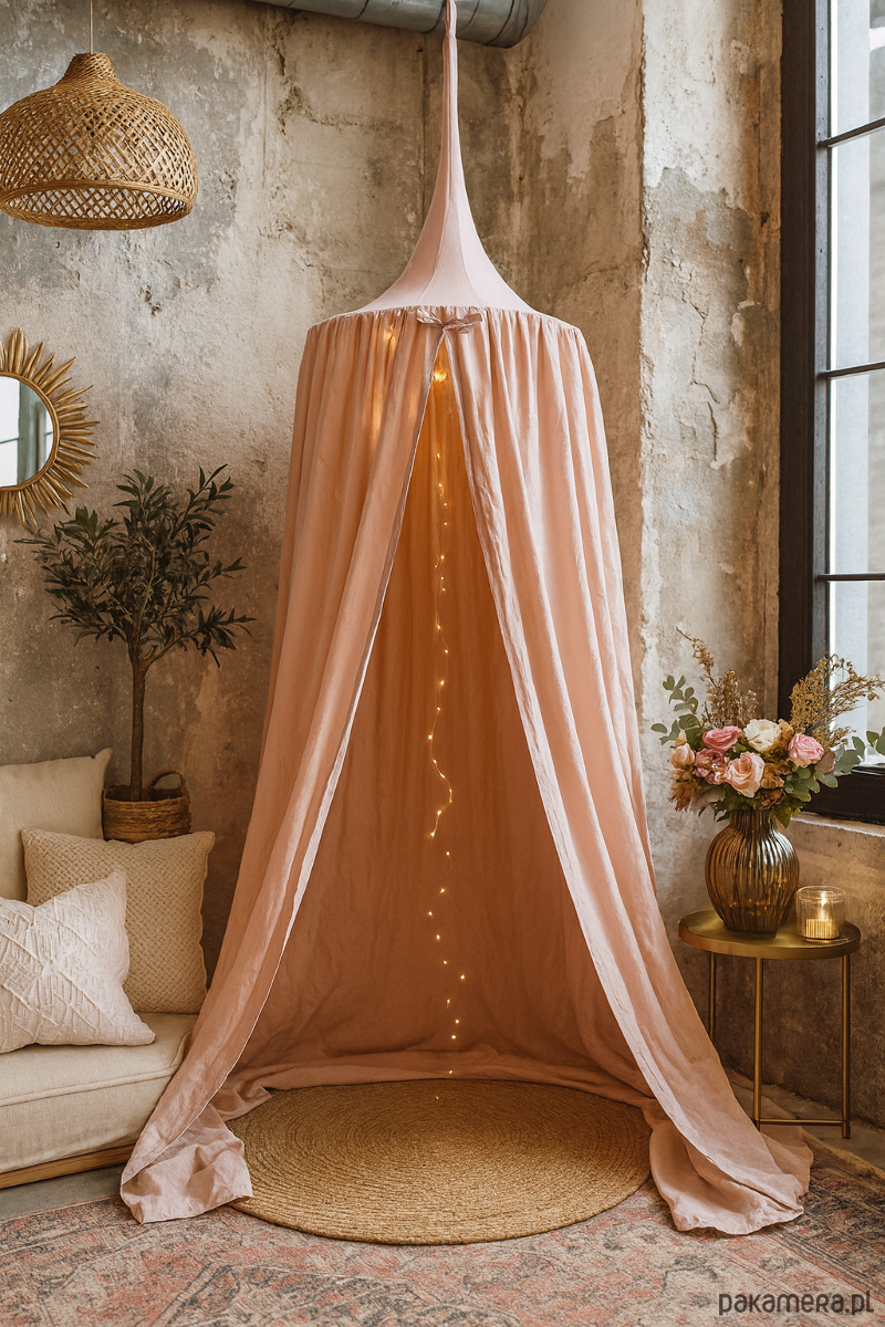 Wprowadź do pokoju dziecka odrobinę magii, spokoju i przytulności. Ten baldachim w pudrowym różu tworzy wyjątkową przestrzeń – mały azyl, w którym dziecko czuje się bezpiecznie, otulone miękką tkaniną i łagodnymi kolorami.