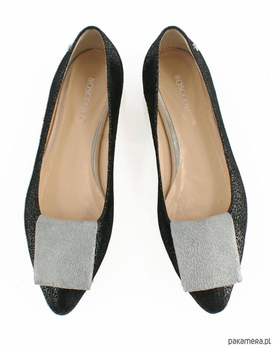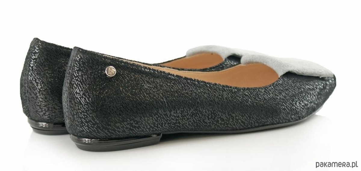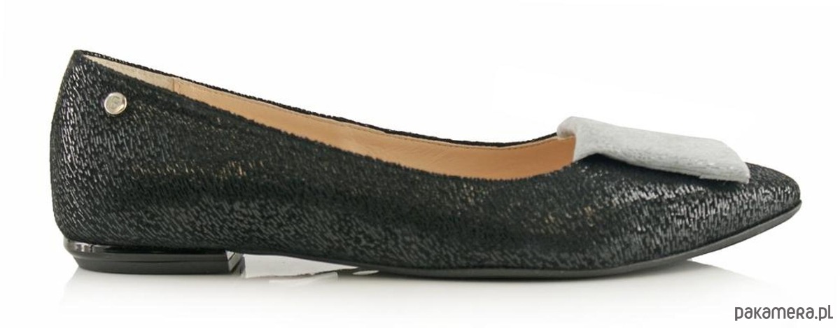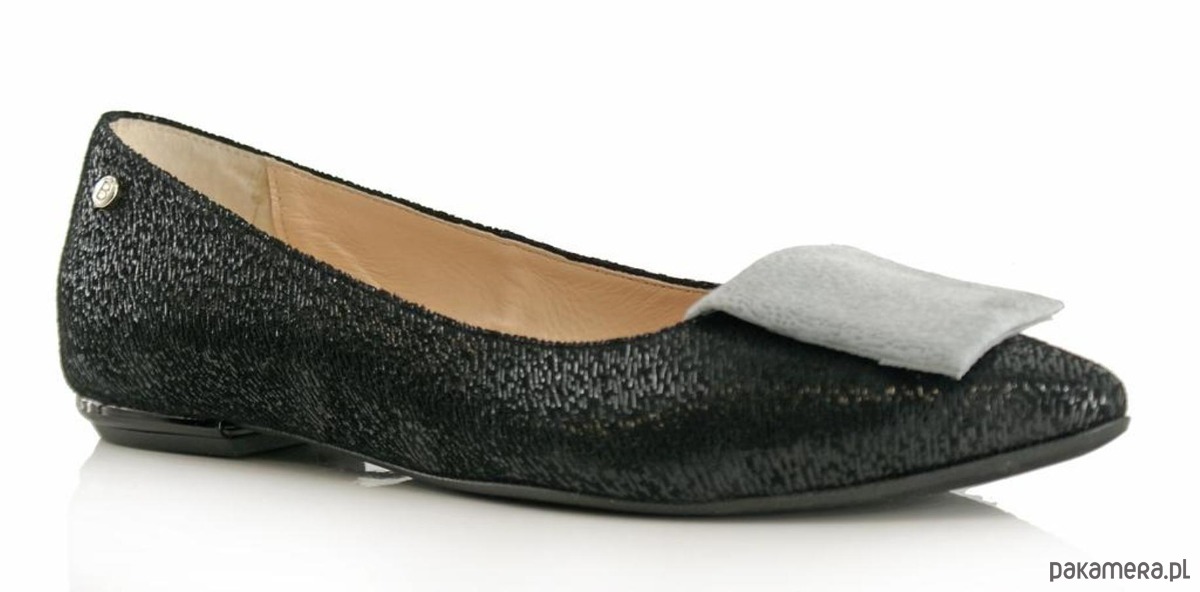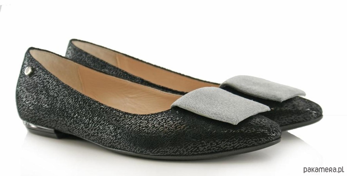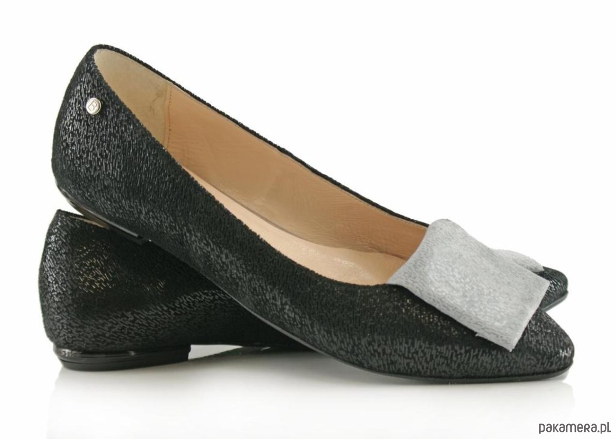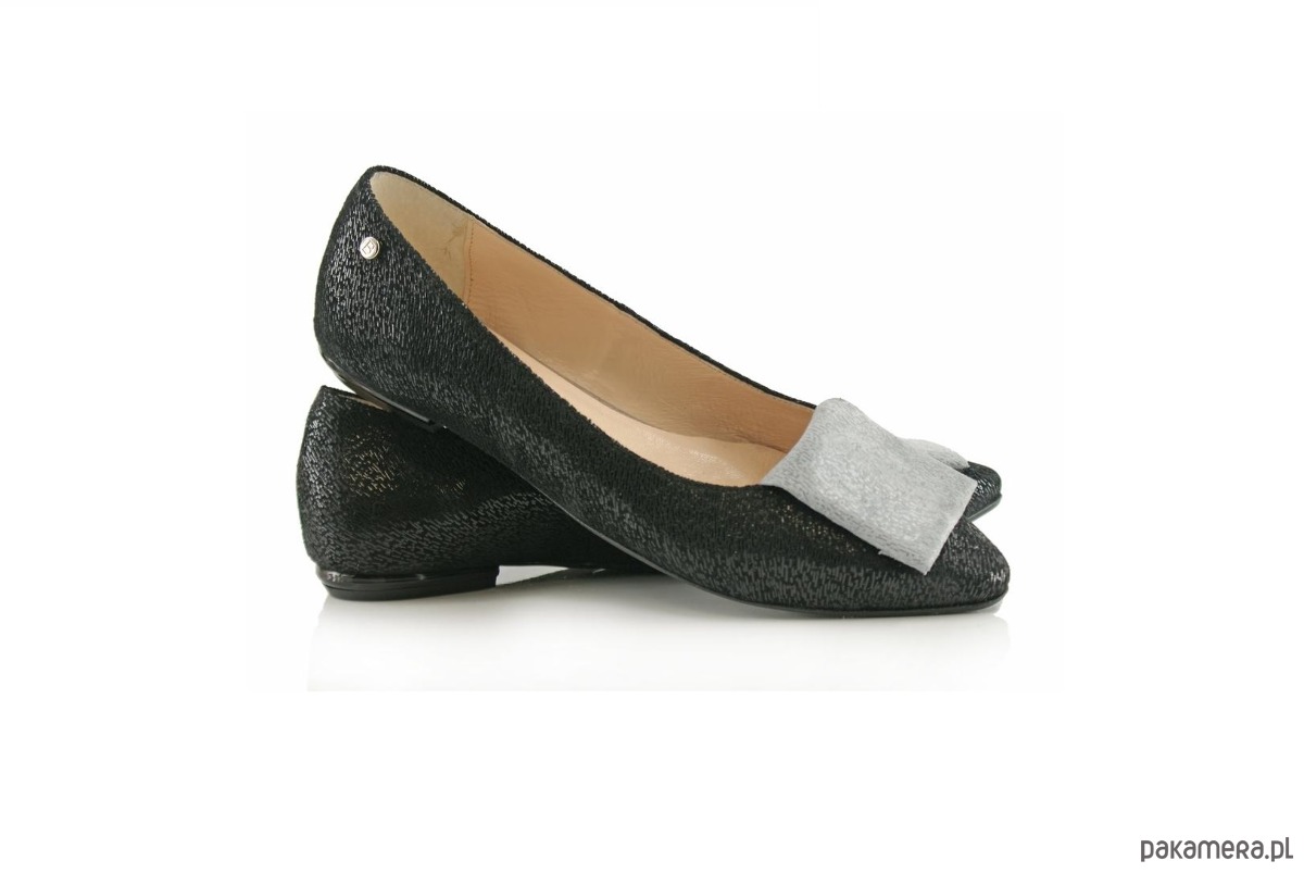 Eleganckie buty damskie z rodzaju balerin, wykonane ze skóry naturalnej, ozdobna poduszka na przodzie.