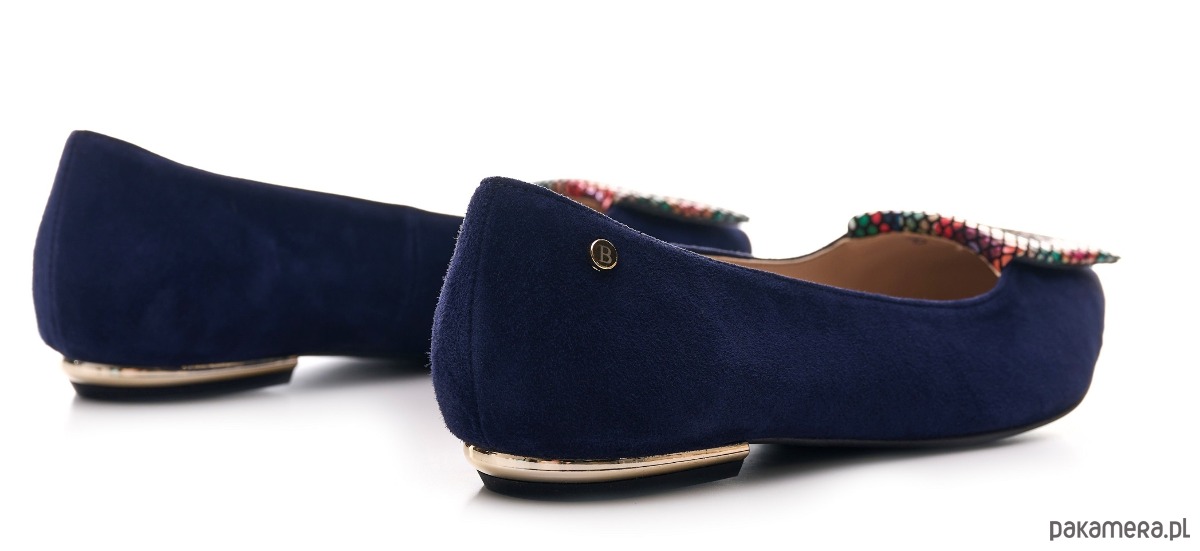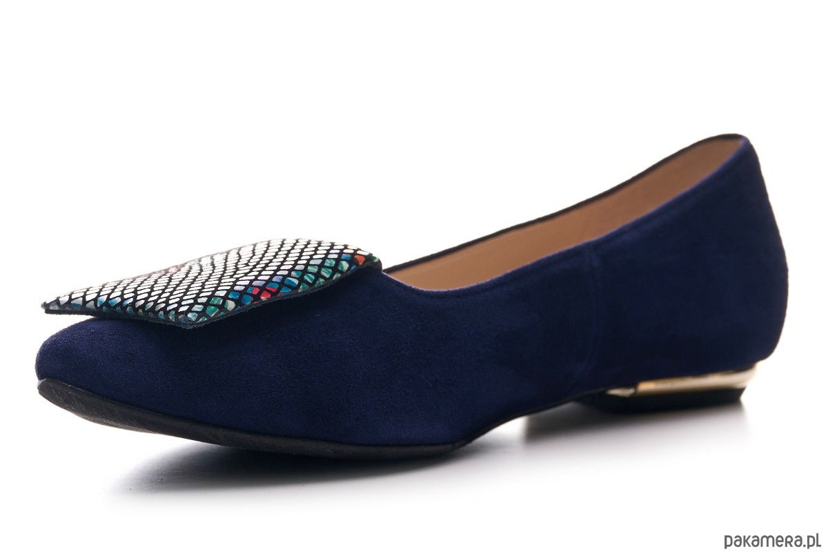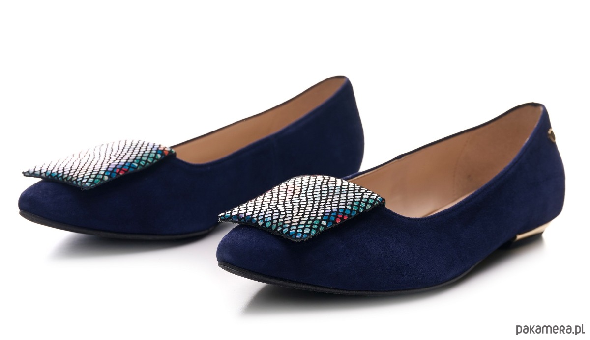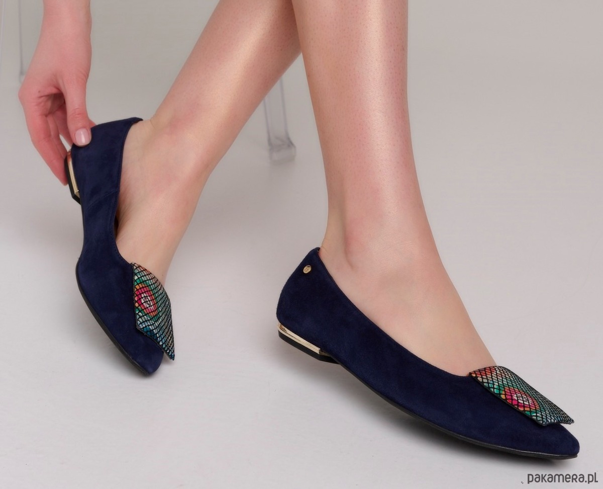 Eleganckie buty damskie z rodzaju balerin, wykonane ze skóry naturalnej, zamszowej z ozdobną poduszeczką na przodzie.