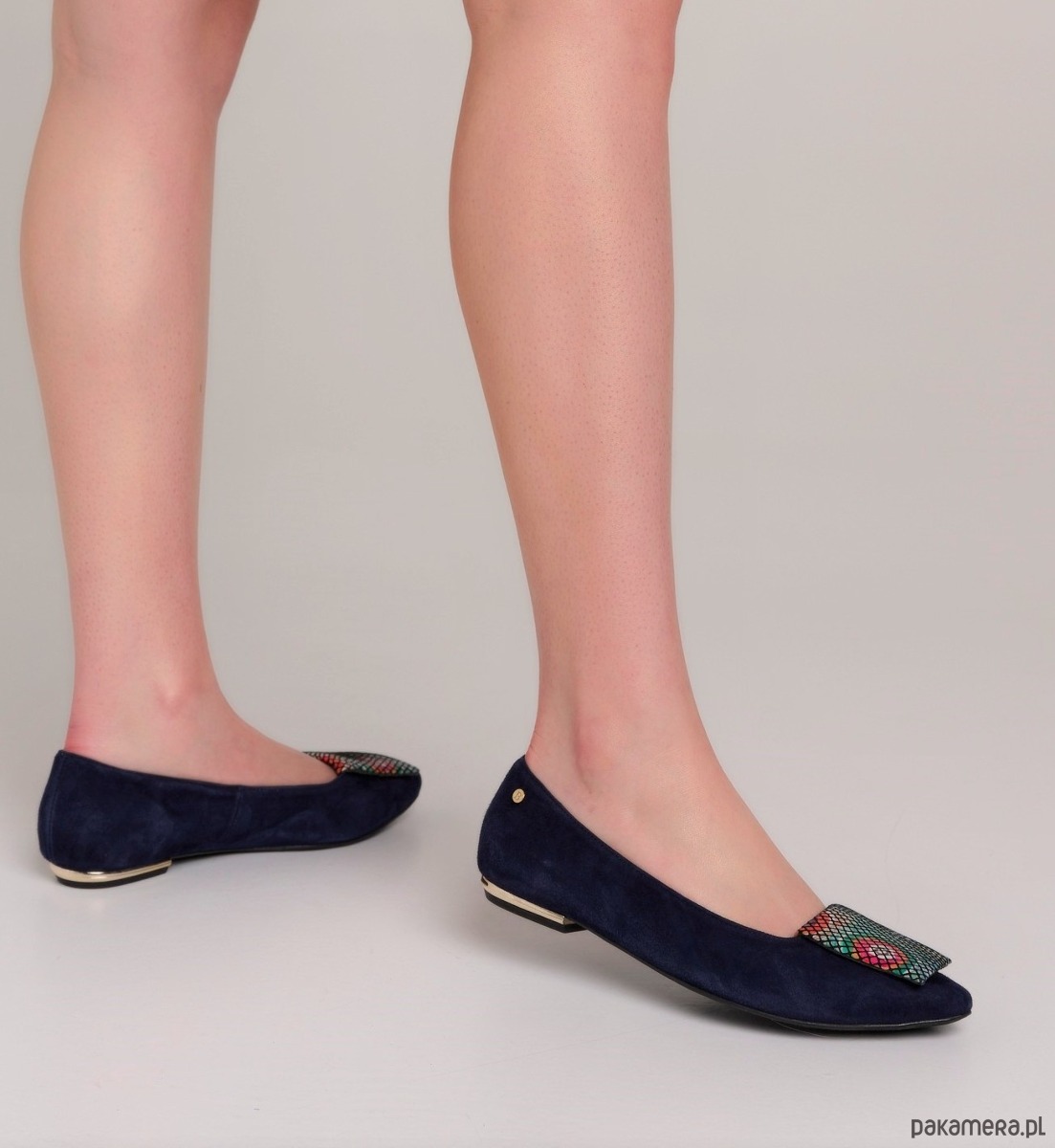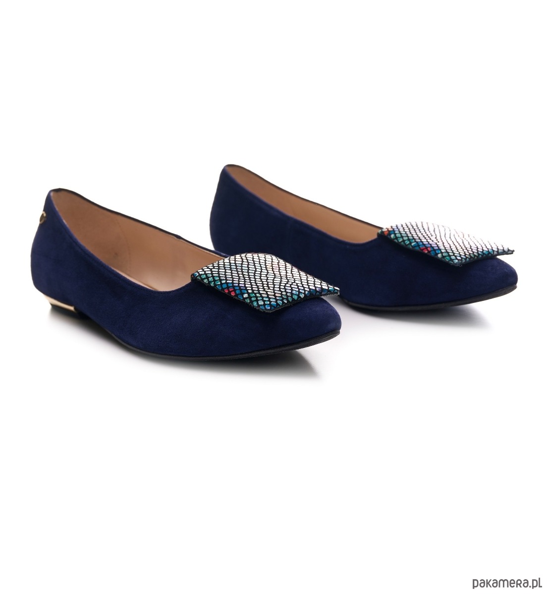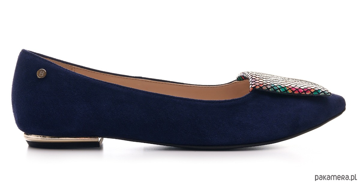 Eleganckie buty damskie z rodzaju balerin, wykonane ze skóry naturalnej, zamszowej z ozdobną poduszeczką na przodzie.