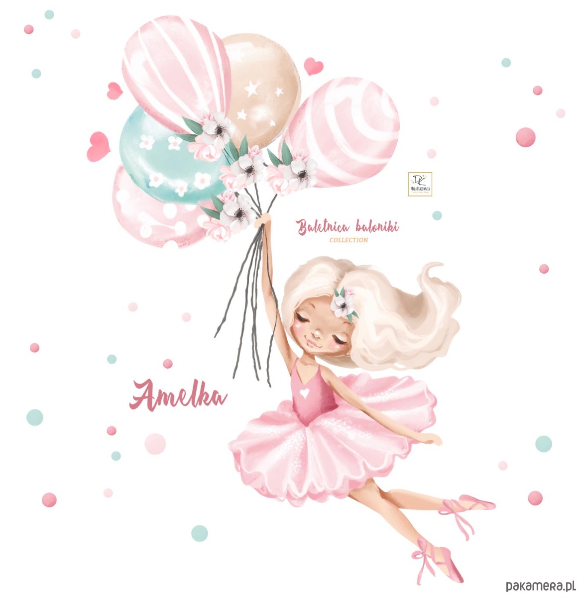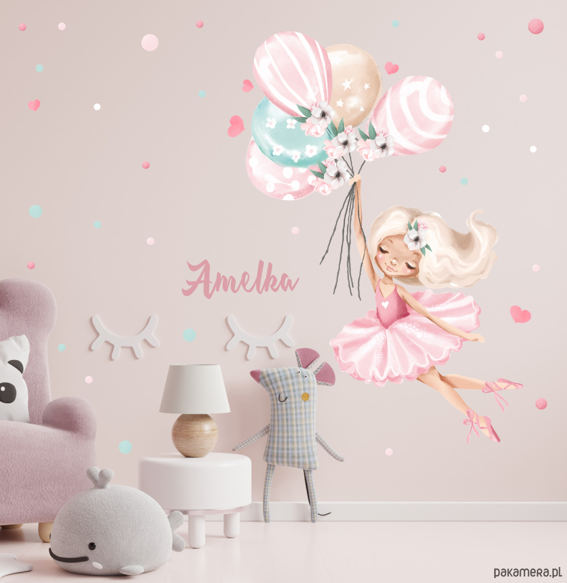 Baletnica, pastelowe baloniki, serca, kropki imię dziecka | Naklejka na ścianę