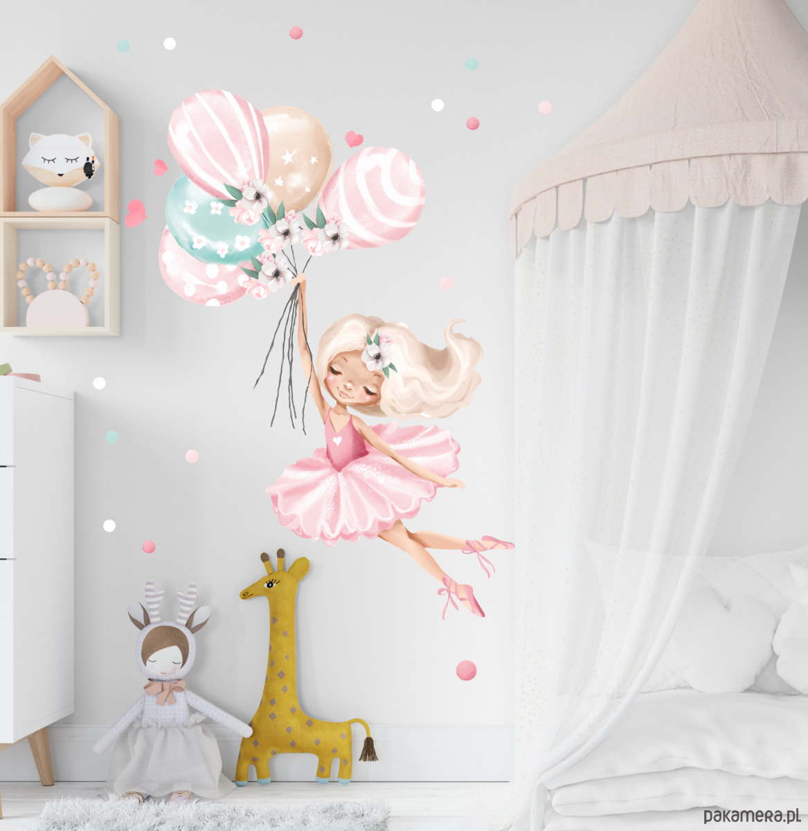 Baletnica, pastelowe baloniki, serca, kropki Naklejka na ścianę