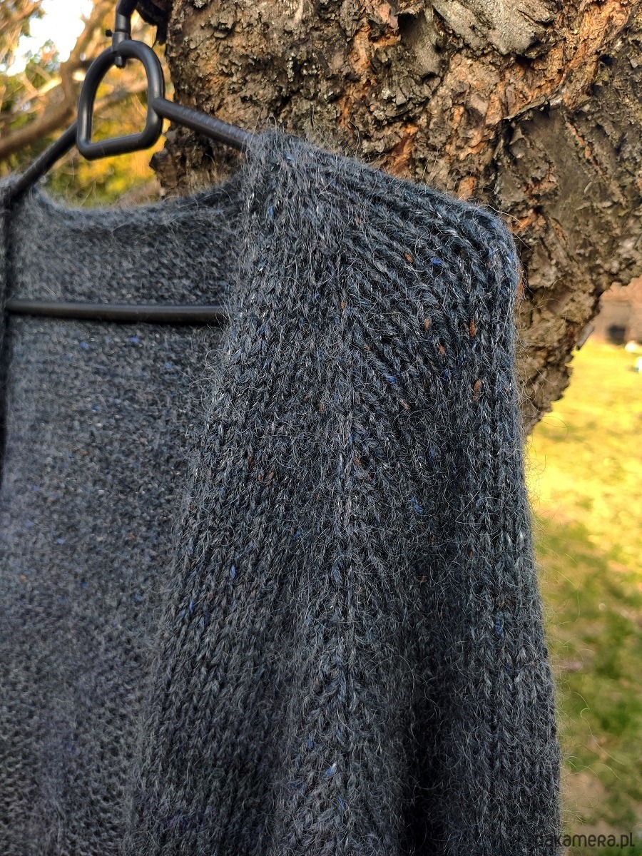 Prosty, lekko oversizowy sweter z szerokimi, delikatnie zwężonymi rękawami przy nadgarstkach. Rękawy "wzbogacone" fantazyjną włóczką z maleńkimi, dyskretnie połyskującymi cekinami.