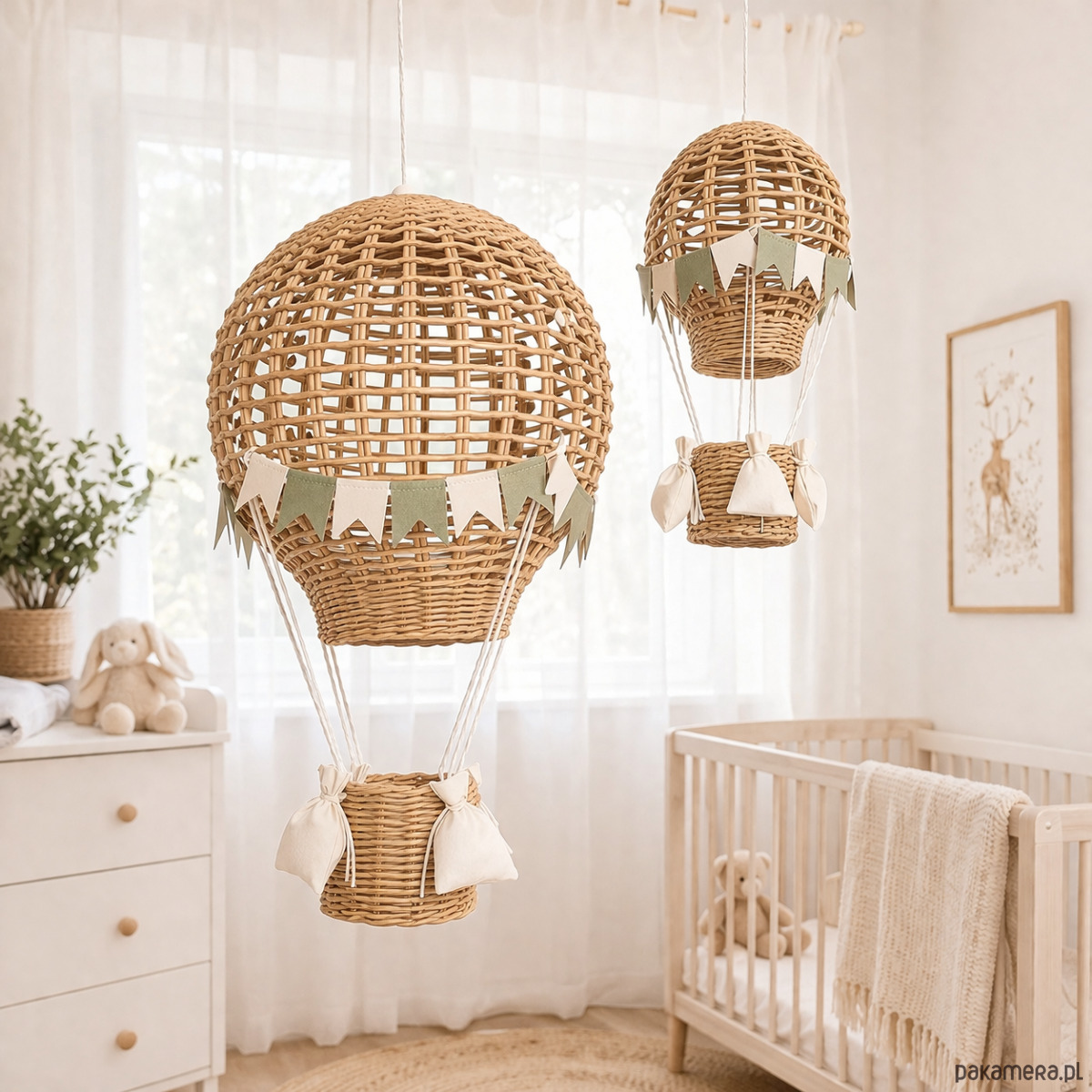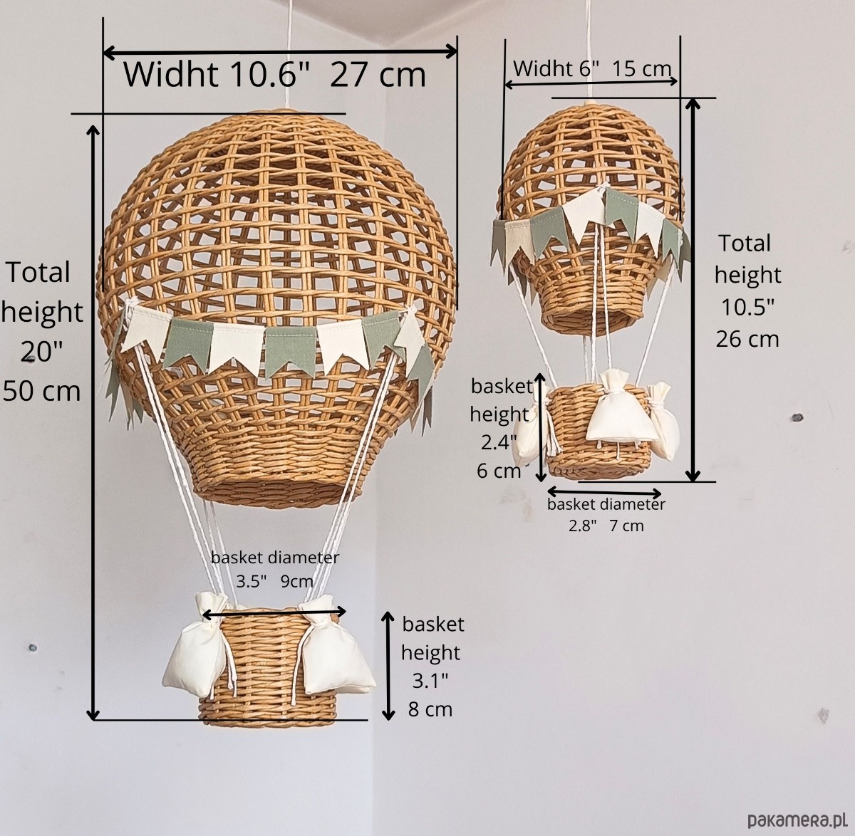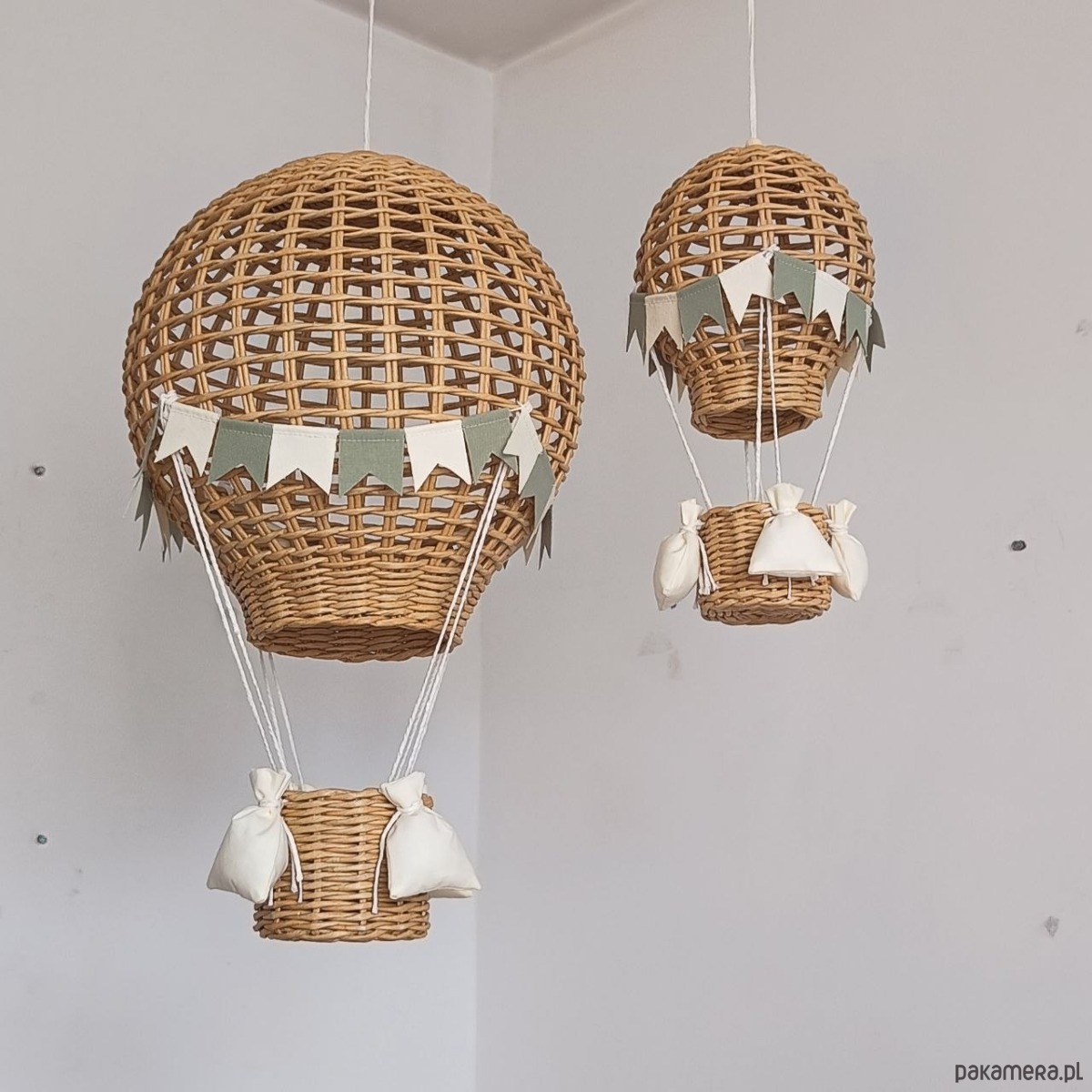 Każdy balon został starannie wykonany ręcznie z papierowej wikliny, co nadaje mu naturalny charakter i subtelną, lekką formę. Idealnie sprawdzi się jako dekoracja nad łóżeczkiem, w kąciku zabaw lub przy oknie.