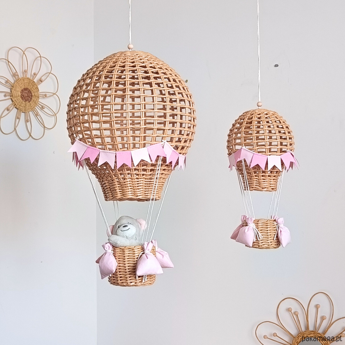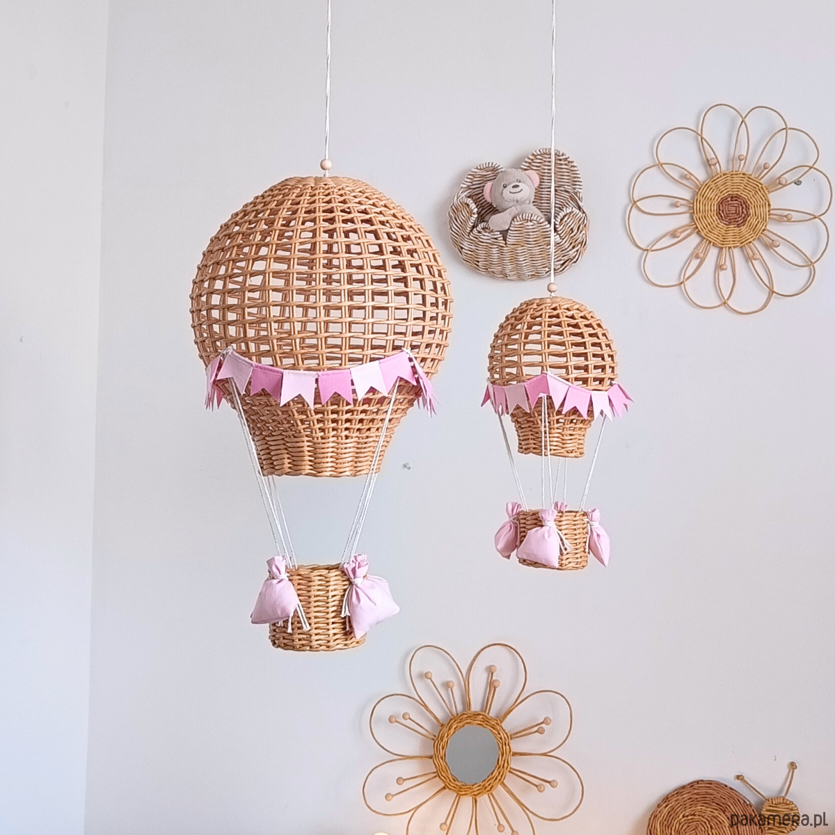 Każdy balon został ręcznie wykonany z wikliny papierowej, co nadaje mu lekkości i naturalnego uroku. Idealnie sprawdzi się jako dekoracja nad łóżeczkiem, półką lub w kąciku zabaw.