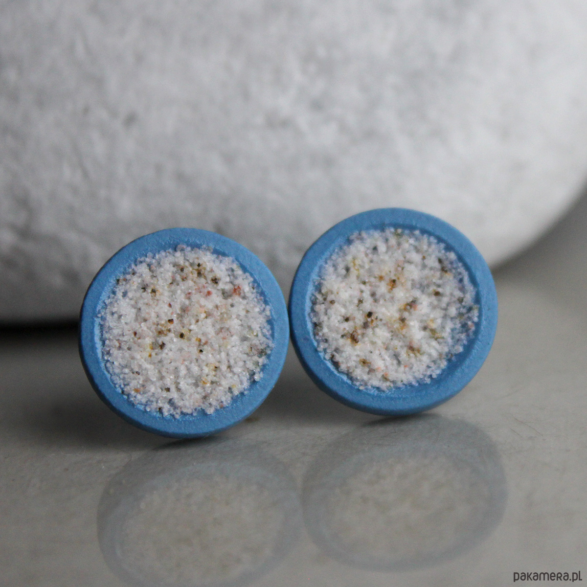 Efektowne nieregularne kolczyki w formie sztyftów, ręcznie wykonane z delikatnej porcelany, pokryte morskim piaskiem z plaż Helu, utrwalonym autorską techniką w wysokiej temperaturze, na antyalergicznych sztyftach w kolorze srebrnym. średnica elementu ceramicznego ok. 15mm, grubość około 4mm.