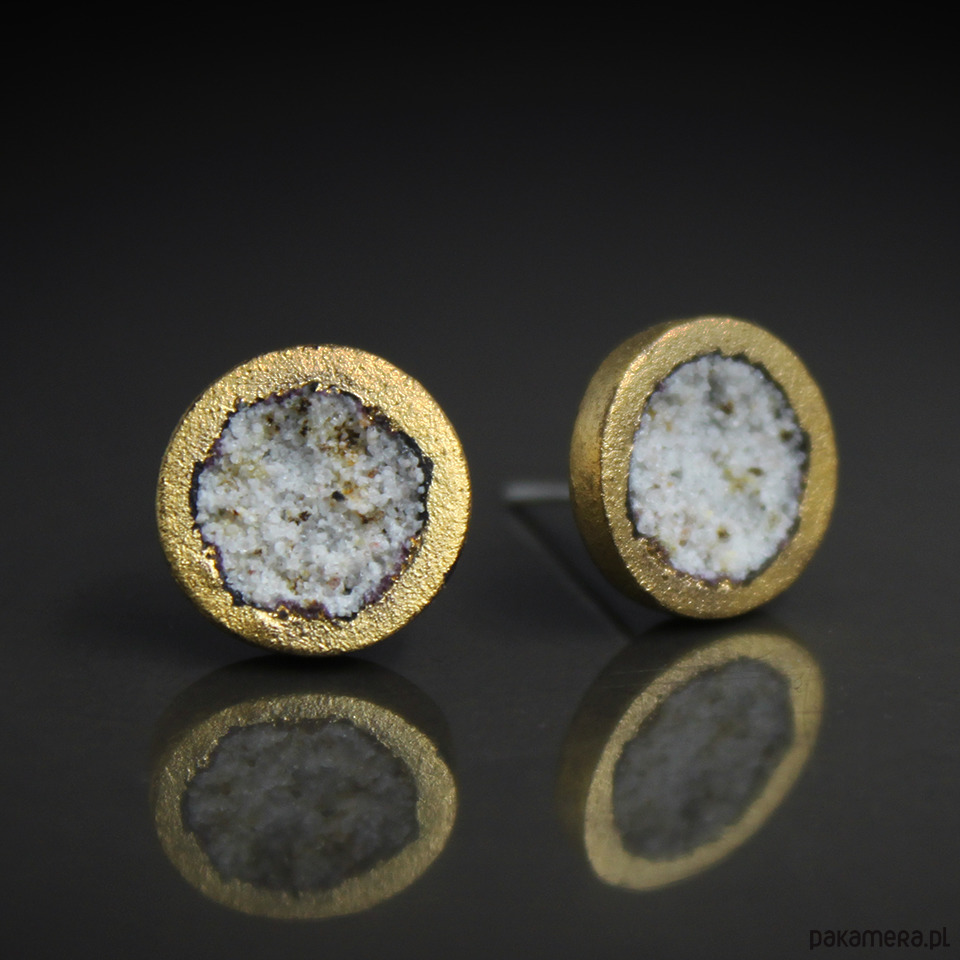Efektowne nieregularne kolczyki w formie sztyftów, ręcznie wykonane z delikatnej porcelany, pokryte morskim piaskiem z plaż Helu, utrwalonym autorską techniką w wysokiej temperaturze, na antyalergicznych sztyftach w kolorze srebrnym. średnica elementu ceramicznego ok. 11mm, grubość około 4mm, pokryte złotem naszkliwnym