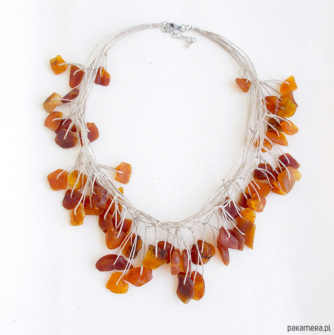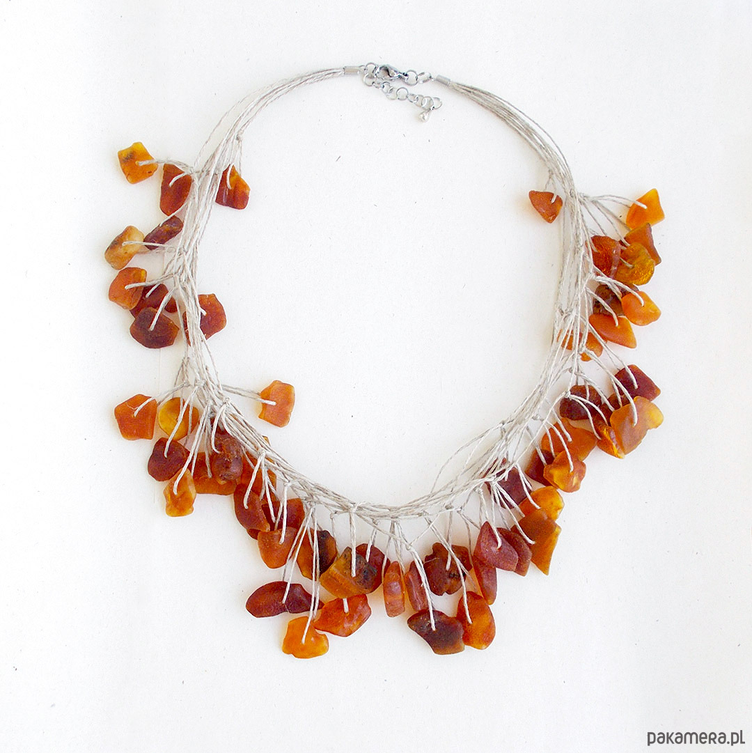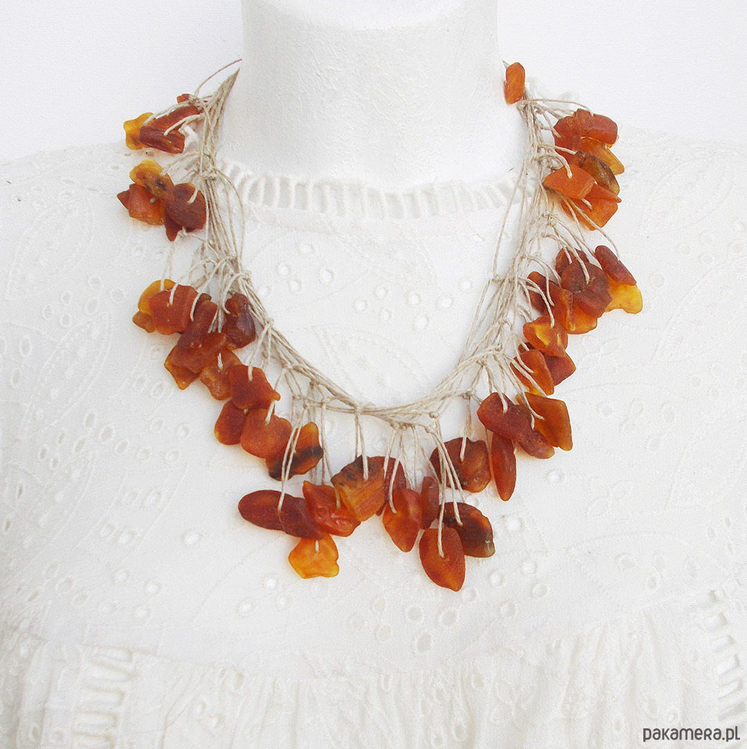 Oryginalny naszyjnik z surowym bursztynem na bazie naturalnego lnu