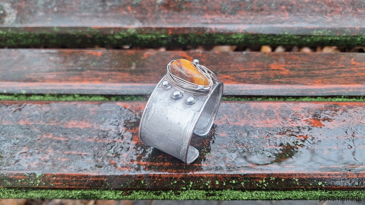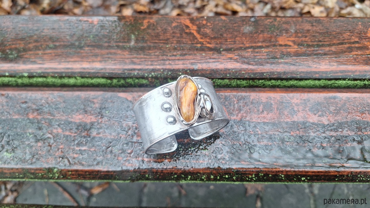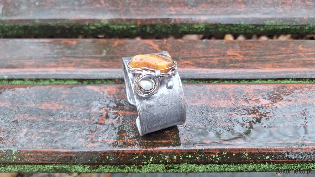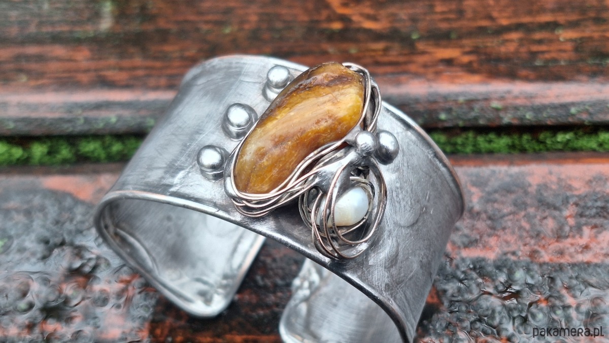 Lekka bransoleta wykonana z miedzi, cyny, perły i bursztynu. Szerokość ok. 3 cm; regulowana.
