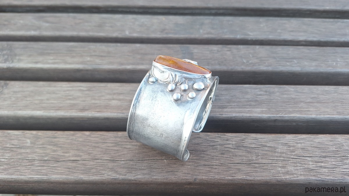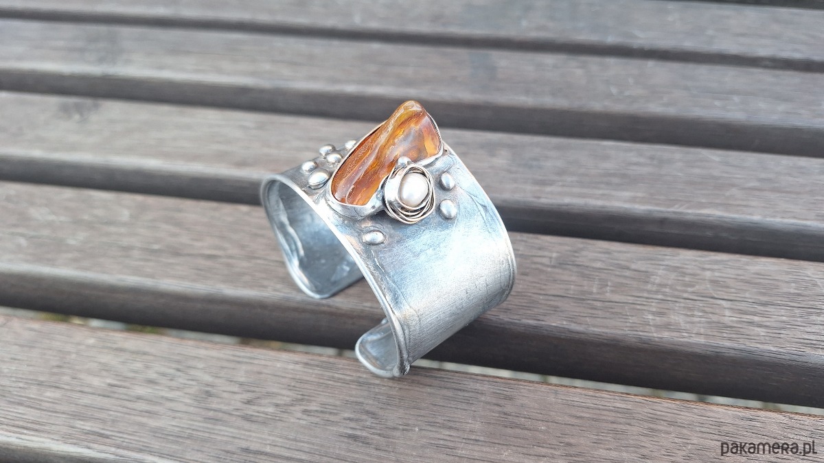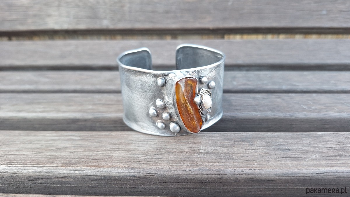 Lekka bransoleta wykonana z miedzi, cyny, perły i bursztynu. Szerokość ok. 4 cm; regulowana.