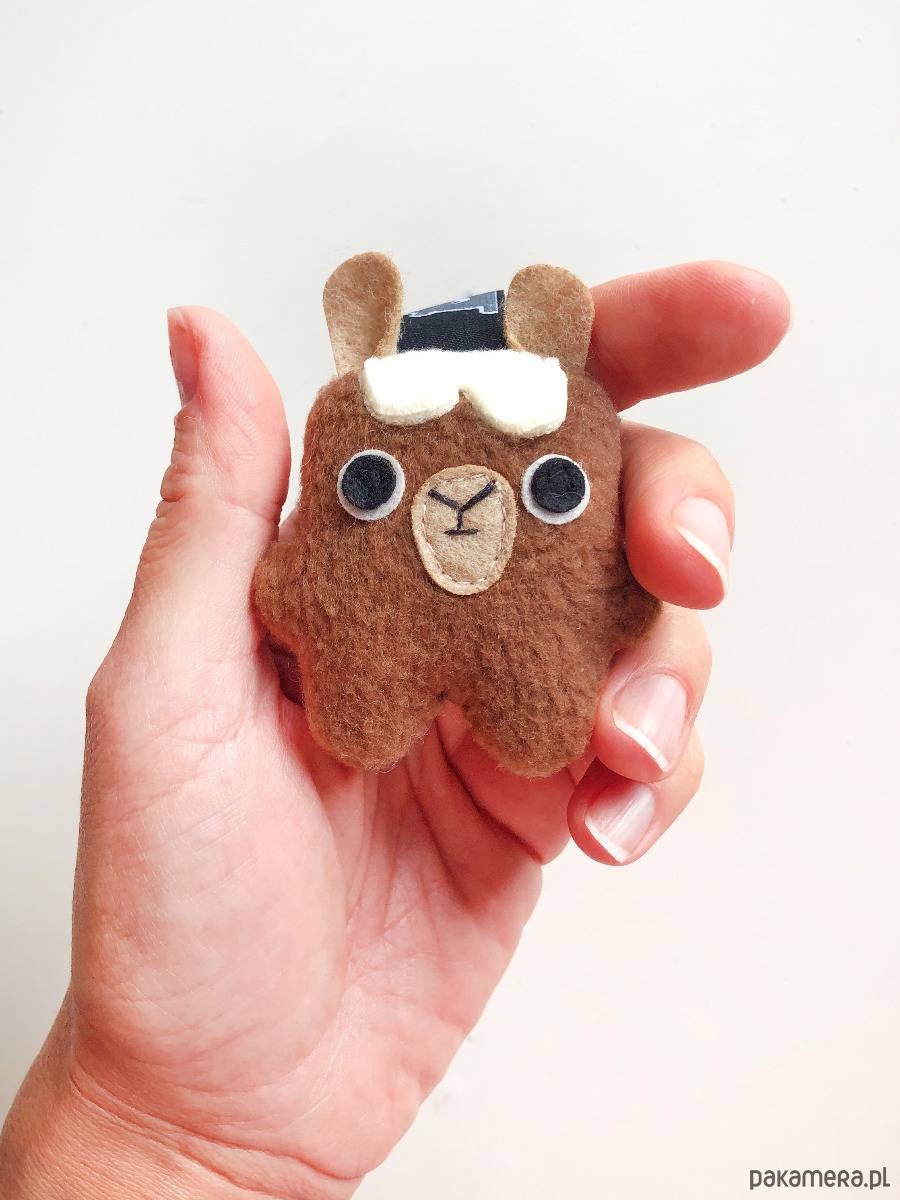 Ma zawieszkę z bambakowej taśmy i metalowego zapięcia, więc może wszędzie z Wami podróżować przy torbie czy plecaku, lub pilnować Waszych kluczy. Wskazane również noszenie w kieszeni, bo świetnie sprawdza się jako skryty pocieszyciel!