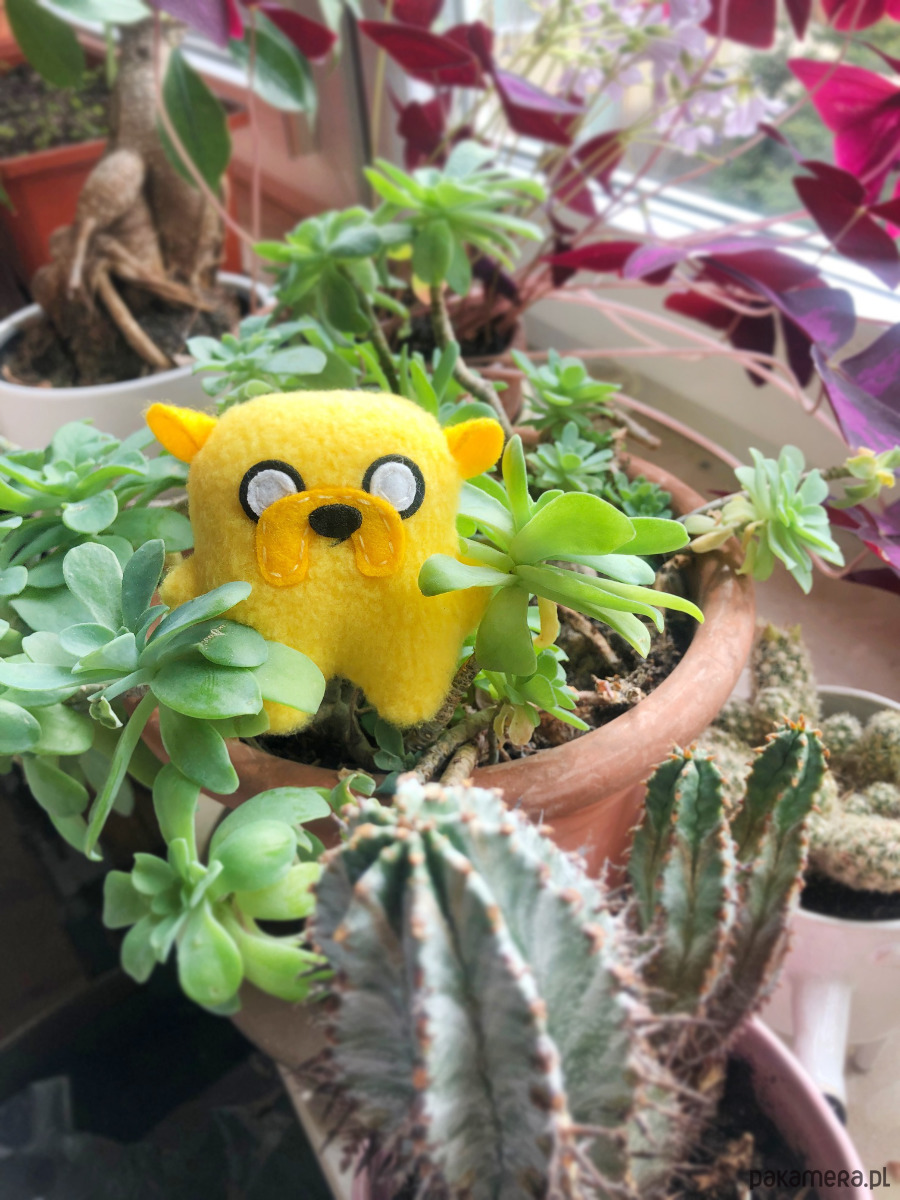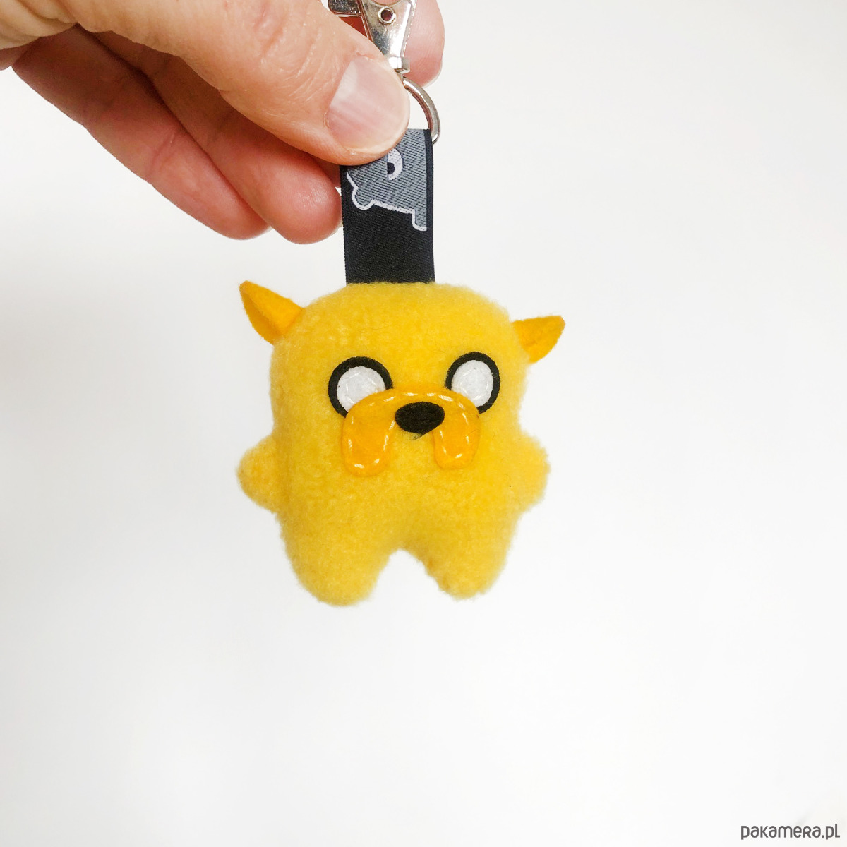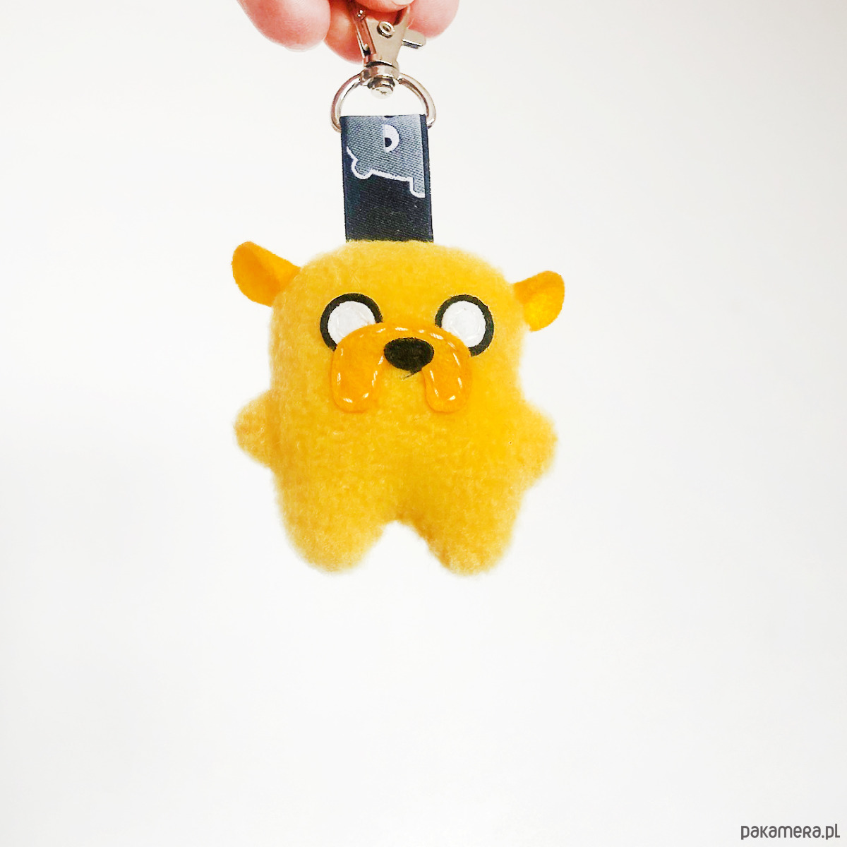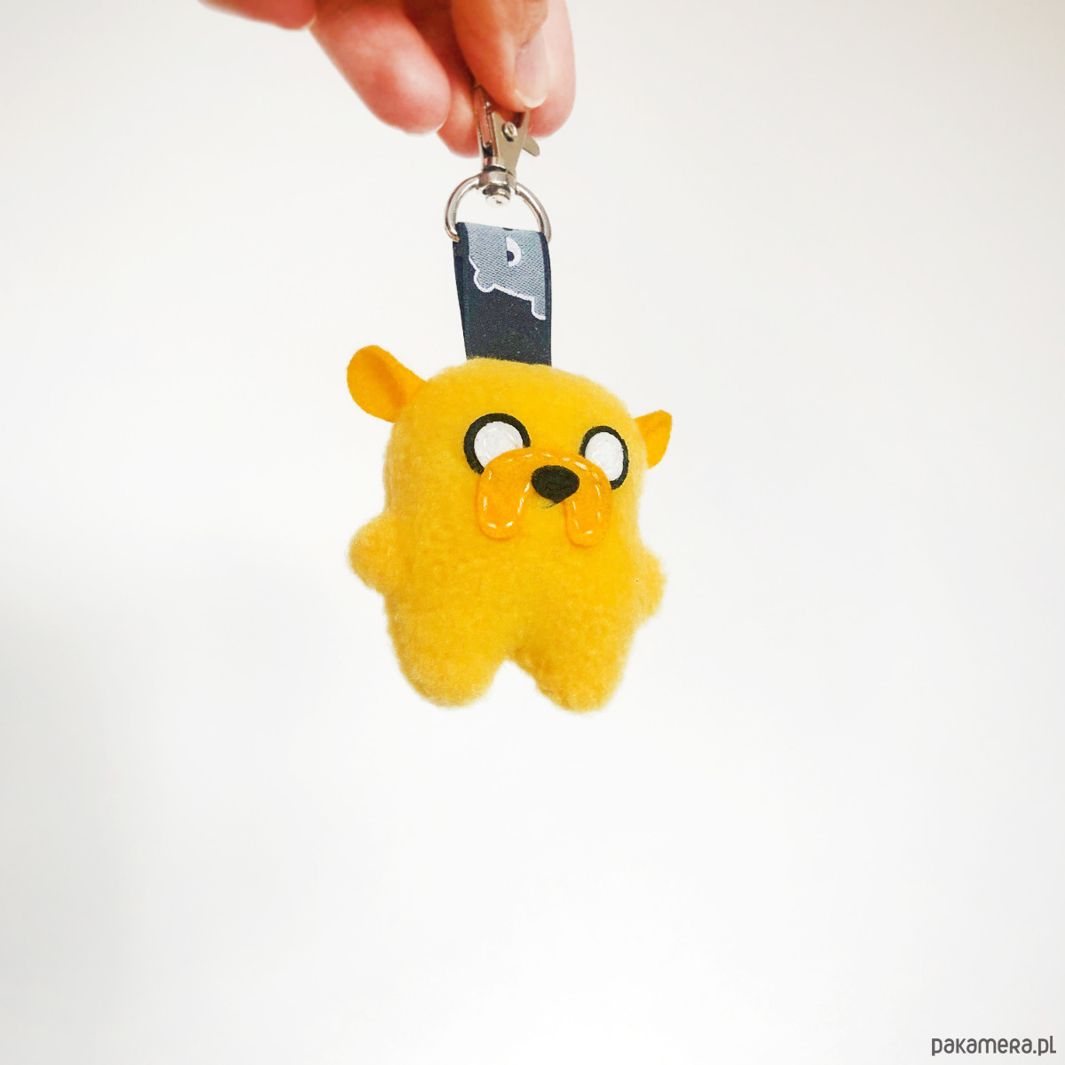 Ma zawieszkę z bambakowej taśmy i metalowego zapięcia, więc może wszędzie z Wami podróżować przy torbie czy plecaku, lub pilnować Waszych kluczy. Wskazane również noszenie w kieszeni, bo świetnie sprawdza się jako skryty pocieszyciel!