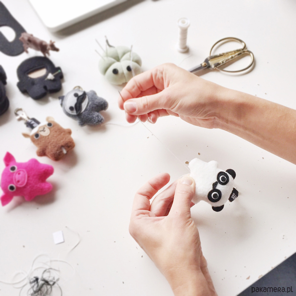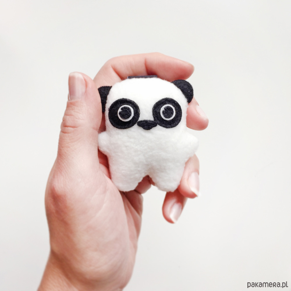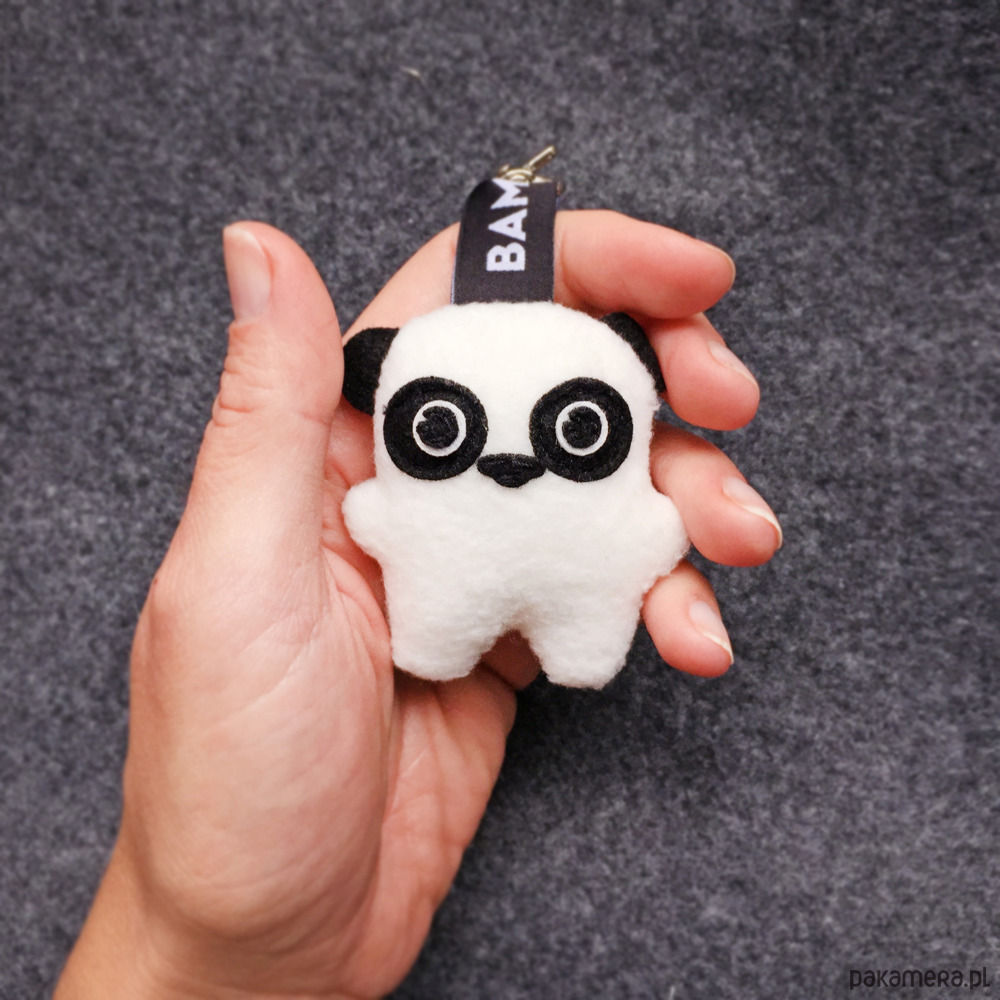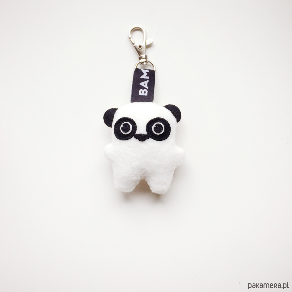 Ma zawieszkę z bambakowej taśmy i metalowego zapięcia, więc może wszędzie z Wami podróżować przy torbie czy plecaku, lub pilnować Waszych kluczy. Wskazane również noszenie w kieszeni, bo świetnie sprawdza się jako skryty pocieszyciel!