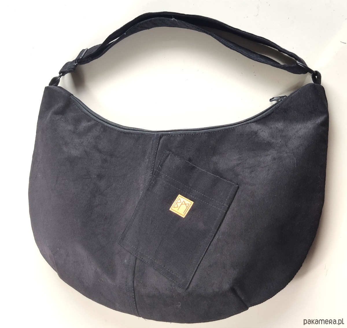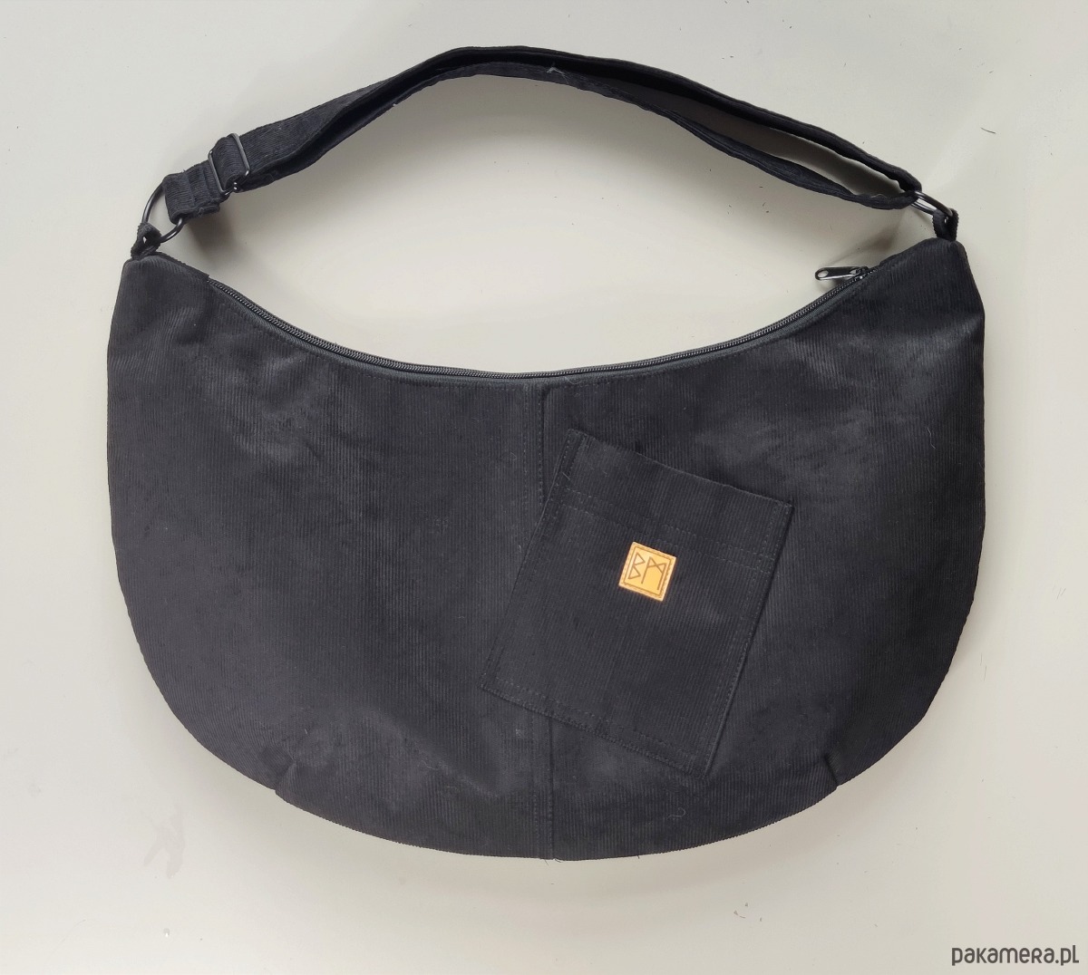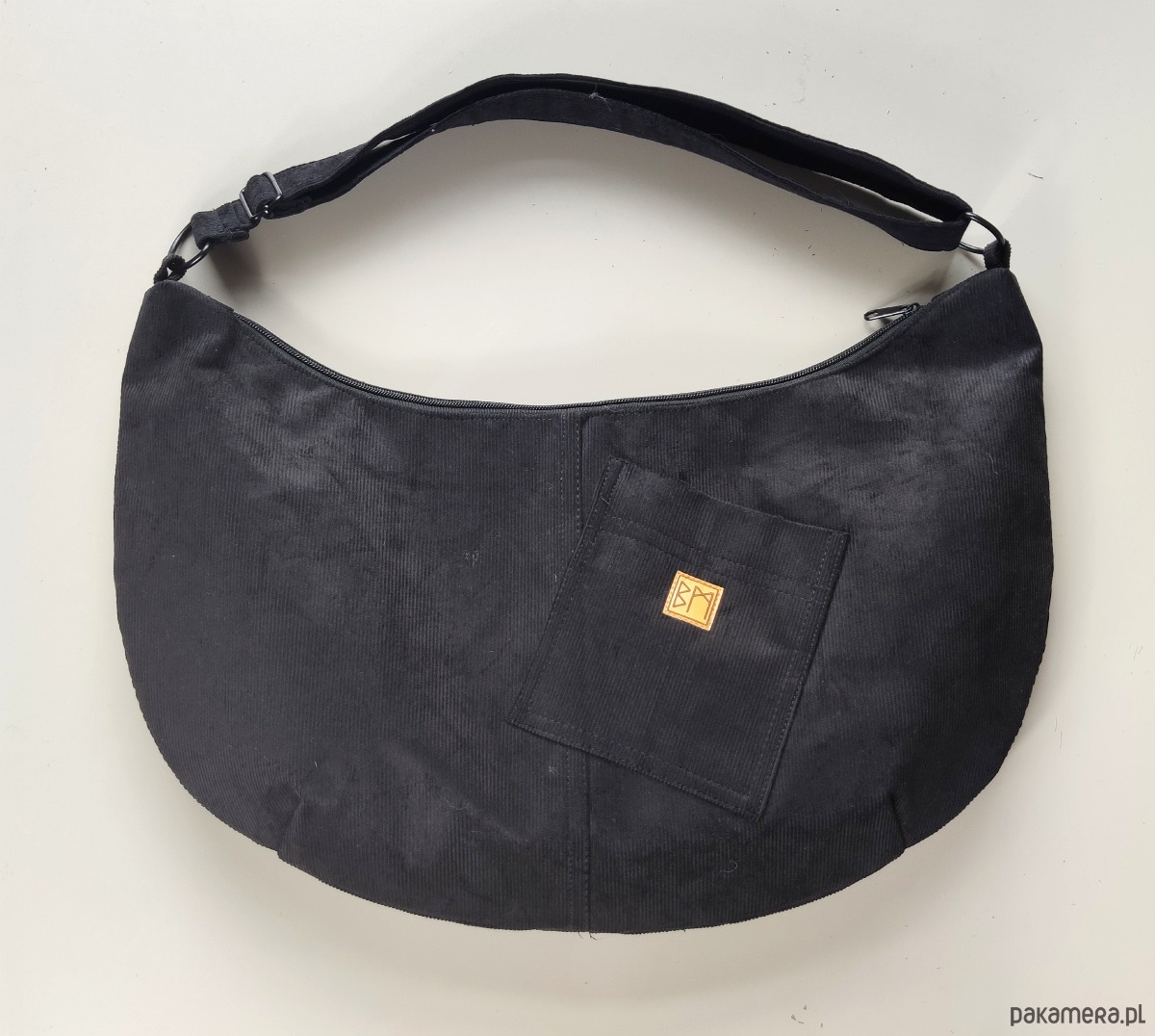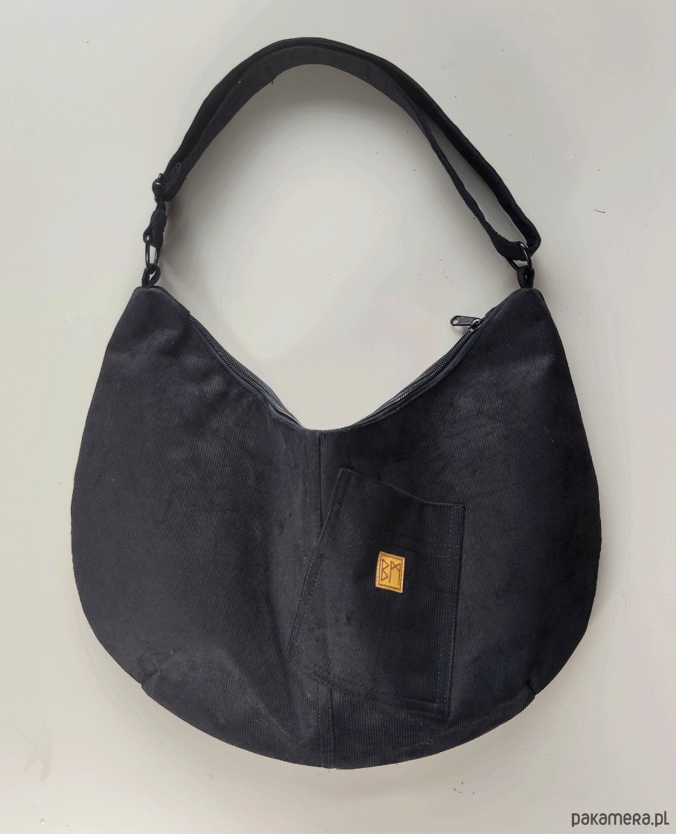Duży banan z regulowanym paskiem do noszenia na ramię lub na krzyż, wewnątrz podszewka z kieszonka zamykaną na suwak.