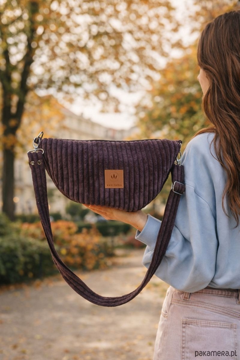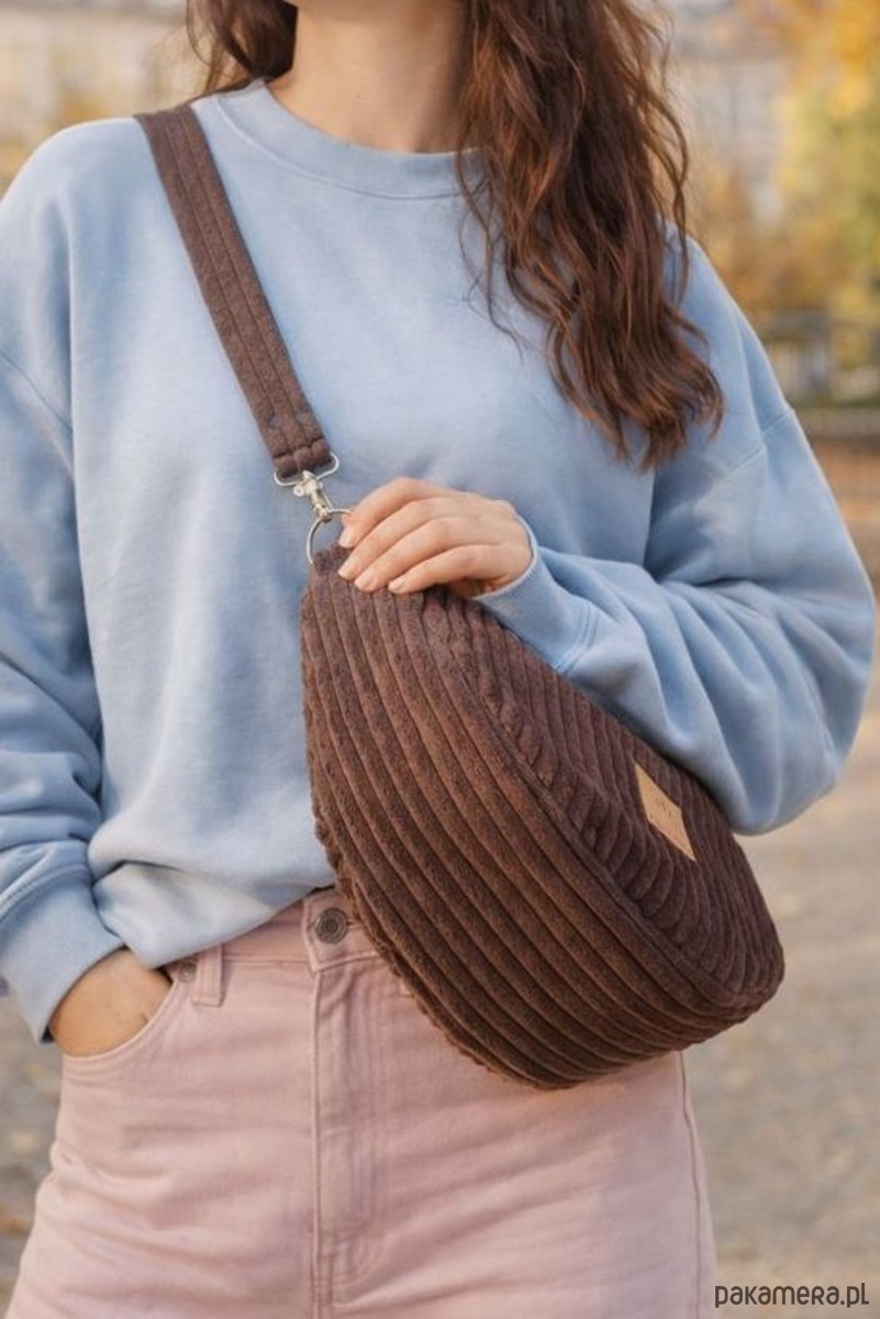 Torebka nerka wykonana ze sztruksu w szeroki prążek, który przyciąga wzrok.