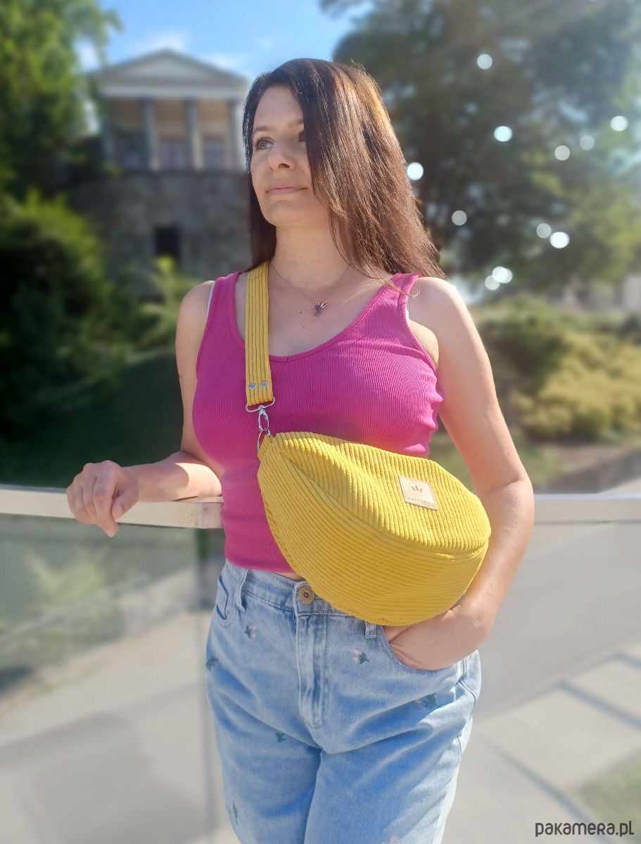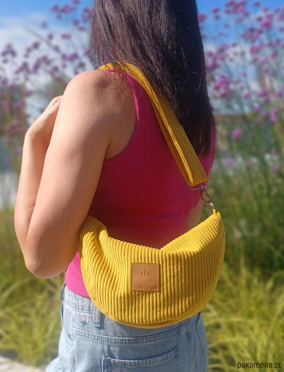 Torebka nerka wykonana ze sztruksu w drobny prążek, który przyciąga wzrok.
