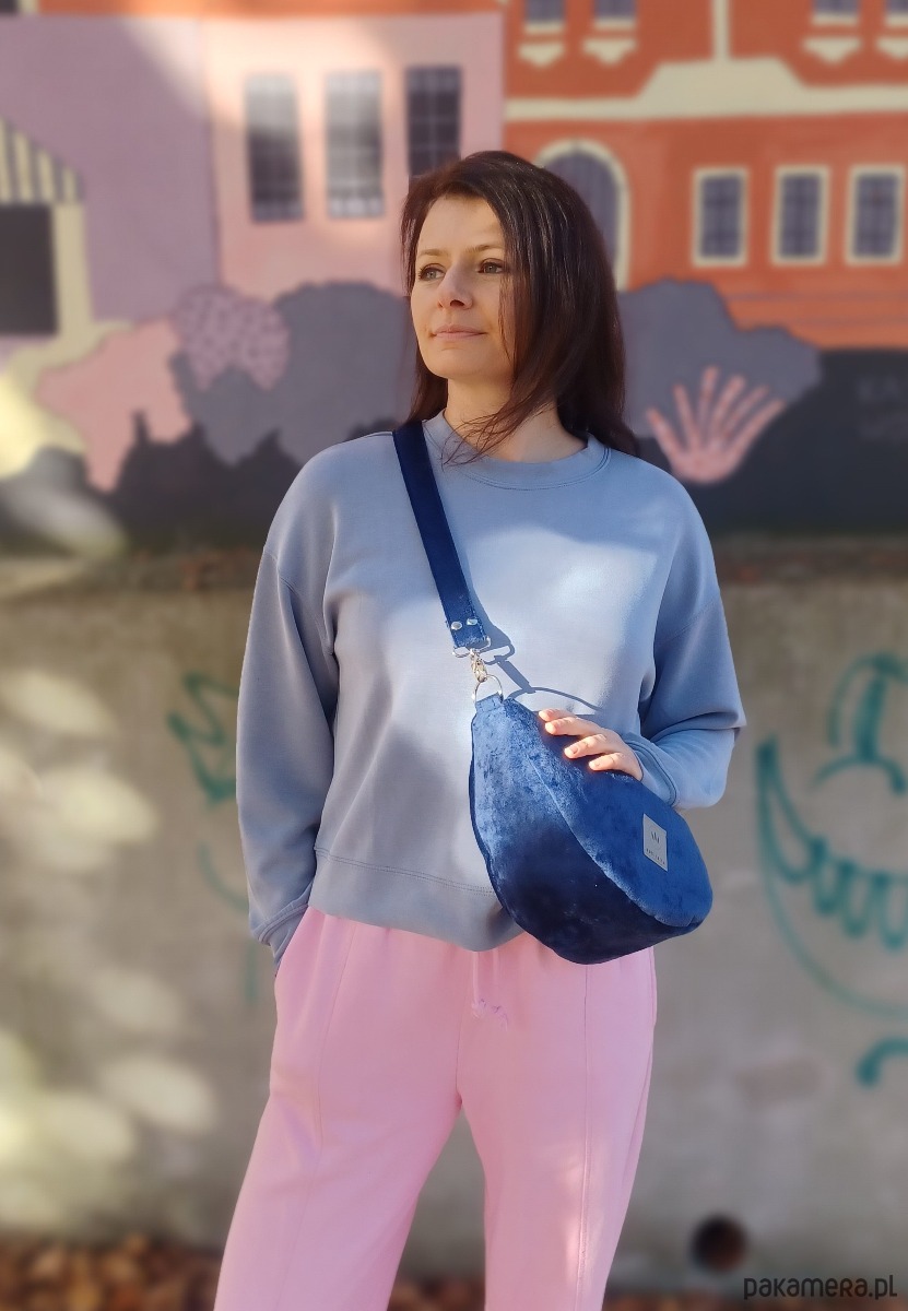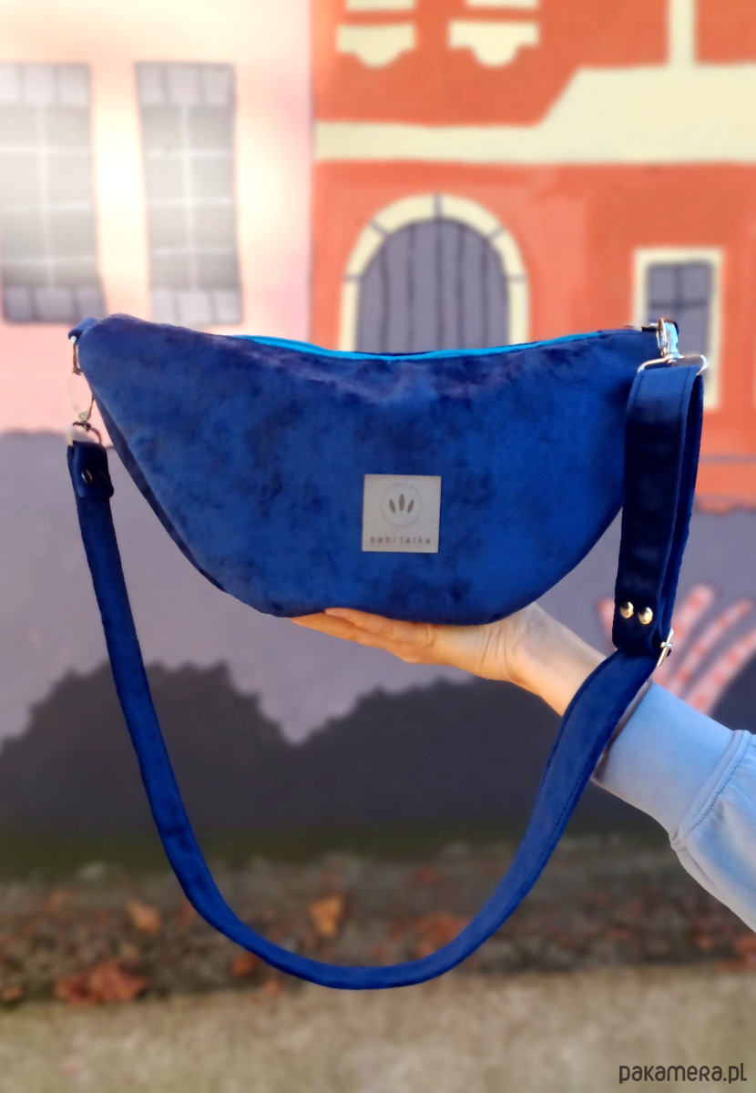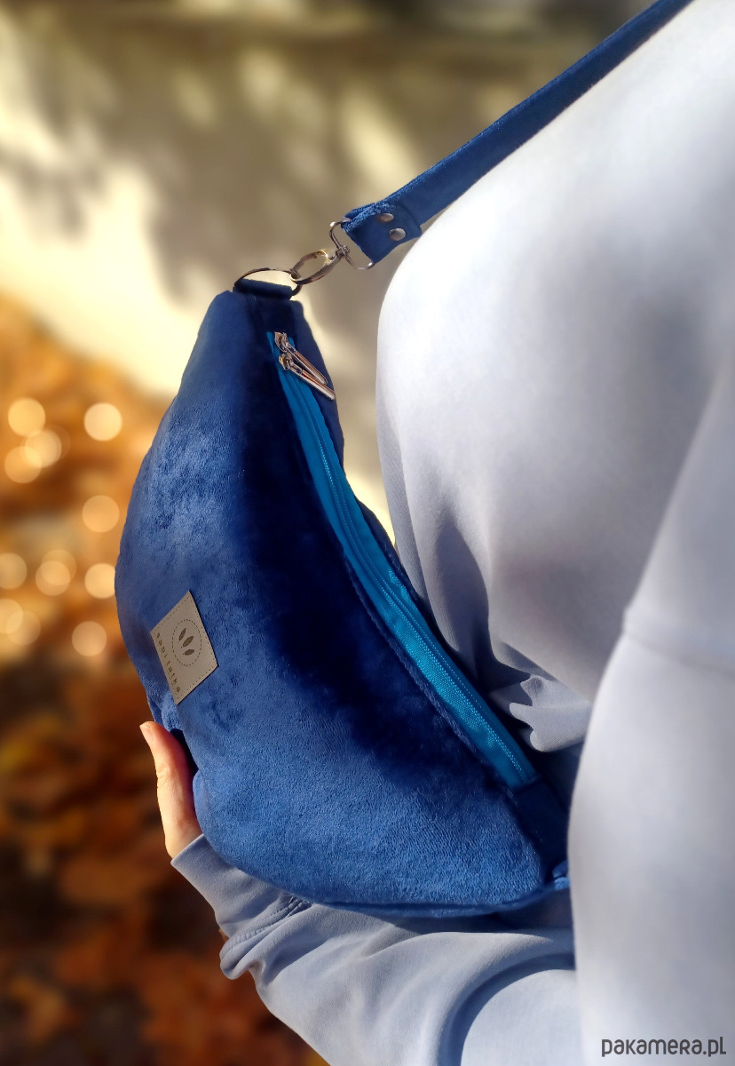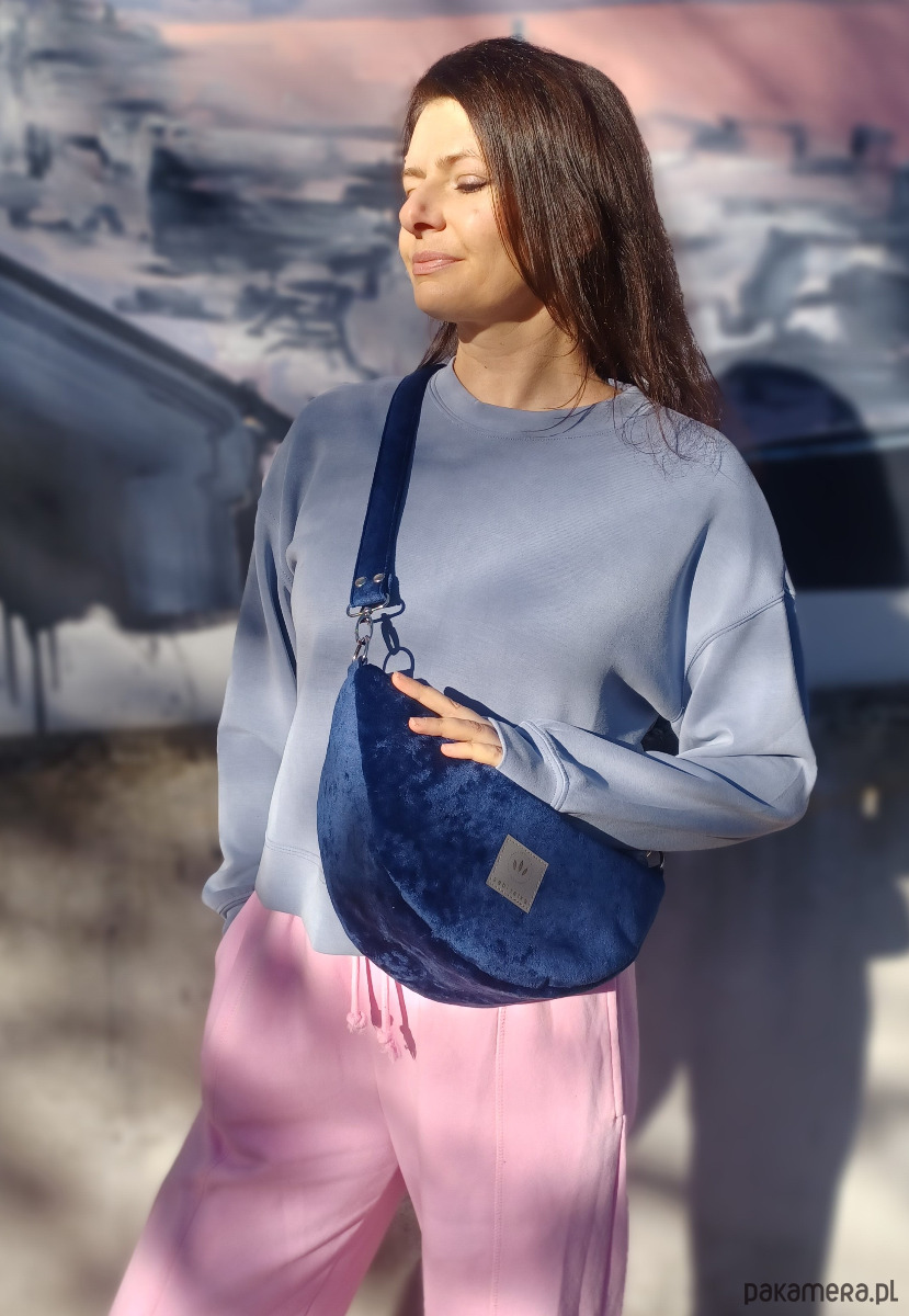 Torebka nerka wykonana z grubego, puchatego weluru w kolorze granatowym.