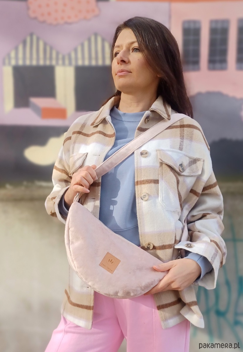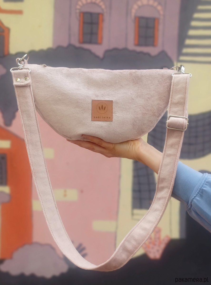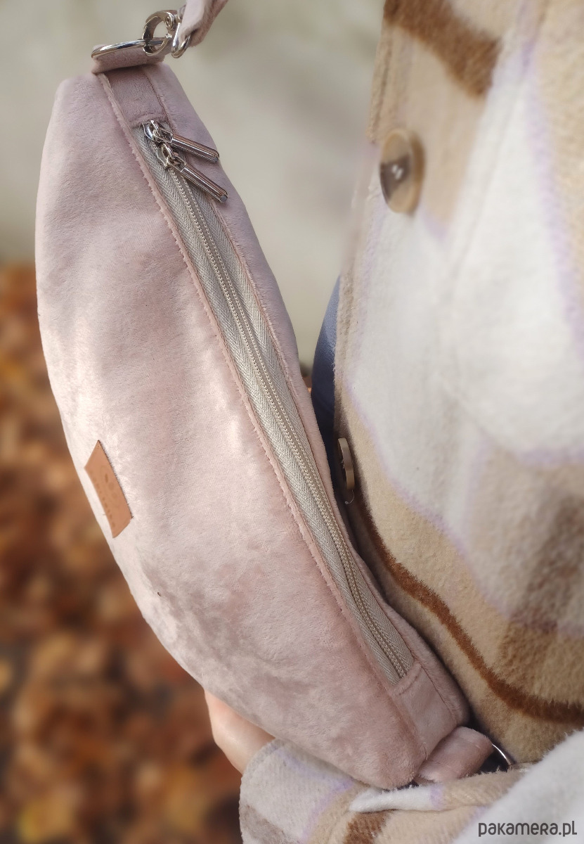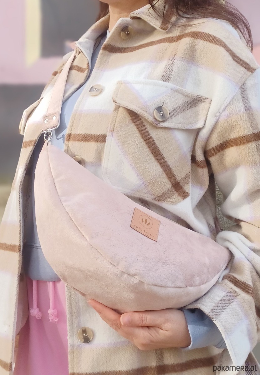 Torebka nerka wykonana z grubego, puchatego weluru w kolorze jasnego różu.