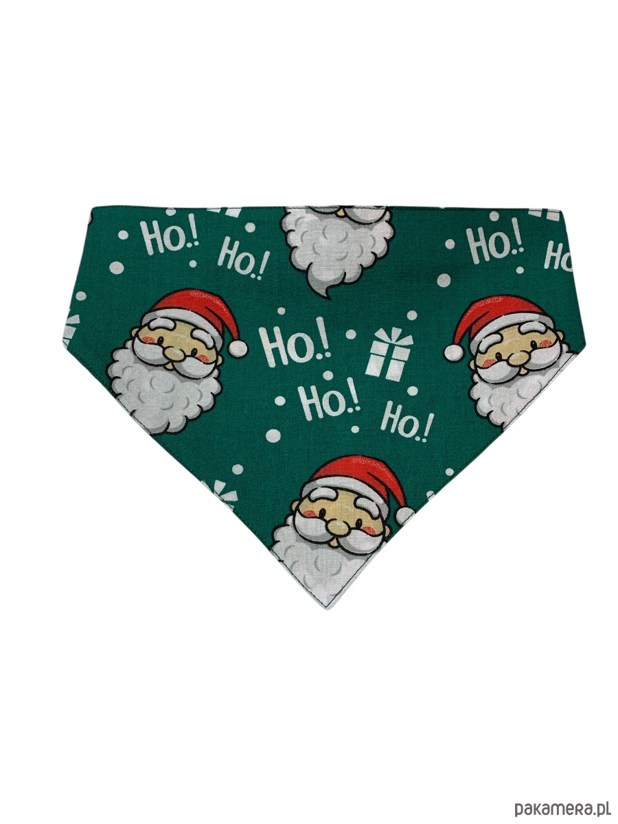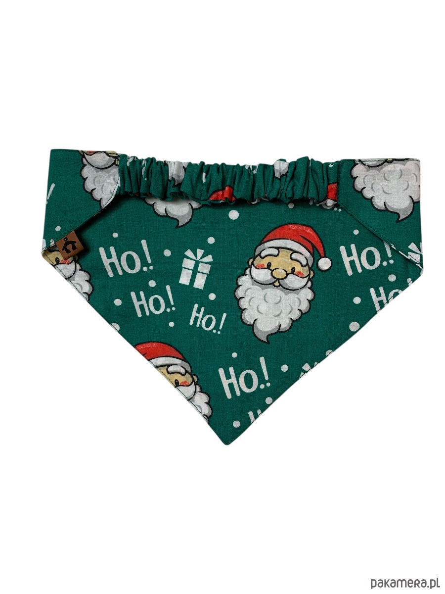 Idealna na zimowe spacery i świąteczne zdjęcia – zielony materiał z radosnym “Ho! Ho! Ho!” i buzią Mikołaja dodaje uroku każdemu pupilowi.