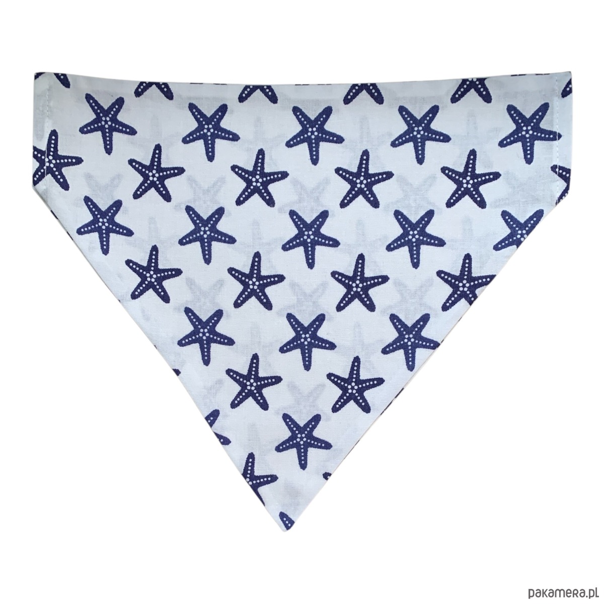Bandana w granatowe rozgwiazdy ze 100% bawełny. Lekka i wygodna w użyciu, idealna na spacer, grilla u znajomych czy urlop nad morzem.