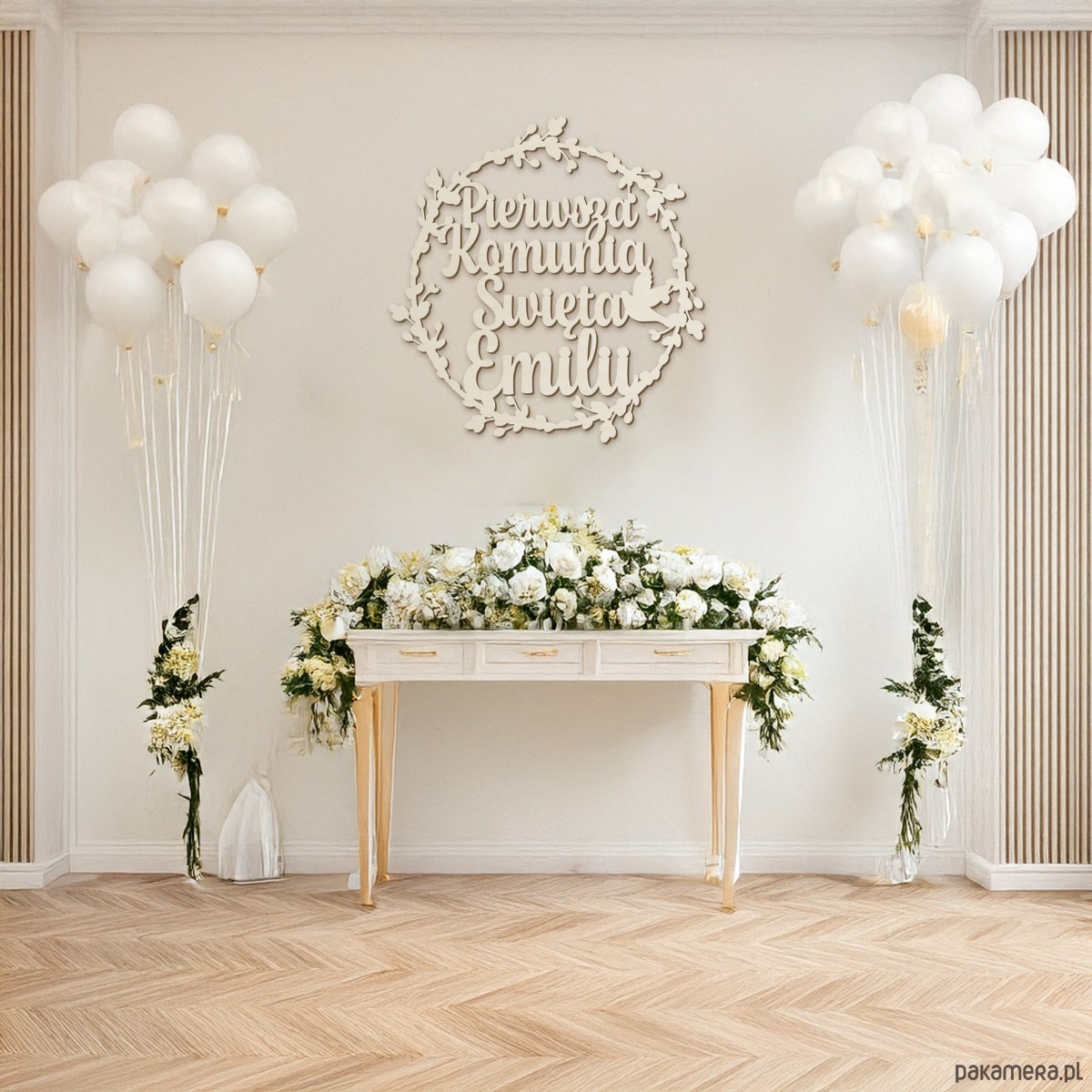 ✅ Łatwa w montażu – można ją zawiesić nad stołem, na ścianie, krześle komunijnym lub w wejściu na salę.