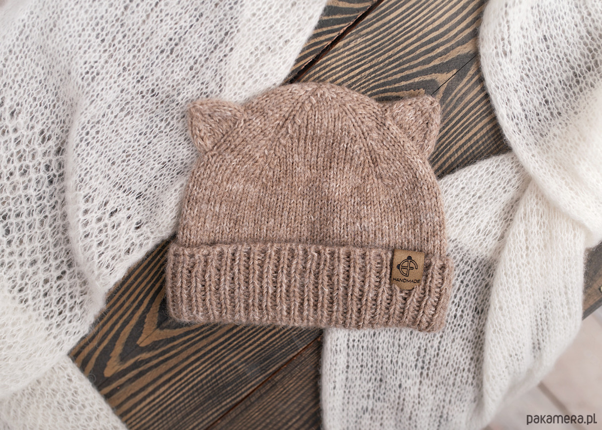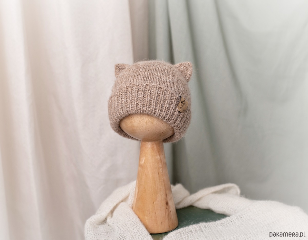 Czapeczka typu beanie dla niemowląt i dzieci z uroczymi kocimi uszkami, wykonana ręcznie. Delikatny moher w skład w który wchodzi wełna merynos, baby alpaka oraz tencel. Czapeczka nada się praktycznie na cały rok, dzięki właściwościom termoregulacyjnym, chroni skórę maluszka przed przegrzaniem.