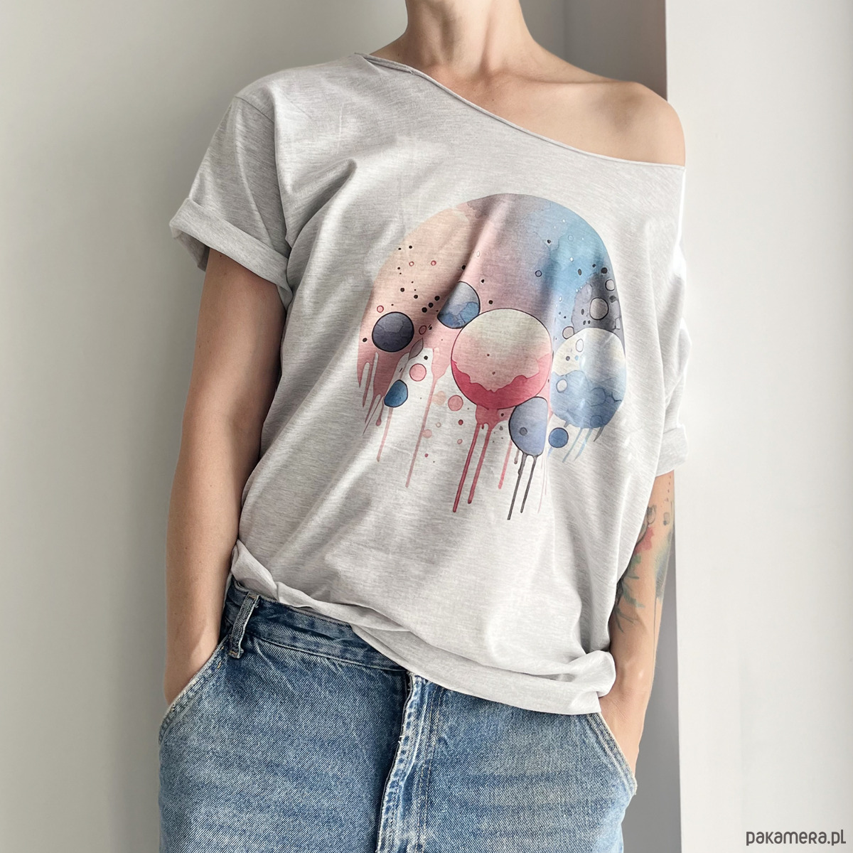 Szara koszulka z pastelowymi różowymi banieczkami — jak chwila oddechu w środku dnia.