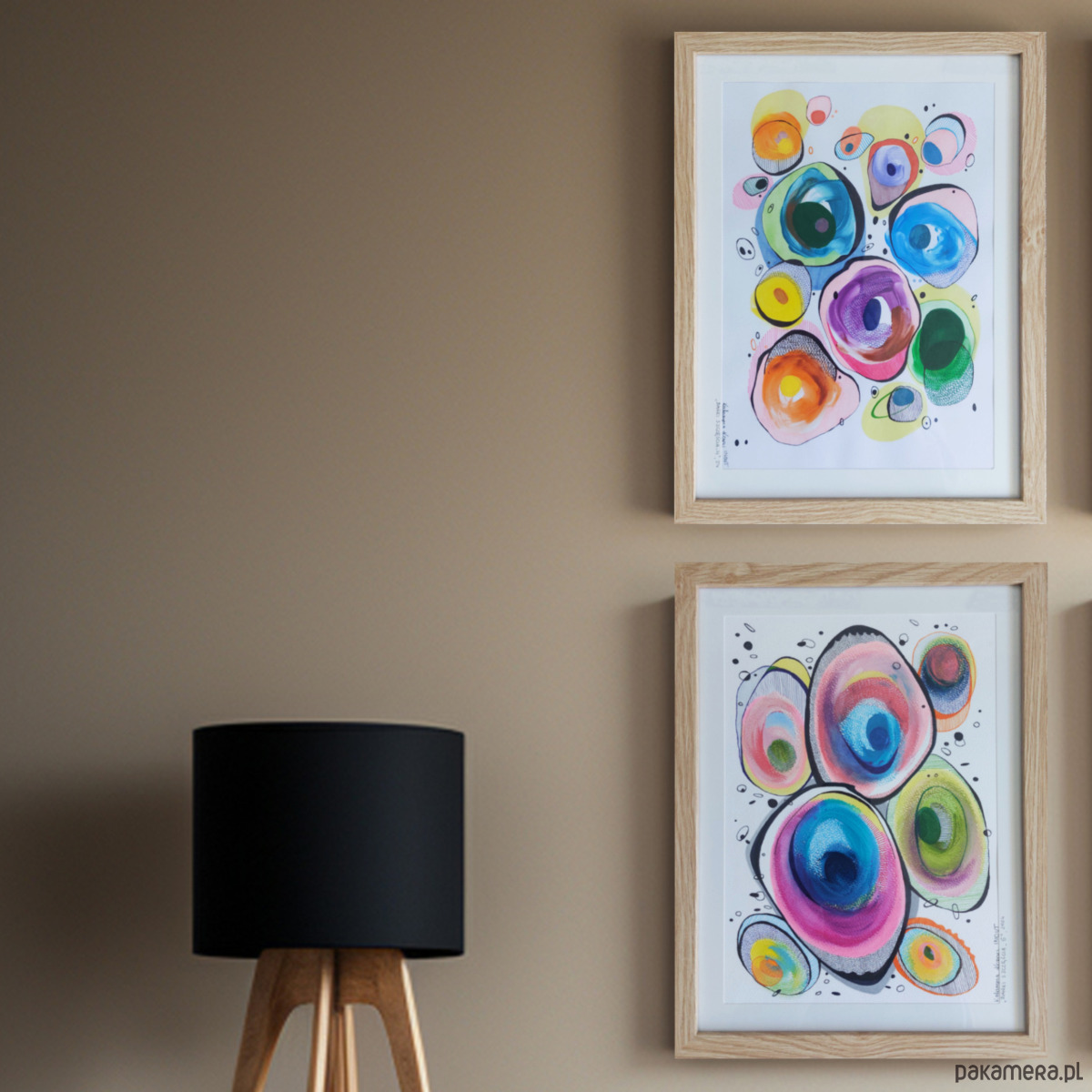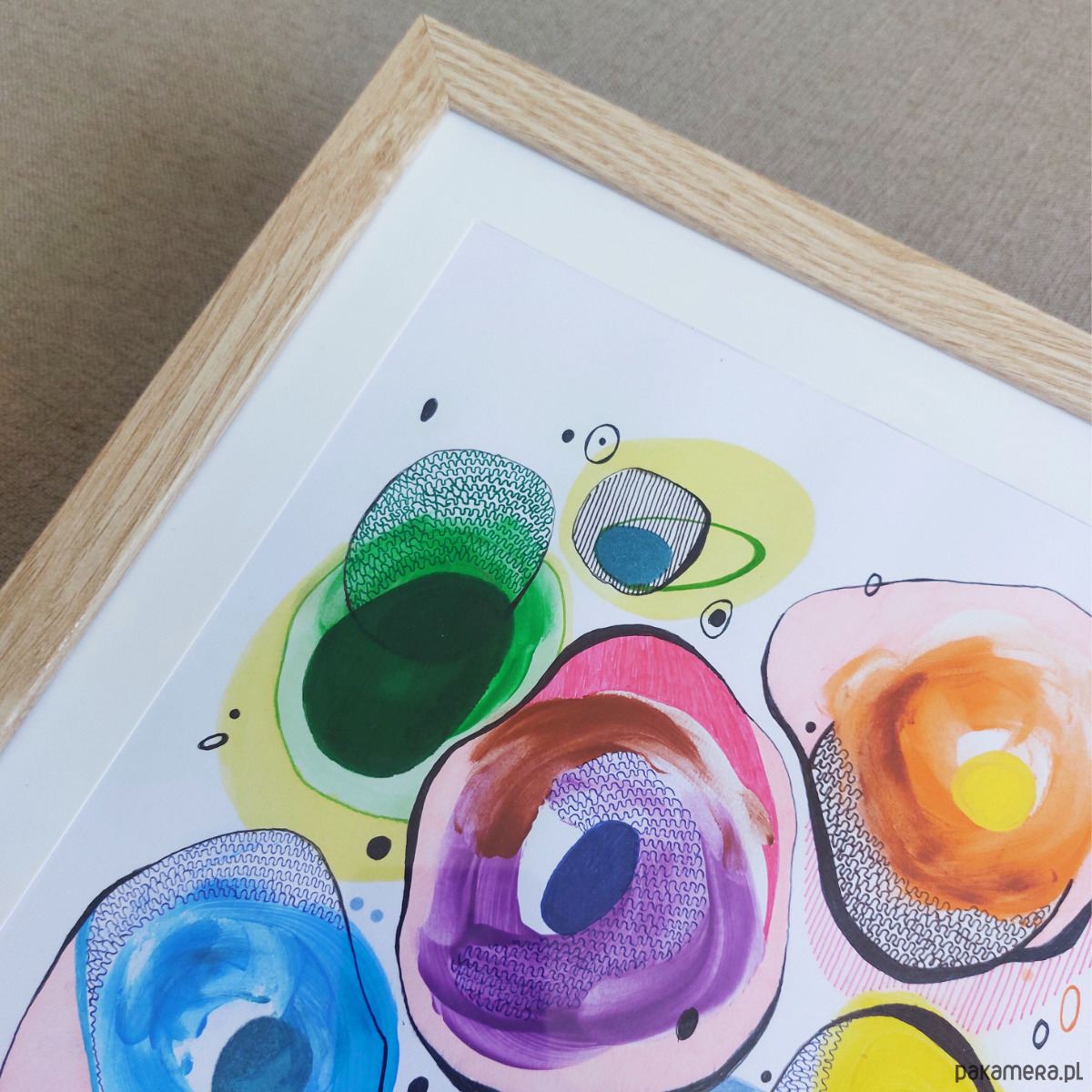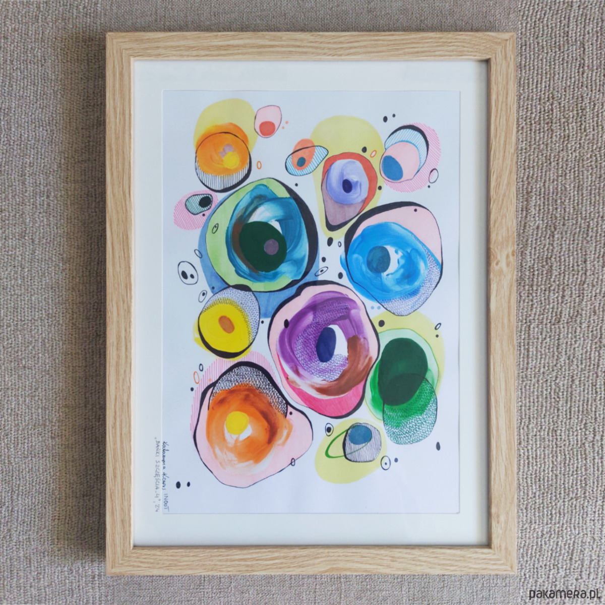 BAŃKI SZCZĘŚCIA_4 to radosna abstrakcja pełna koloru namalowana na przełomie jesieni i zimy. Świetnie sprawdzi się w pokoju dziecka, sypialni i każdej innej przestrzeni, której Mieszkańcy lubią ożywcze, lekkie barwy.