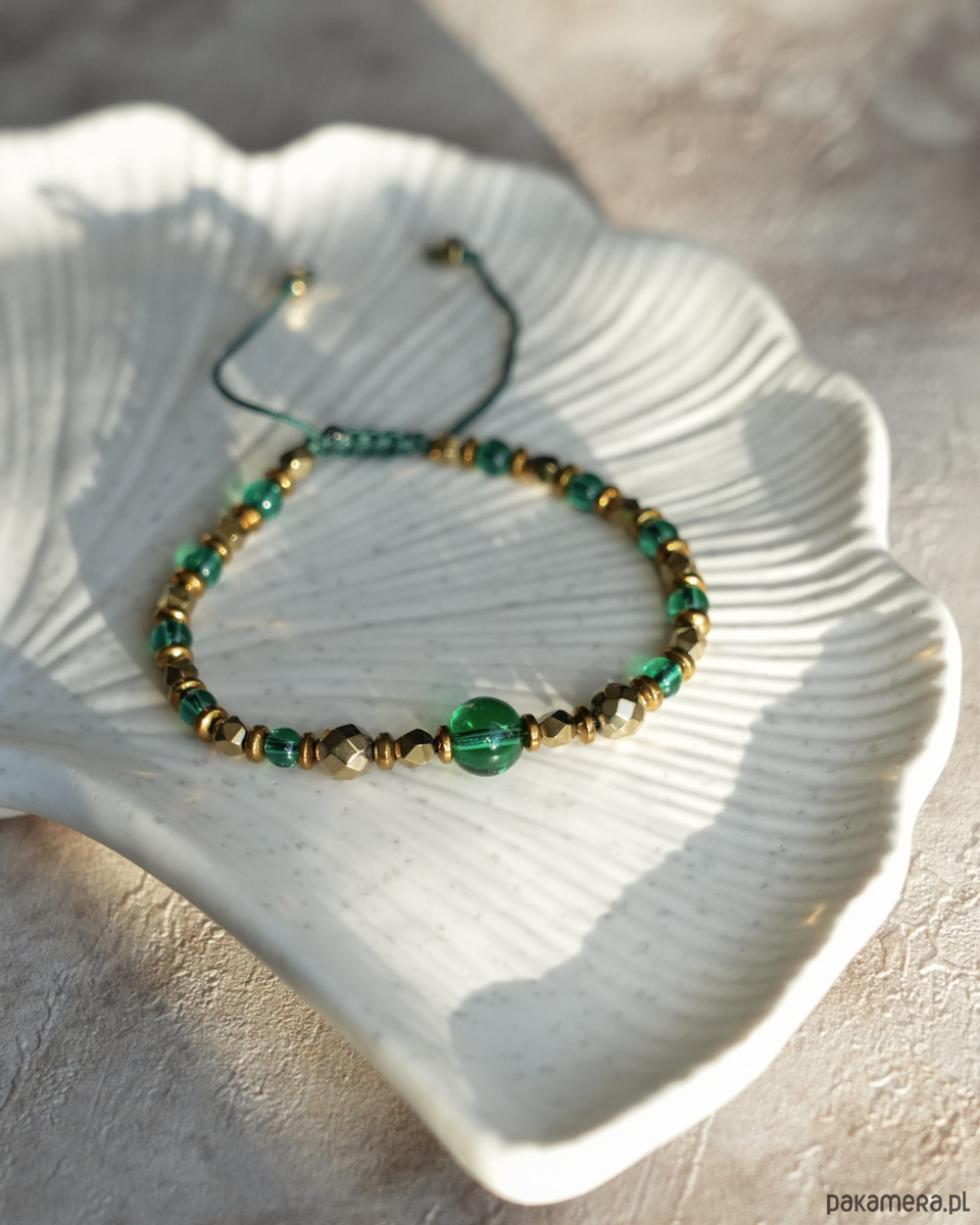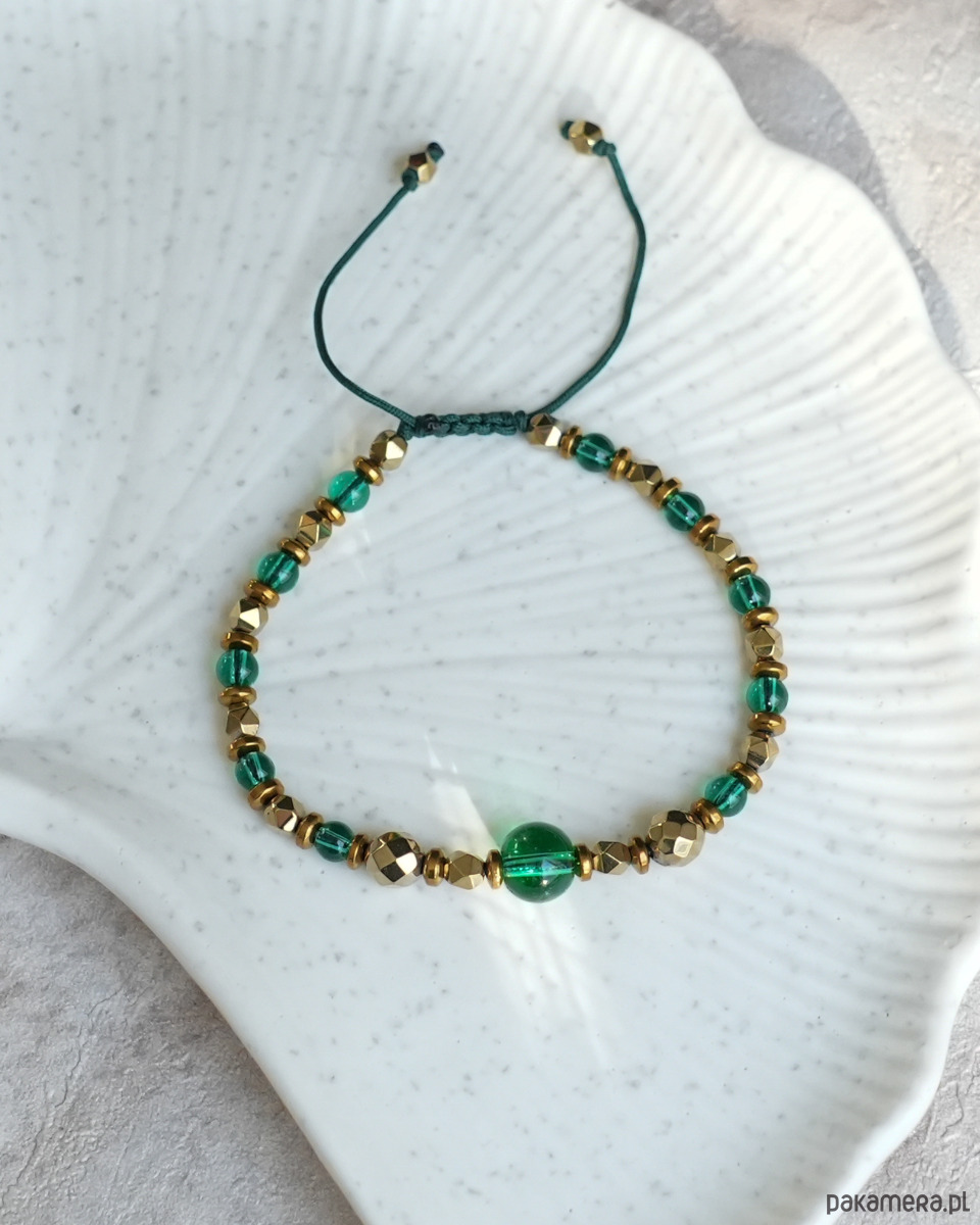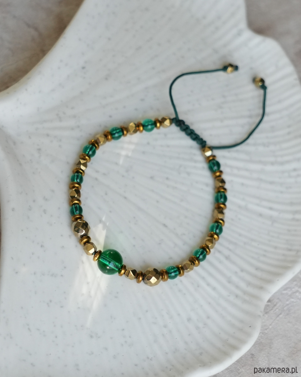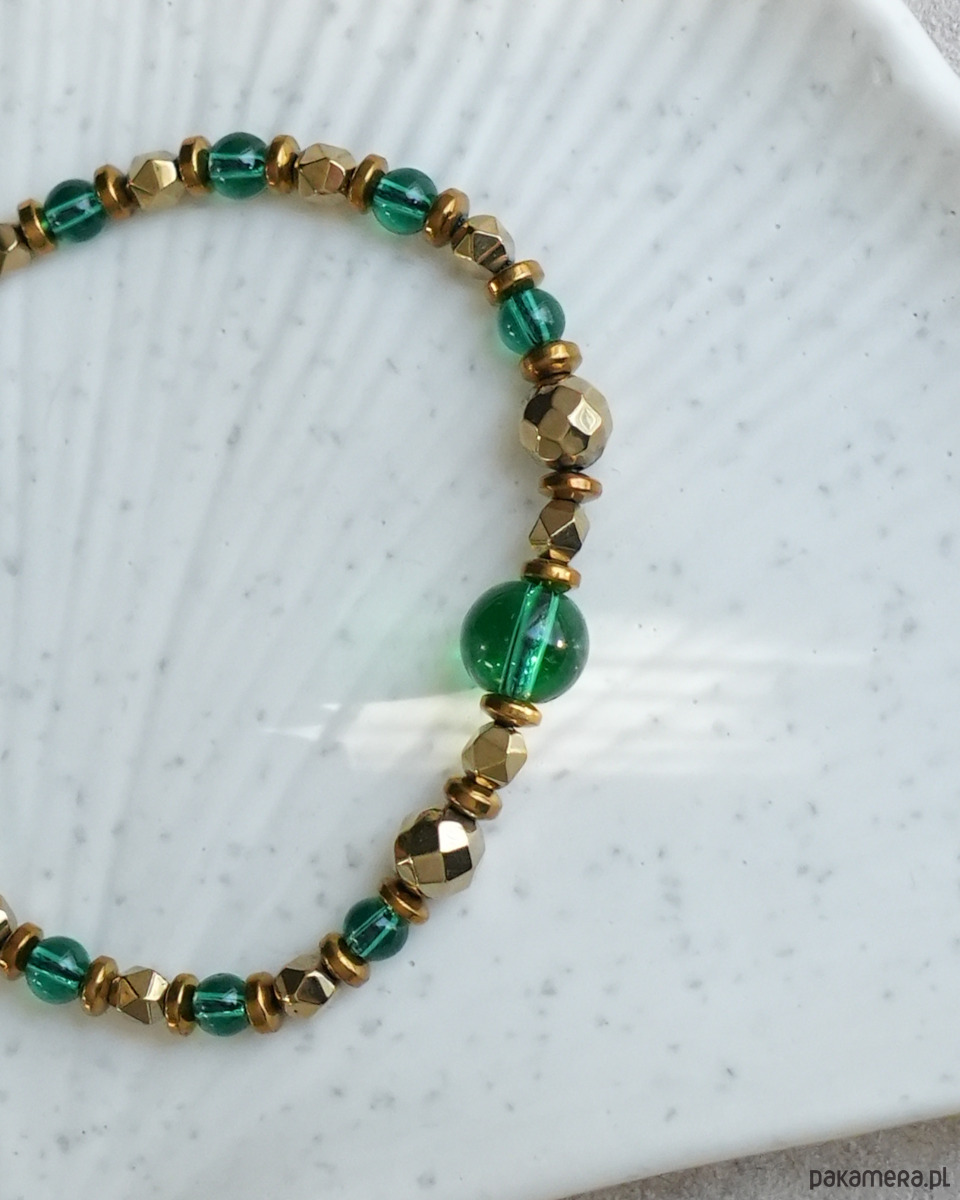 Ozdobna bransoletka ze złotego HEMATYTU i szklanych koralików w kolorze butelkowej zieleni. Kamienie mają fasetowane wykończenie, dzięki czemu pięknie odbijają światło. Koraliki są nawleczone na mocny sznureczek w kolorze butelkowej zieleni.