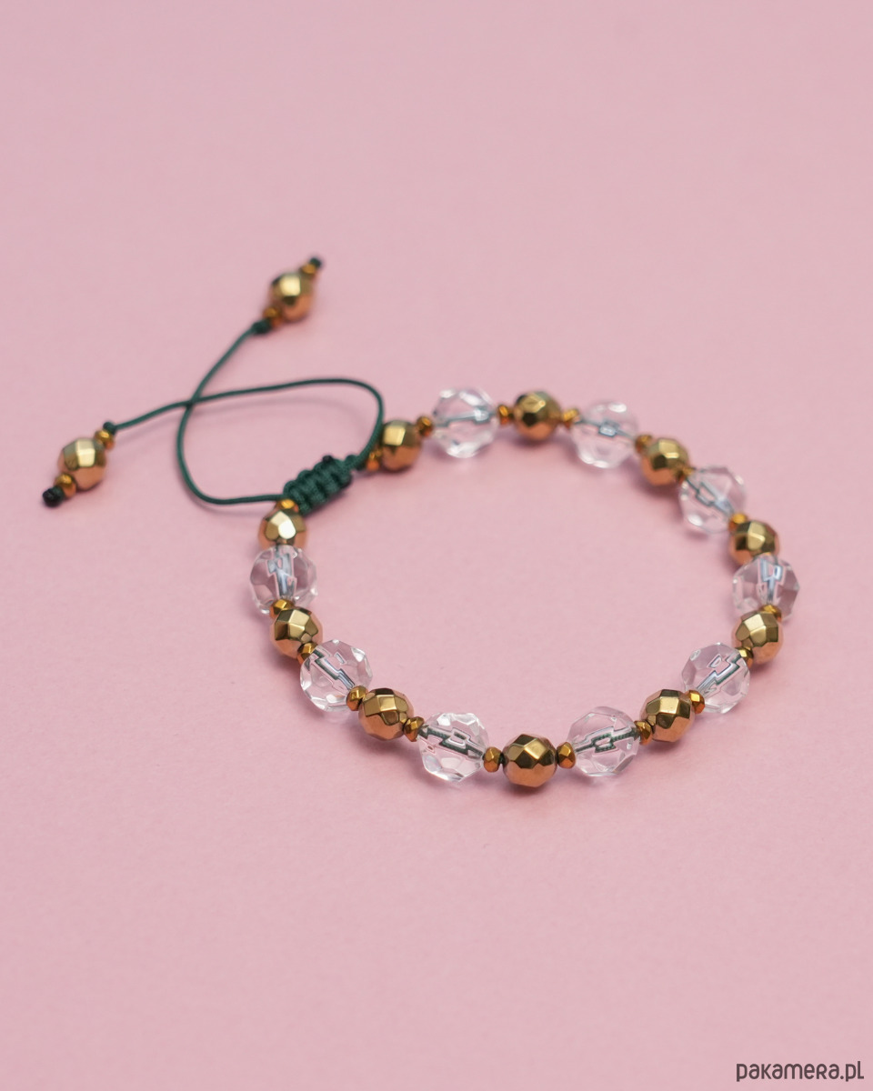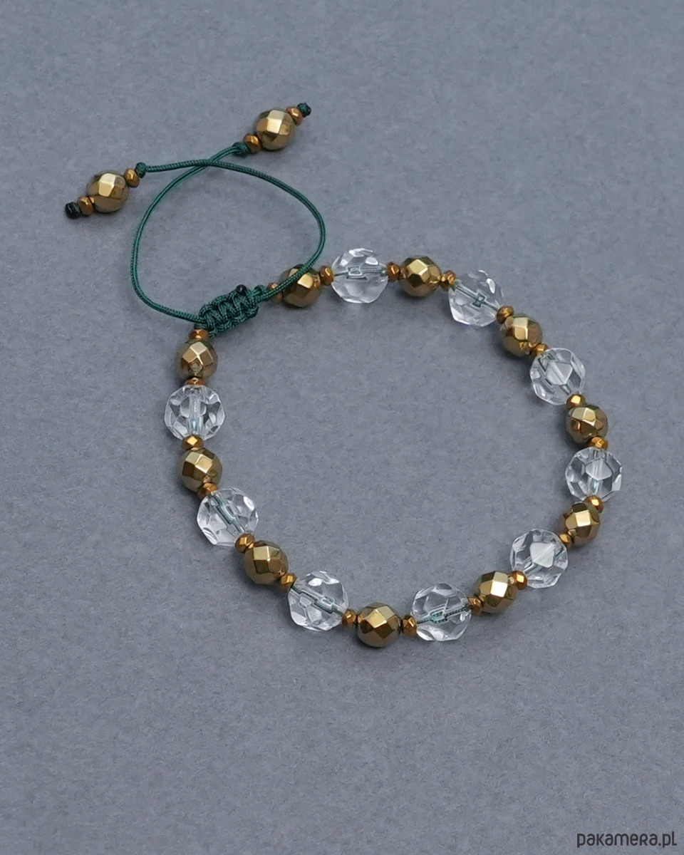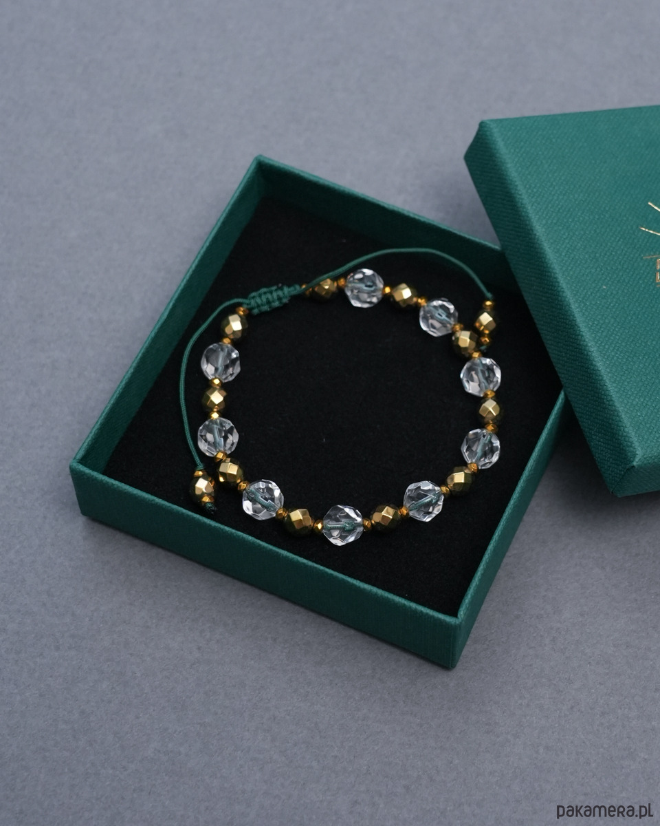 Ozdobna bransoletka ze złotego HEMATYTU i szklanych KRYSZTAŁKÓW o pięknym szlifie. Koraliki mają fasetowane wykończenie, dzięki czemu pięknie odbijają światło. Nawleczone są na mocny sznureczek w kolorze butelkowej zieleni.