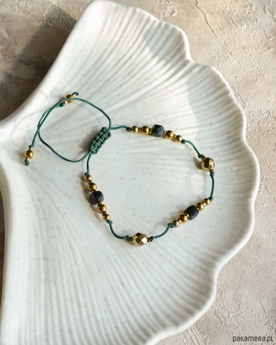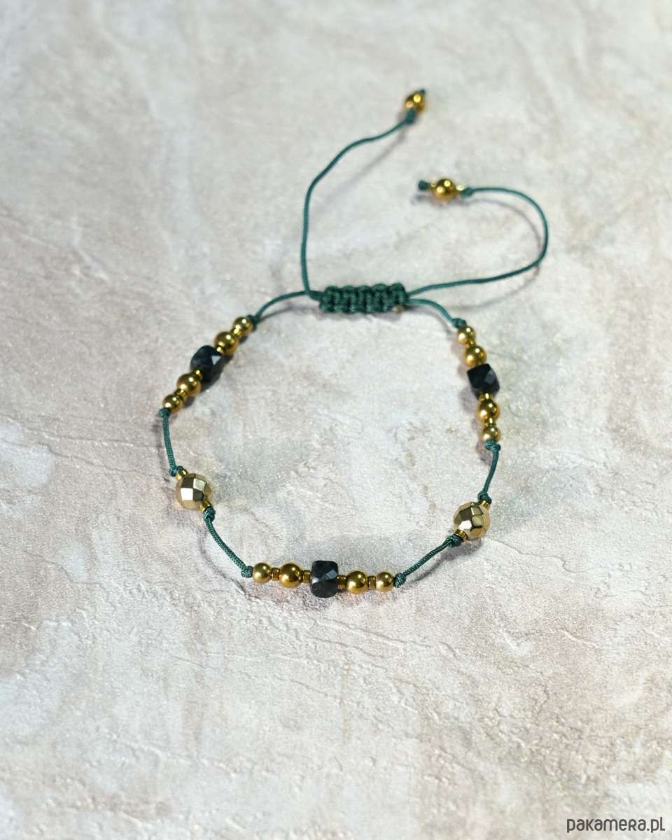 Delikatna bransoletka z kostkami zielonego NEFRYTU i złotymi HEMATYTAMI. Koraliki są nawleczone na mocny sznureczek w kolorze butelkowej zieleni. Bransoletka jest regulowana, dzięki czemu ma uniwersalny rozmiar. Będzie się super prezentować w połączeniu z innymi bransoletkami, nie tylko wykonanymi z minerałów, ale również złotymi.