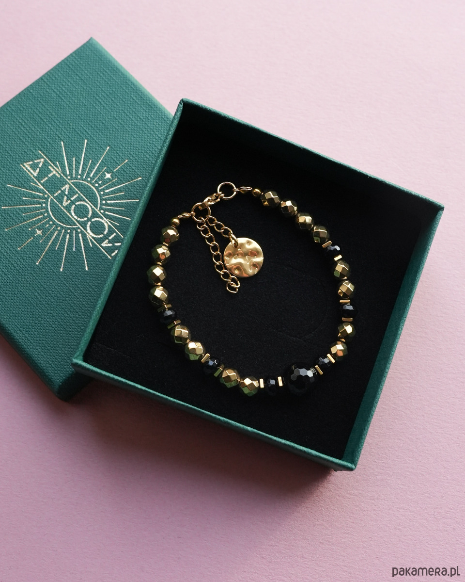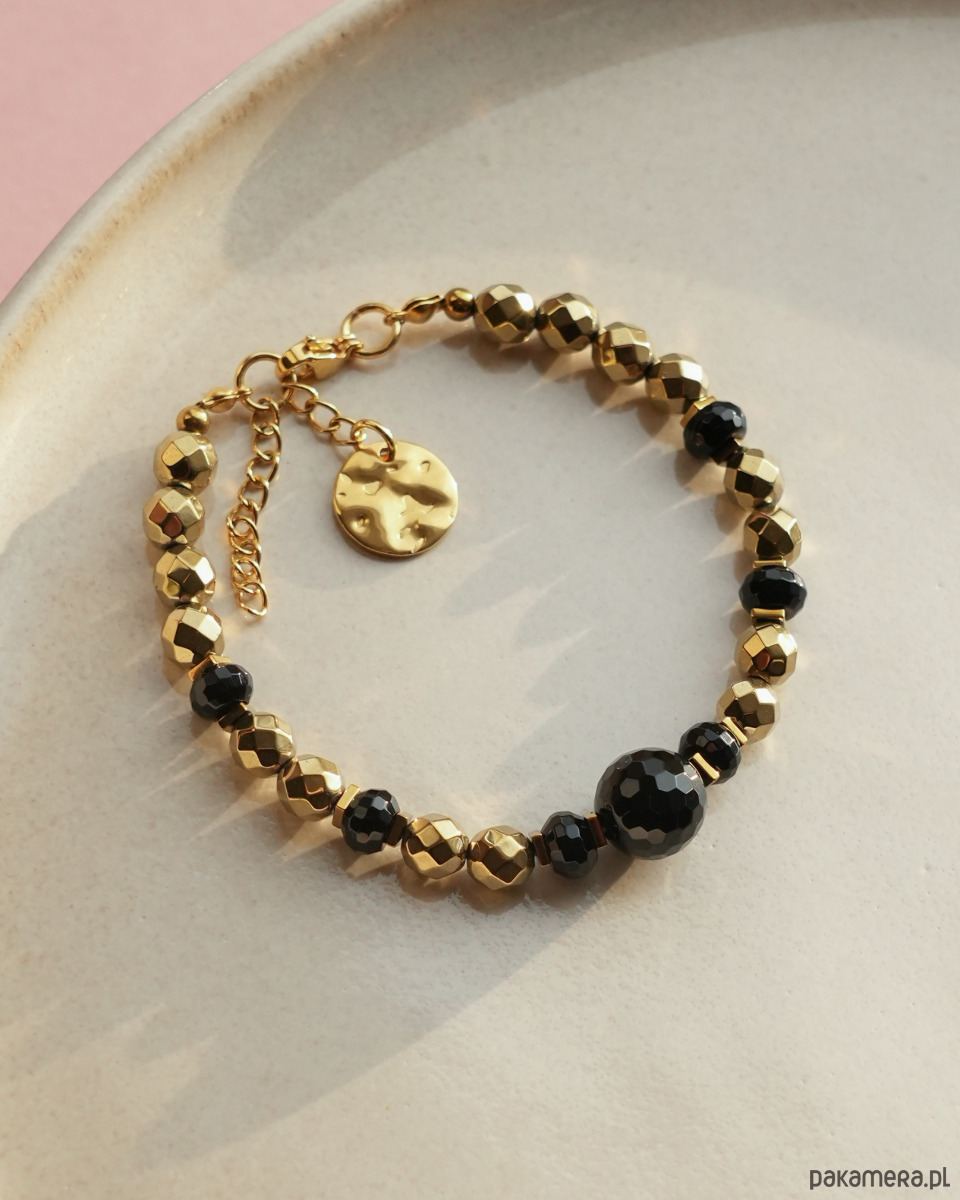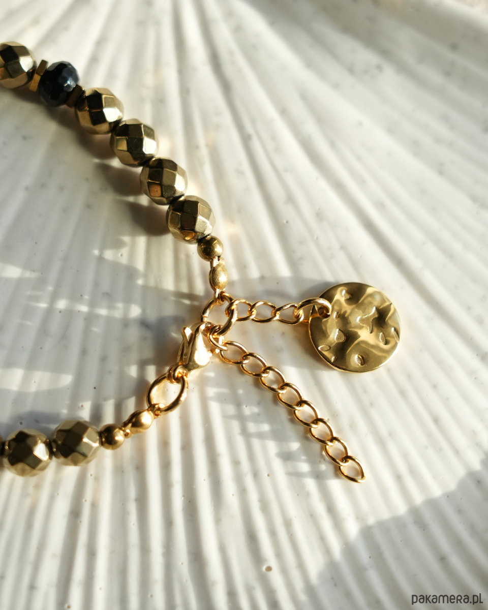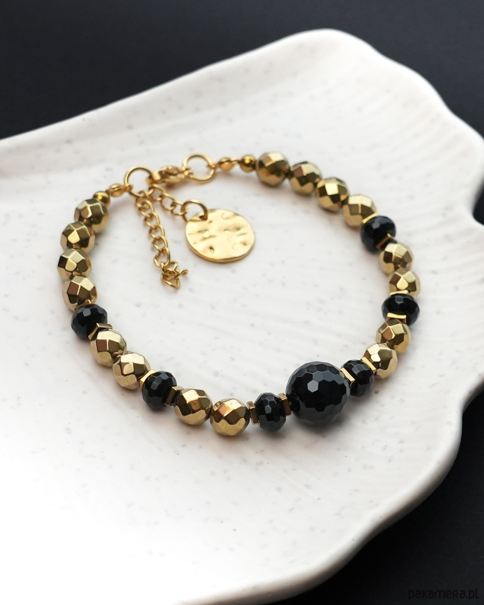 Elegancka, klasyczna bransoletka z czarnym ONYKSEM i złotym HEMATYTEM oraz ozdobnym elementem z postaci okrągłej blaszki ze STALI SZLACHETNEJ. Bransoletka będzie się super prezentować solo, jak i w połączeniu z innymi bransoletkami wykonanymi z minerałów i złotymi. Złoto i czerń to ponadczasowe zestawienie kolorystyczne, które pasuje niemal do wszystkiego.