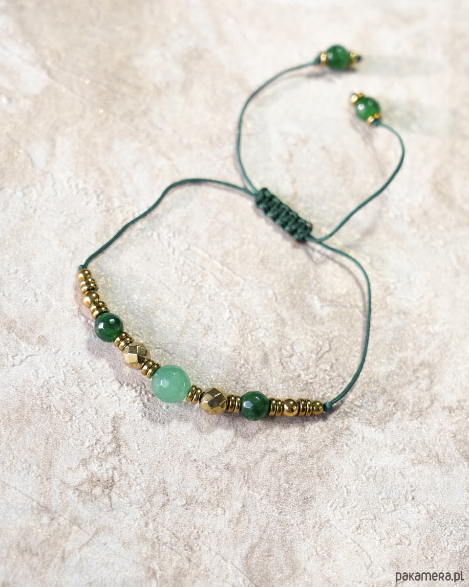 Ozdobna bransoletka z zielonymi, fasetowanymi JADEITAMI i złotymi HEMATYTAMI. Koraliki są nawleczone na mocny sznureczek w kolorze butelkowej zieleni. Bransoletka jest regulowana, dzięki czemu ma uniwersalny rozmiar. Będzie się super prezentować w połączeniu z innymi bransoletkami, nie tylko wykonanymi z minerałów, ale również złotymi.