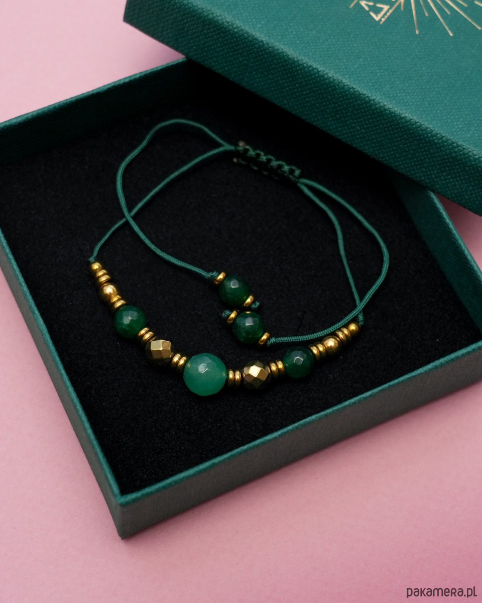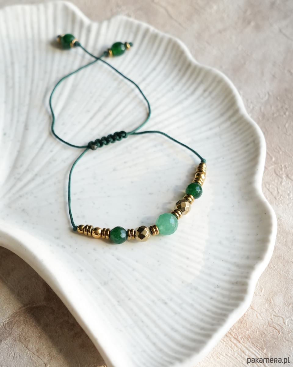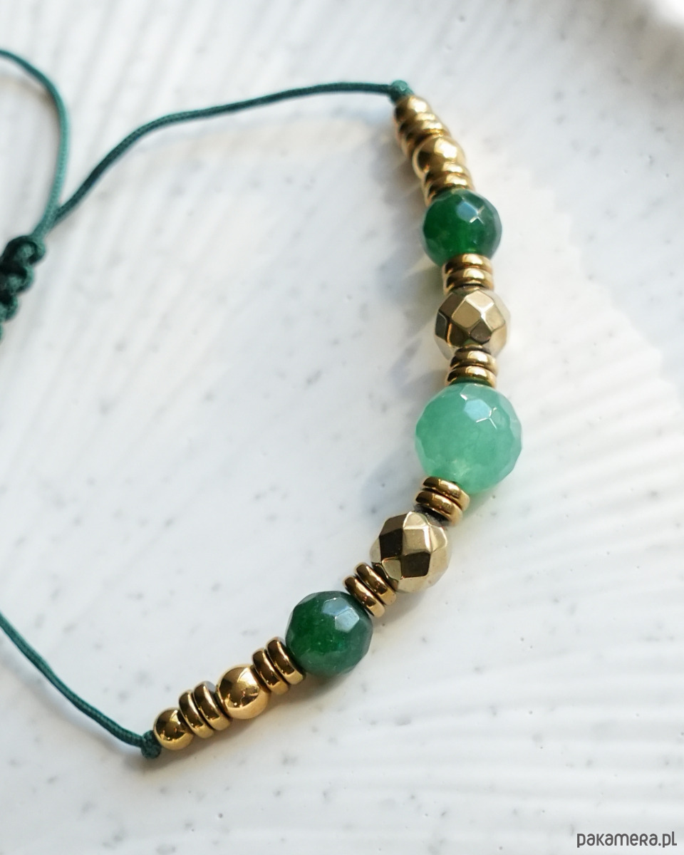 Ozdobna bransoletka z zielonymi, fasetowanymi JADEITAMI i złotymi HEMATYTAMI. Koraliki są nawleczone na mocny sznureczek w kolorze butelkowej zieleni. Bransoletka jest regulowana, dzięki czemu ma uniwersalny rozmiar. Będzie się super prezentować w połączeniu z innymi bransoletkami, nie tylko wykonanymi z minerałów, ale również złotymi.