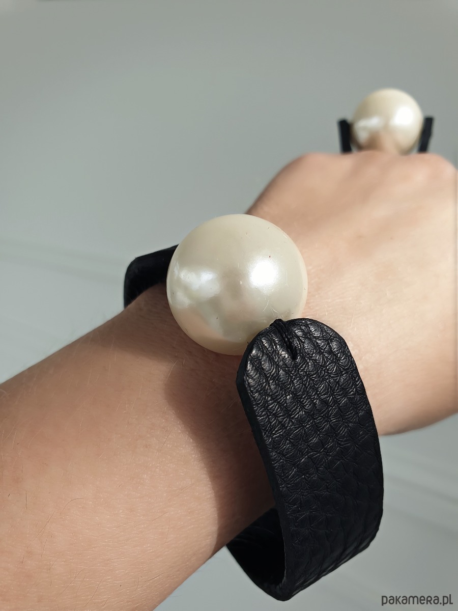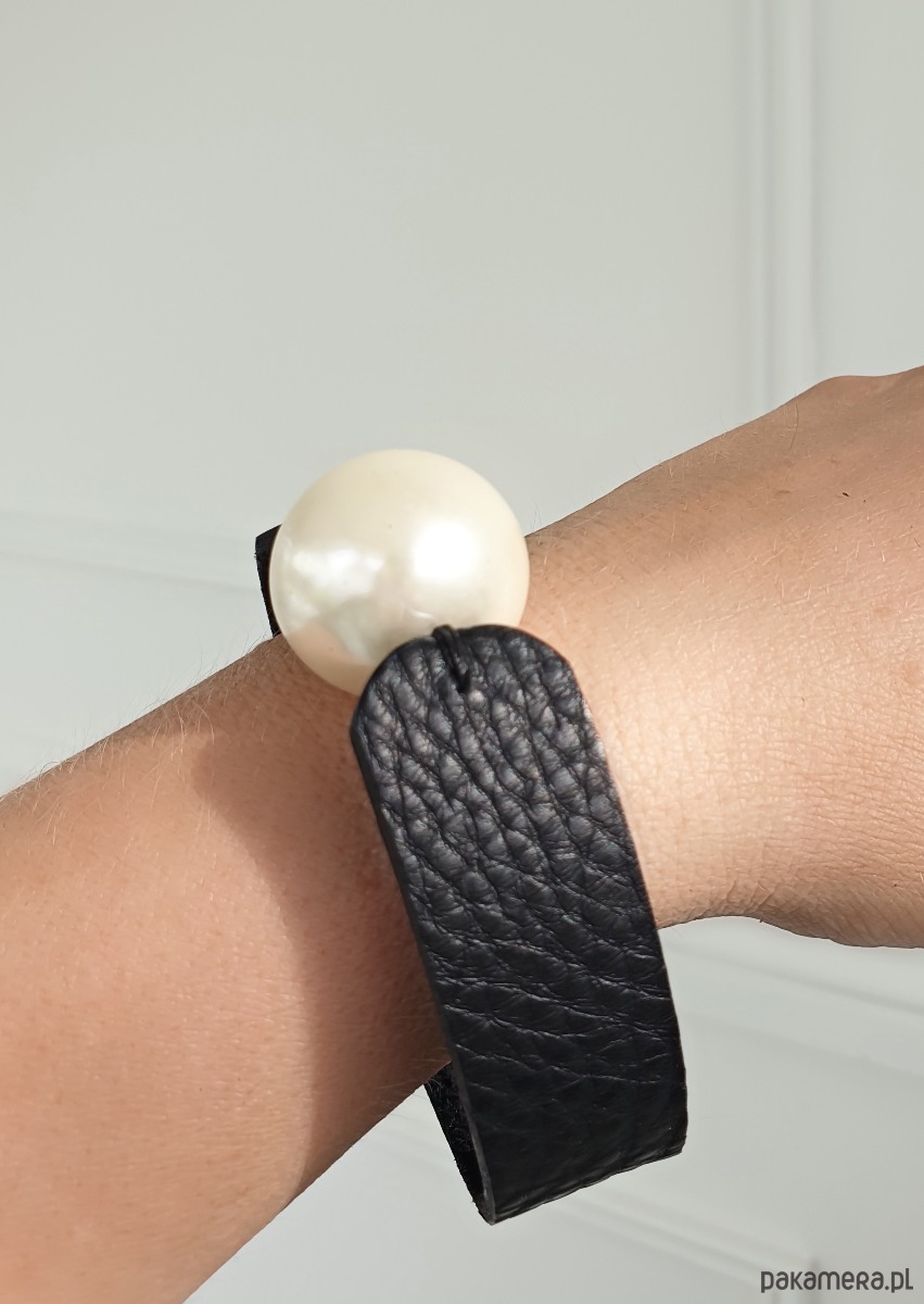 Wyjątkowa, awangardowa bransoletka ze skóry naturalnej. Duży rozmiar i oryginalny desig sprawiają, że jest to niebanalny dodatek do codziennej czy wieczorowej stylizacji. Baza bransoletki wykonana jest z czarnej skóry, łącznik to duża, sztuczna perła. Pierścionek wykonuje zgodnie z zamówionym rozmiarem (obwód palca). Bransoletka ze zdjęcia, również jest dostępna.