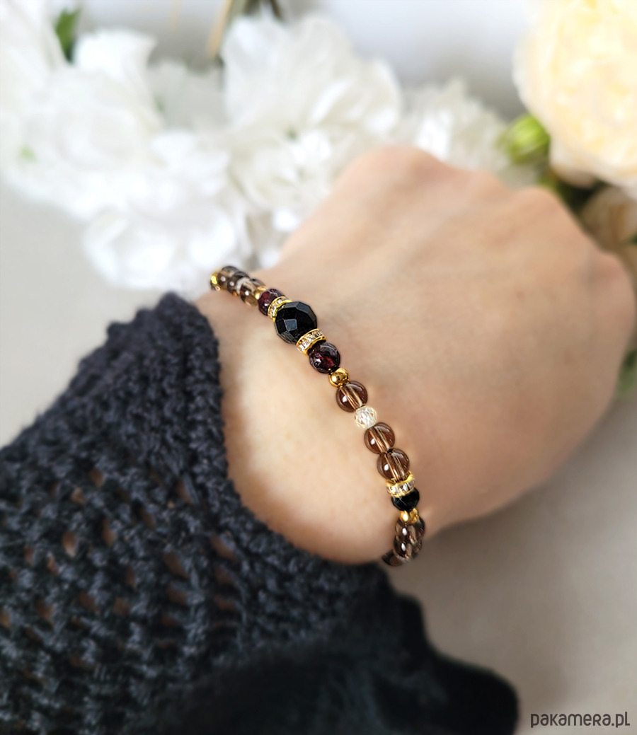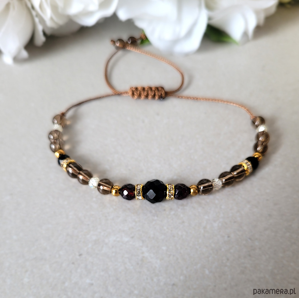 Damska bransoletka z kamieni naturalnych: Turmalinu, Granatu, Kwarcu dymnego oraz z Cyrkonii głównie przeznaczona dla zodiakalnego Barana.