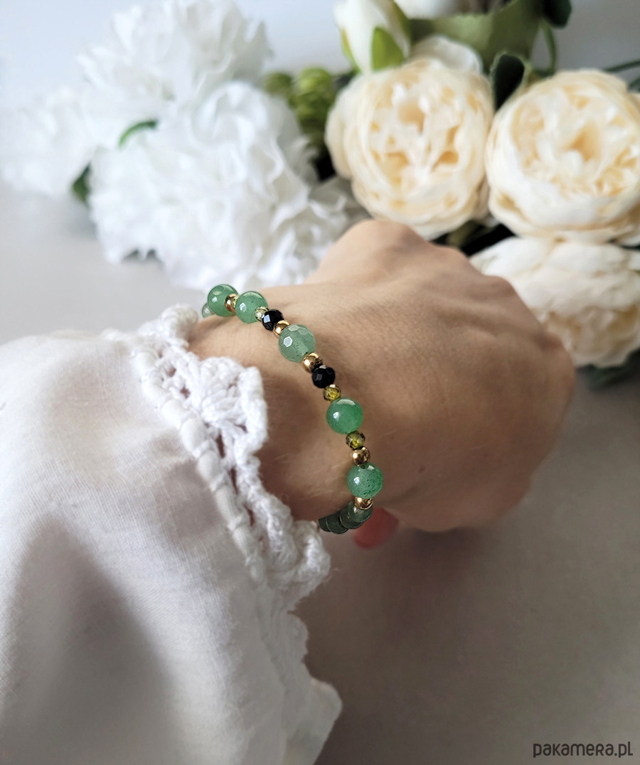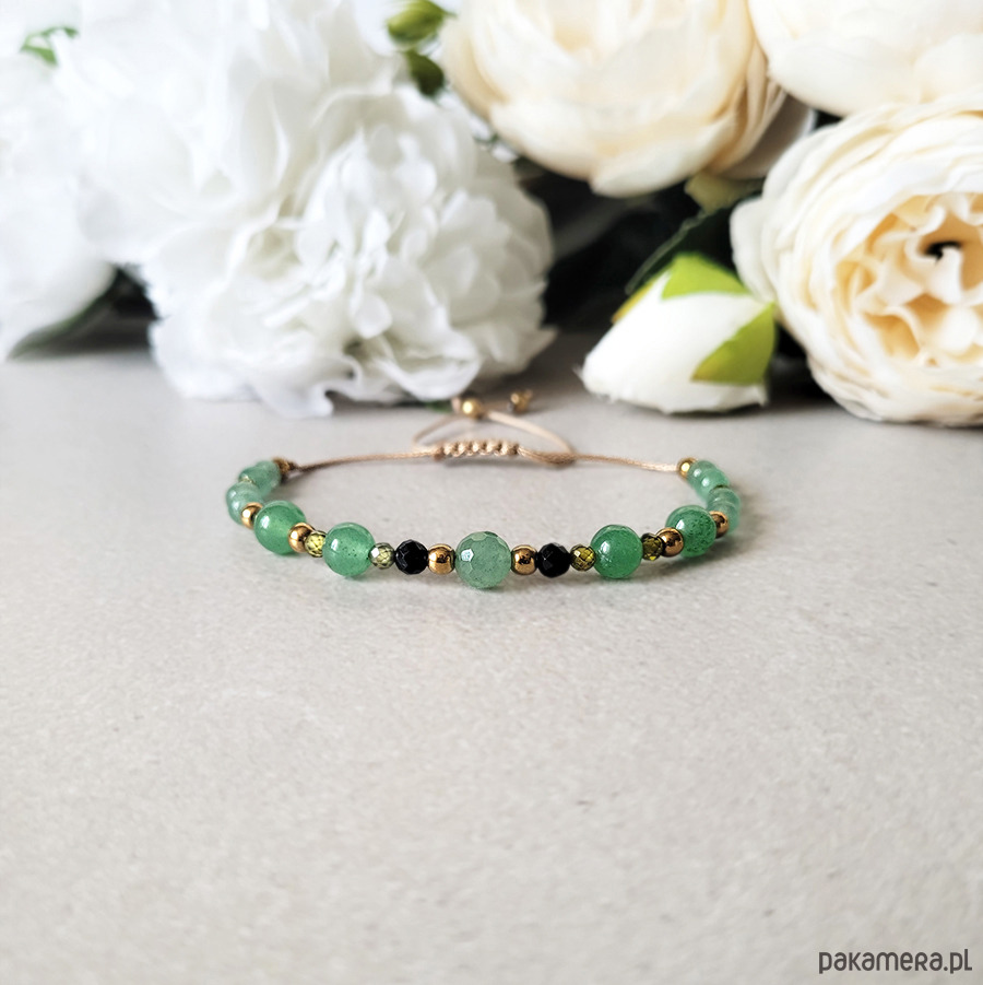 Bransoletka zrobiona z kamieni naturalnych: Awenturynu, Turmalinu, Hematytu oraz Cyrkonii głównie przeznaczona dla zodiakalnego Barana.