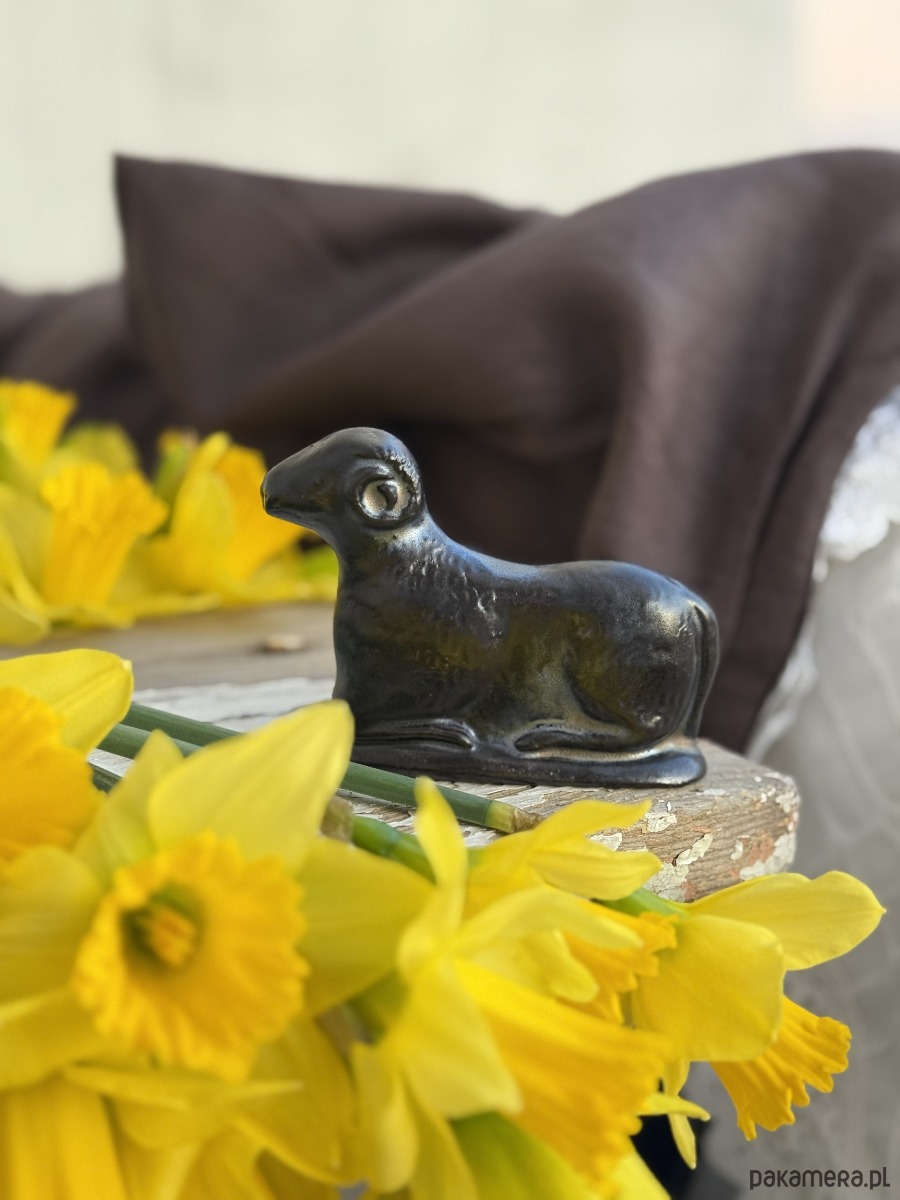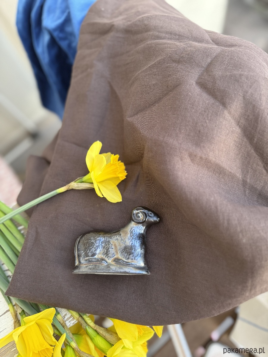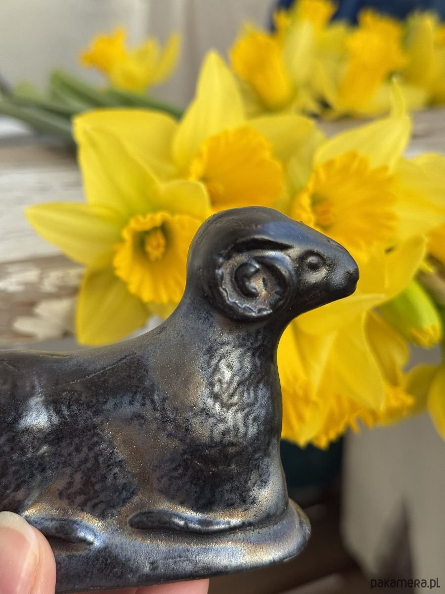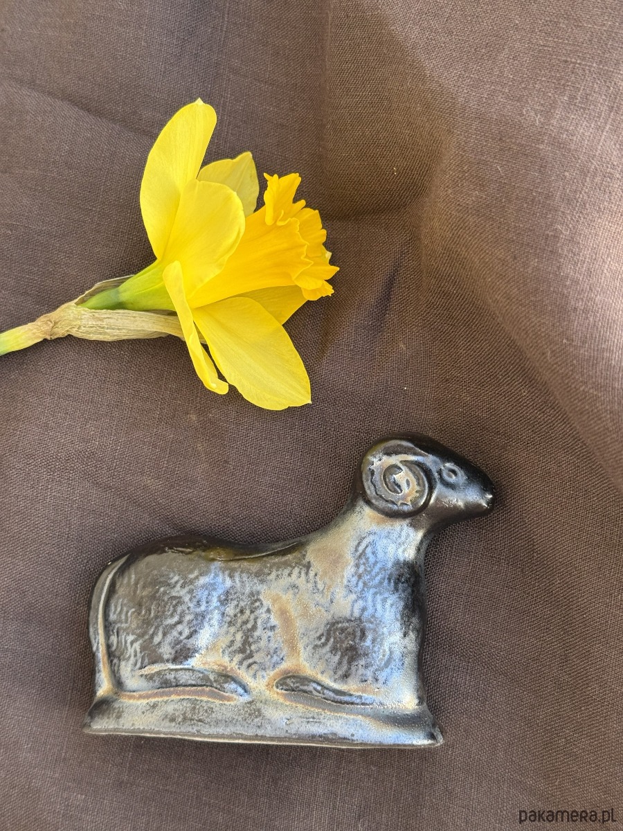 Ręcznie wylepiany i szkliwiony baranek powstał z chęci połączenia starego z nowym.