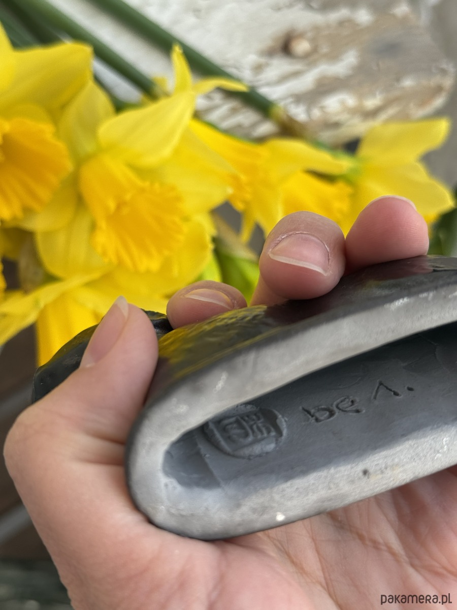 Później pędzelkiem nanoszę szkliwo tutaj czarne i wypalam w temperaturze 1050stopni C, co dodaje trwałości.