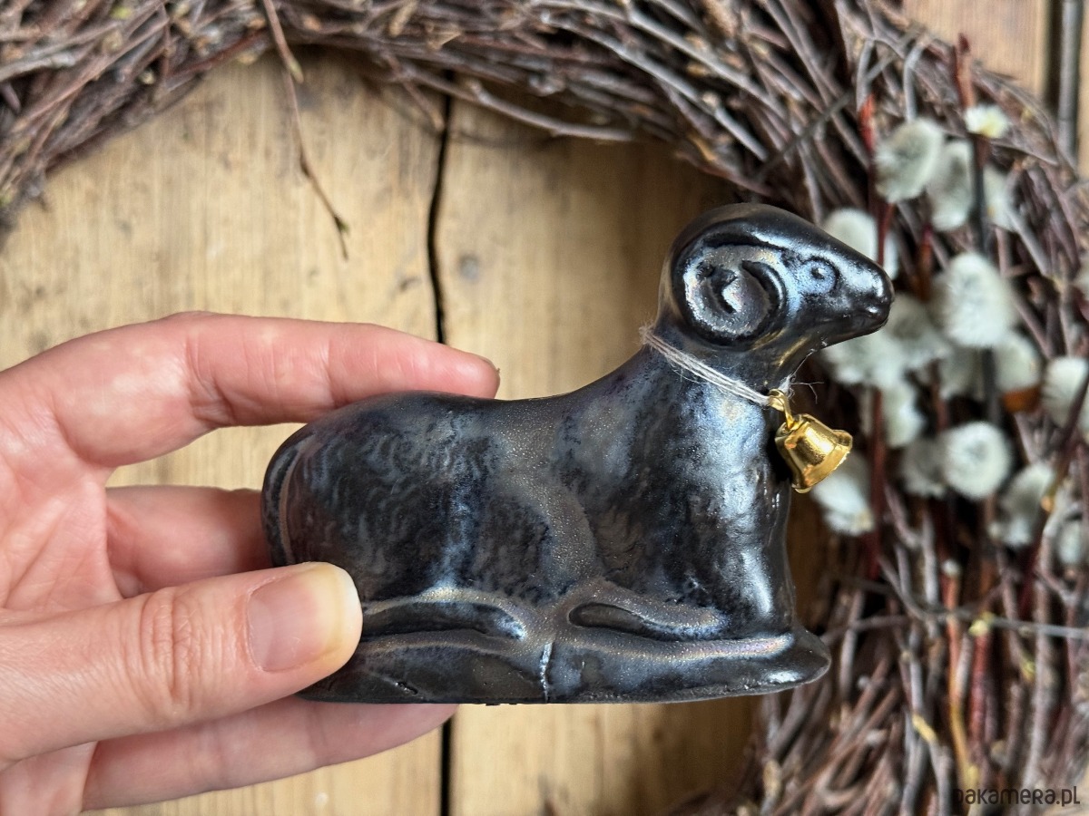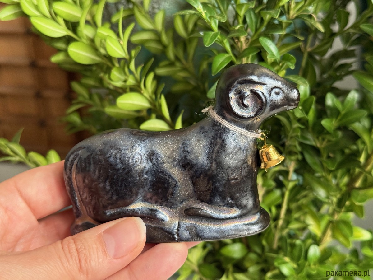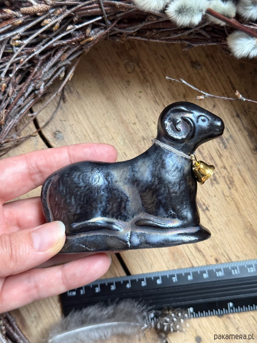 Kupując baranka z tej aukcji, kupujesz dokładnie tego, który jest na zdjęciu — ten jest szkliwiony na złoto-czarny kolor — nierównomierny zamierzony efekt.