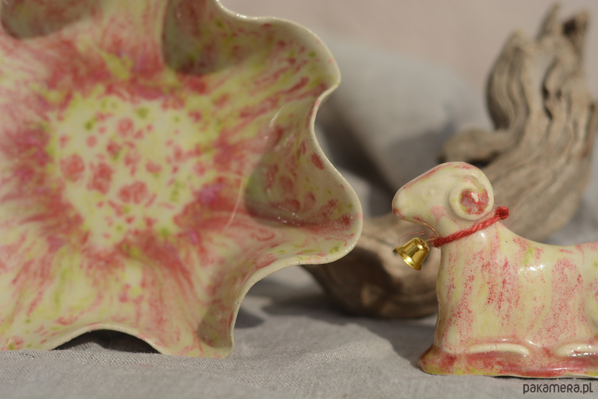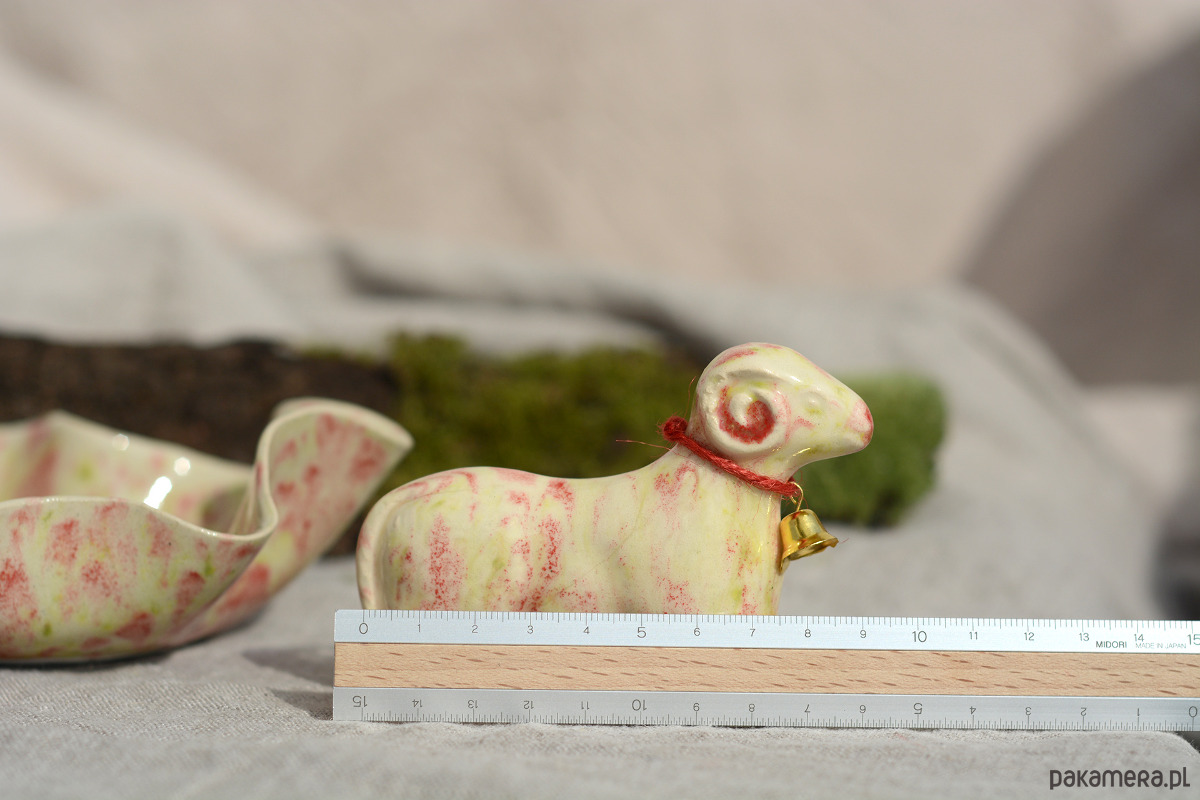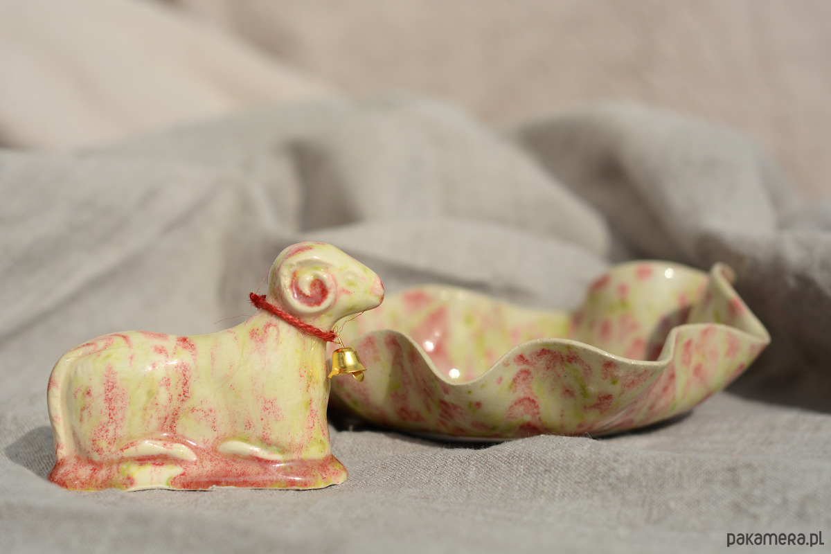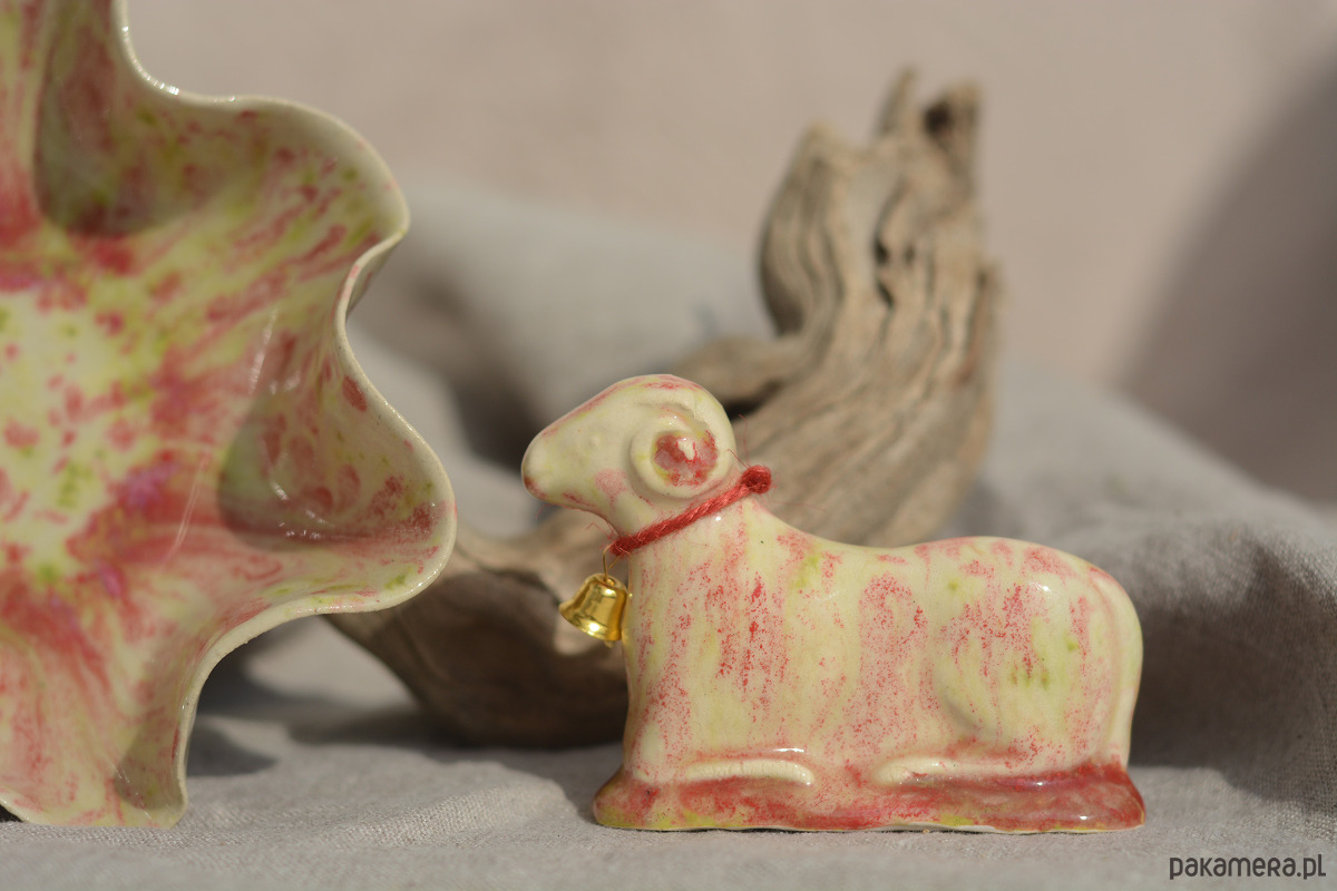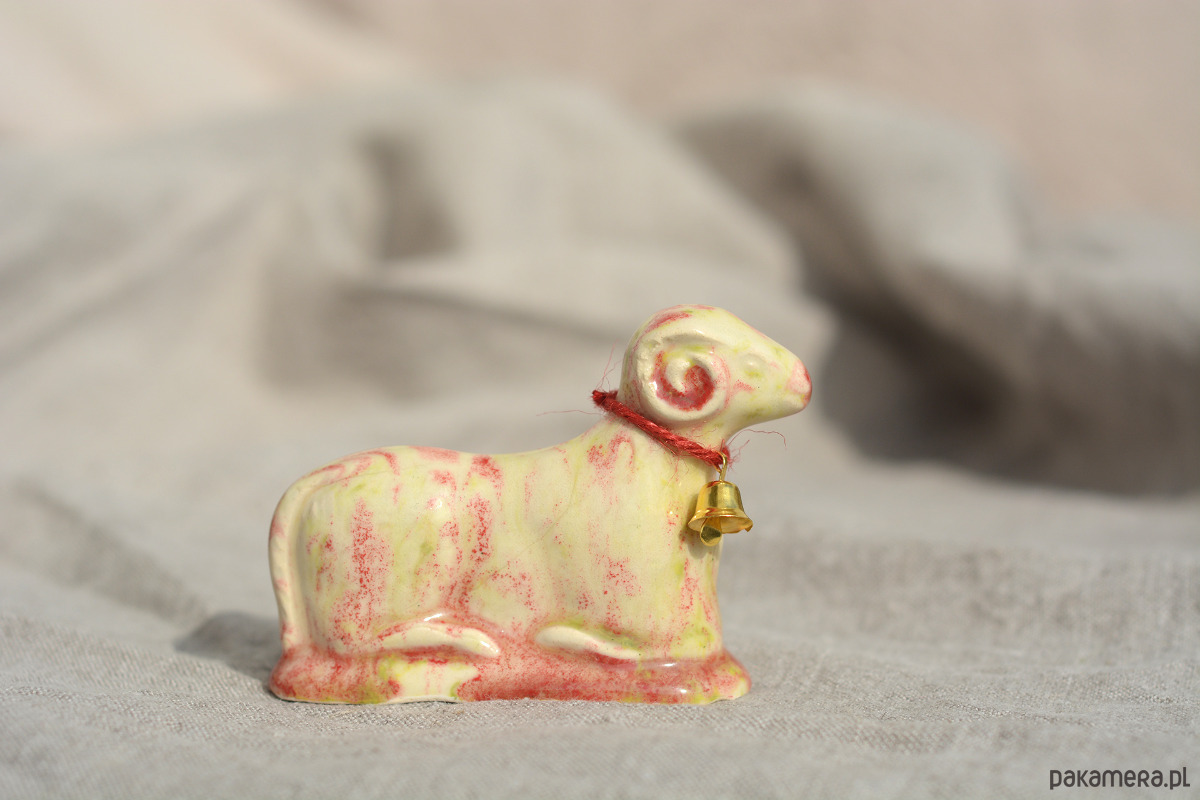 Ręcznie wylepiany i szkliwiony baranek powstał z chęci połączenia starego z nowym.