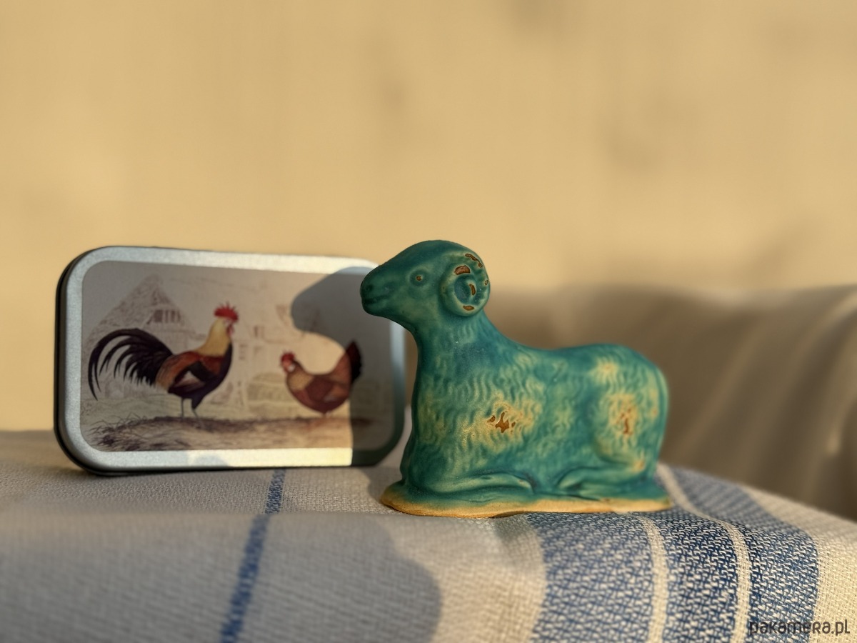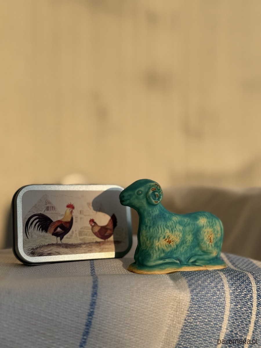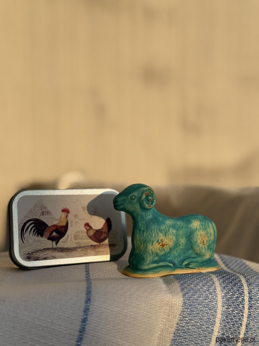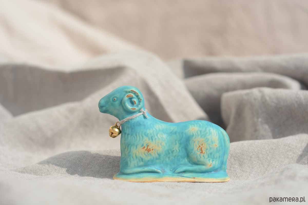 Ręcznie wylepiany i szkliwiony baranek powstał z chęci połączenia starego z nowym.