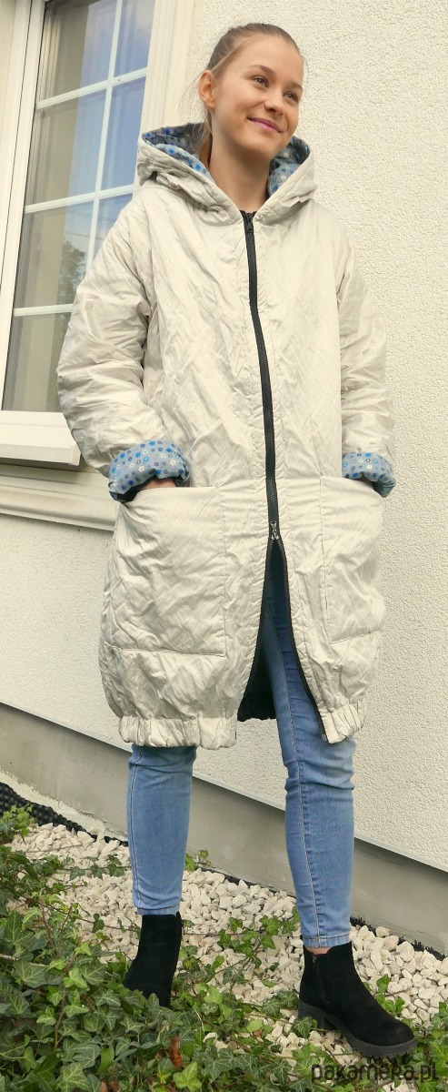 Podszewka bawełniana, wyłożenie kaptura i wykończenie rękawów bawełna we wzorki.