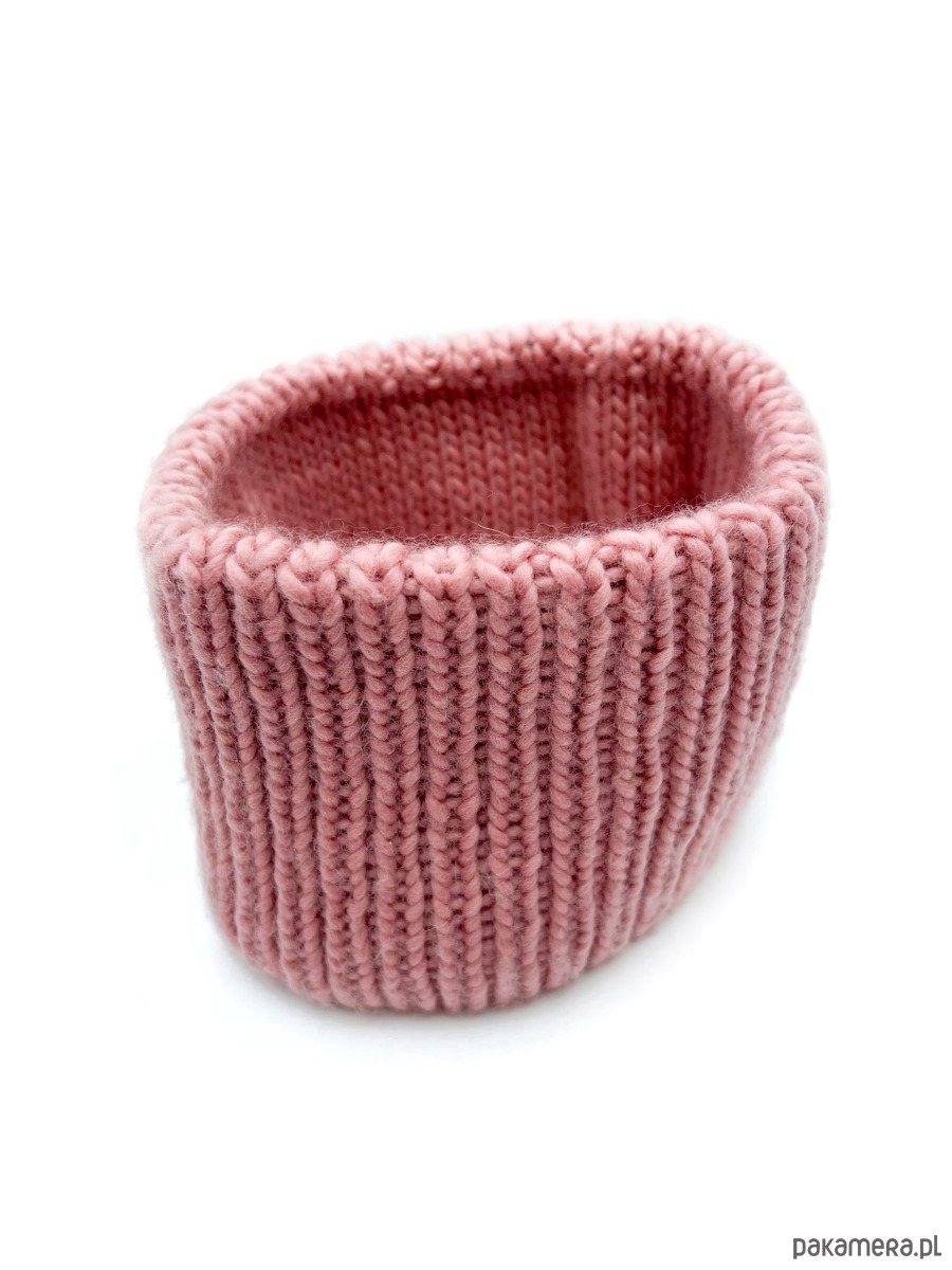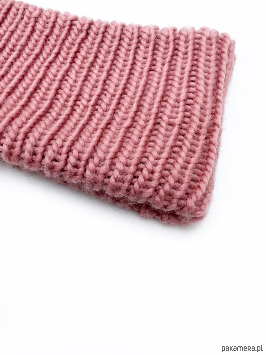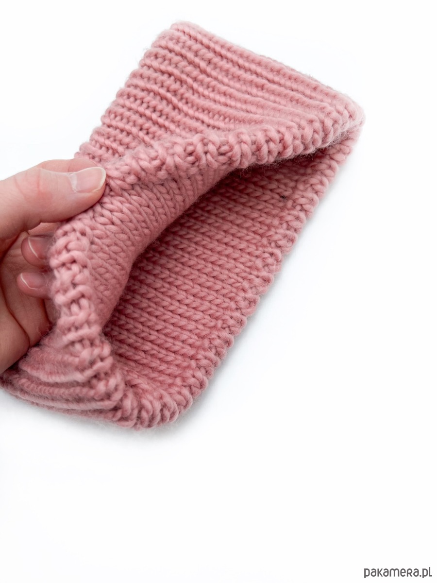 Różową opaskę merino stworzyłam na drutach z podwójnej warstwy wełny merynosa peruwiańskiego.