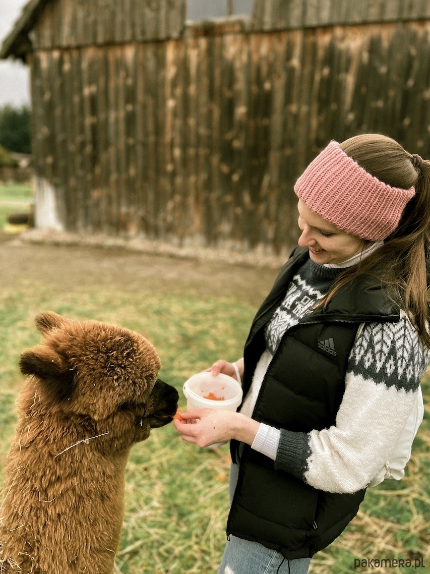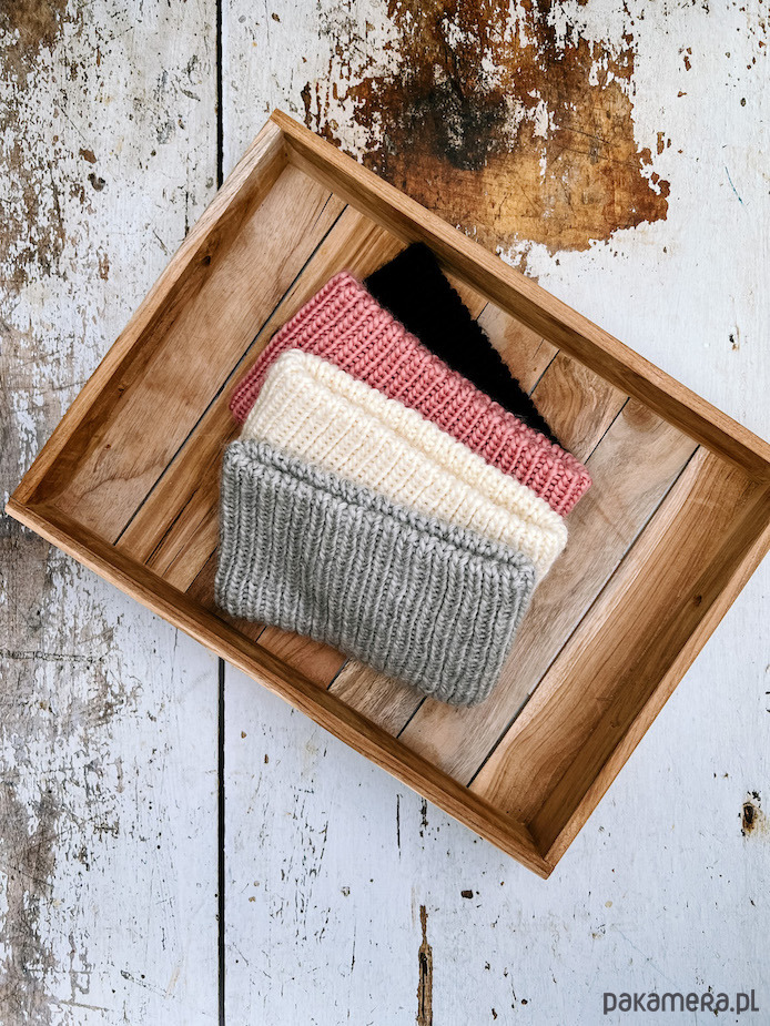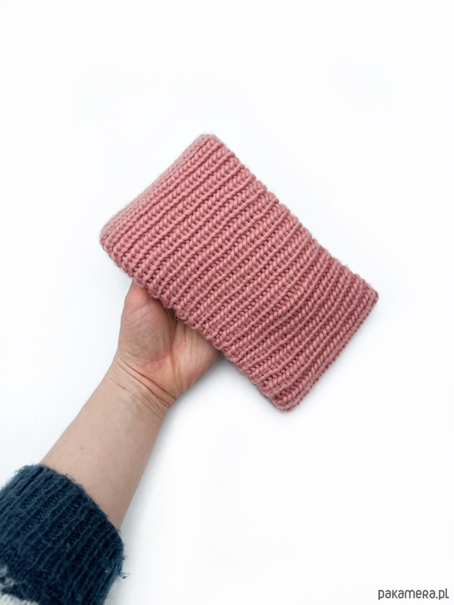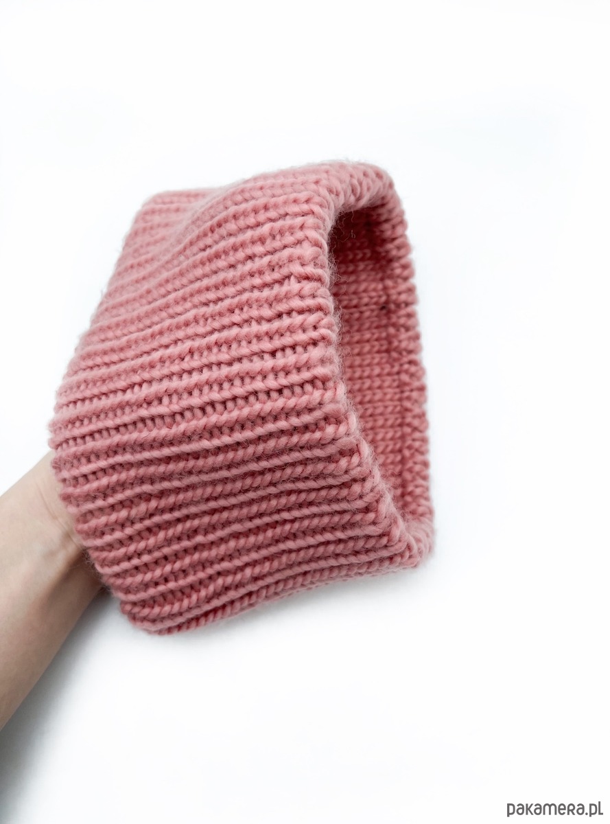 Różową opaskę merino stworzyłam na drutach z podwójnej warstwy wełny merynosa peruwiańskiego.