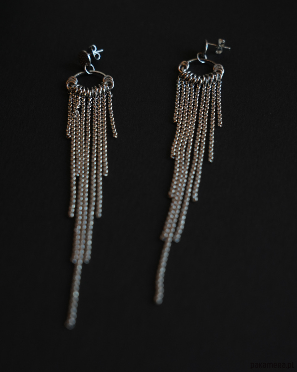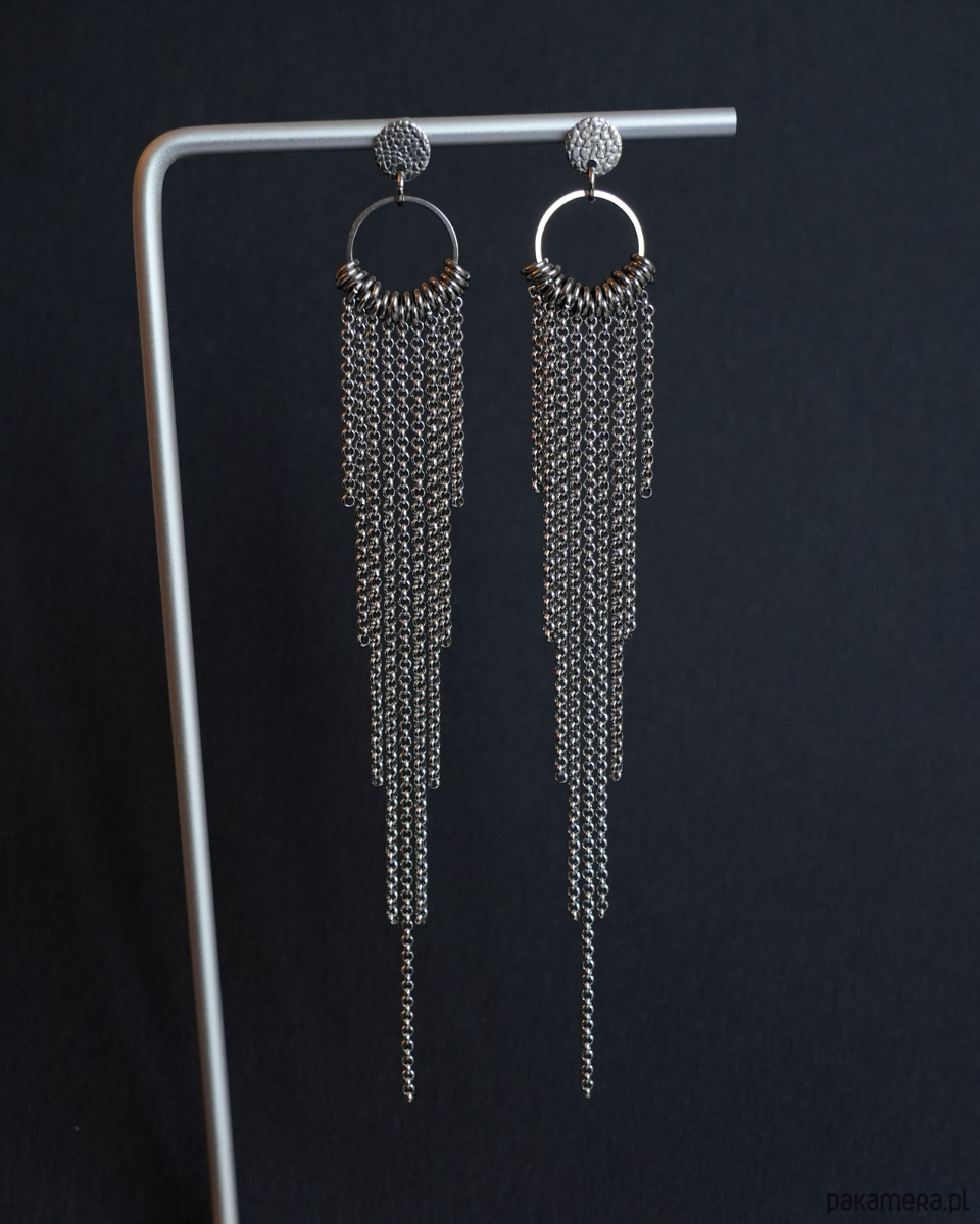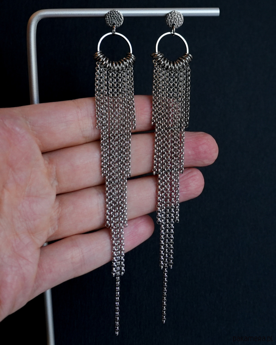 Bardzo efektowne i bardzo długie kolczyki z łańcuszka typu rolo, w całości wykonane ze stali szlachetnej. Extra dodatek na imprezę, ale też do noszenia na co dzień. Dla kobiet, które lubią wyrazistą i rzucającą się w oczy biżuterię.