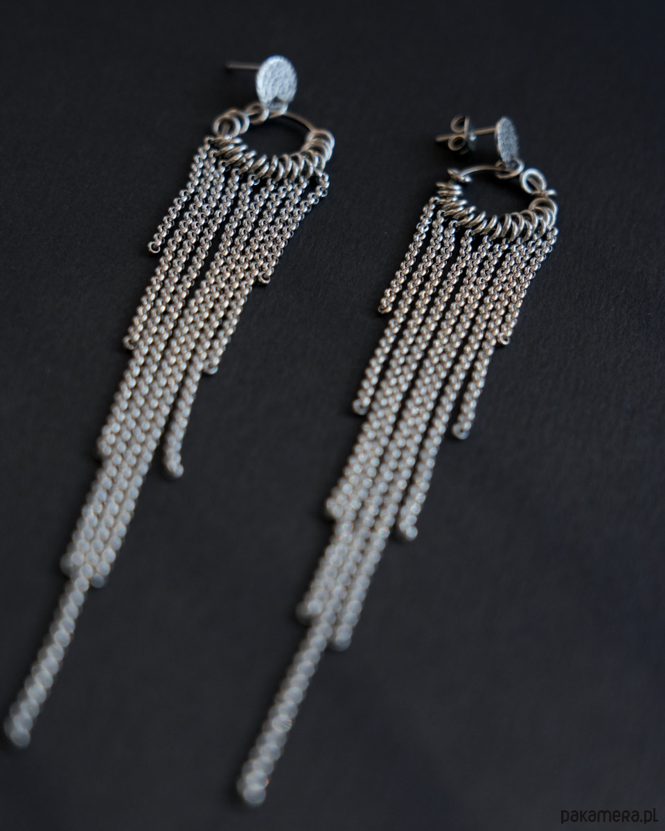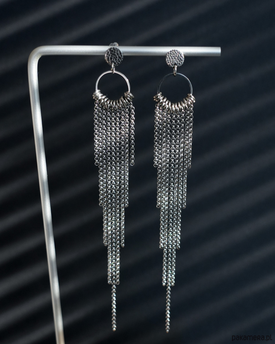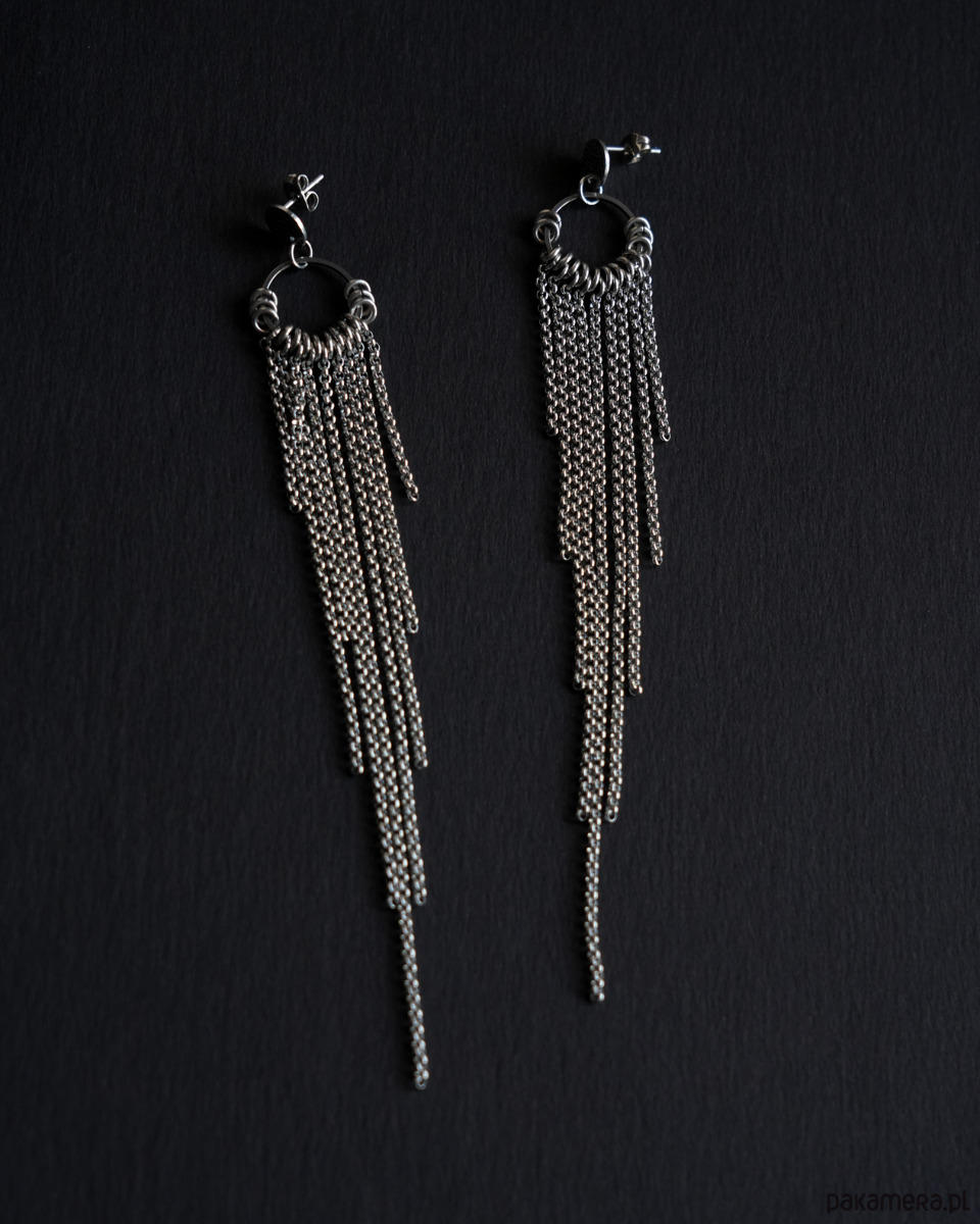 Bardzo efektowne i bardzo długie kolczyki z łańcuszka typu rolo, w całości wykonane ze stali szlachetnej. Extra dodatek na imprezę, ale też do noszenia na co dzień. Dla kobiet, które lubią wyrazistą i rzucającą się w oczy biżuterię.