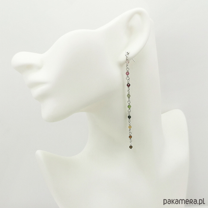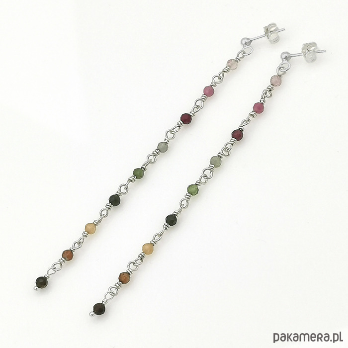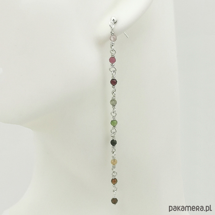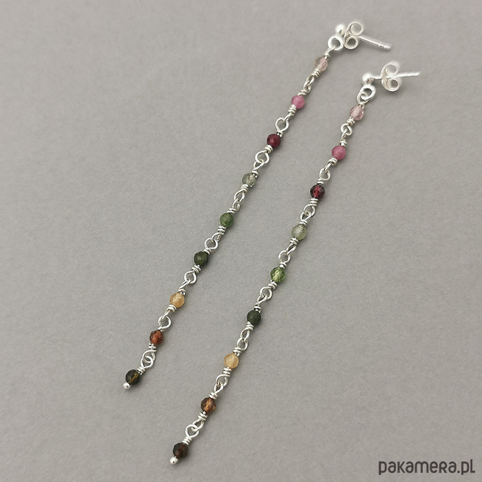Długie, delikatne kolczyki ze srebra próby 925 z kolorowymi turmalinami. Na wygodnych biglach, sztyftach